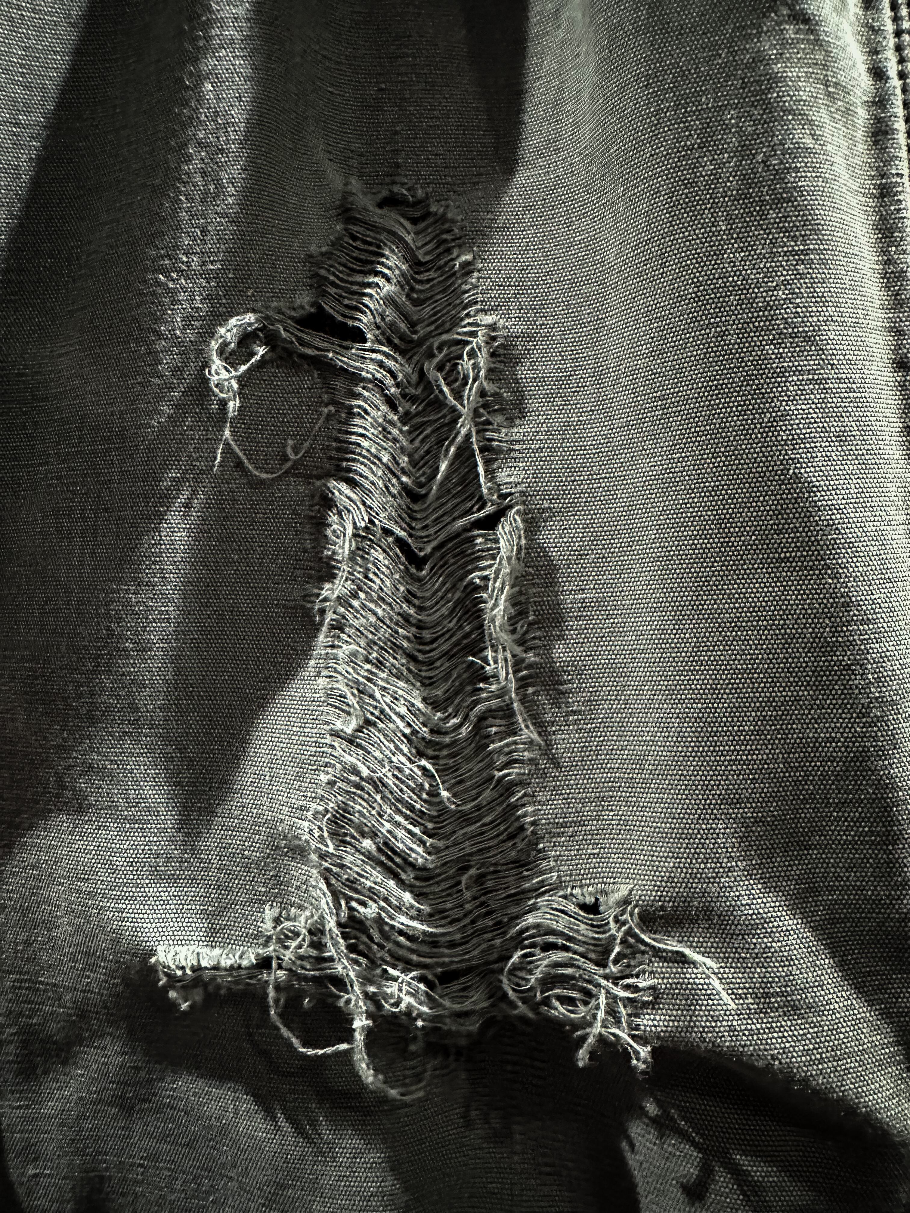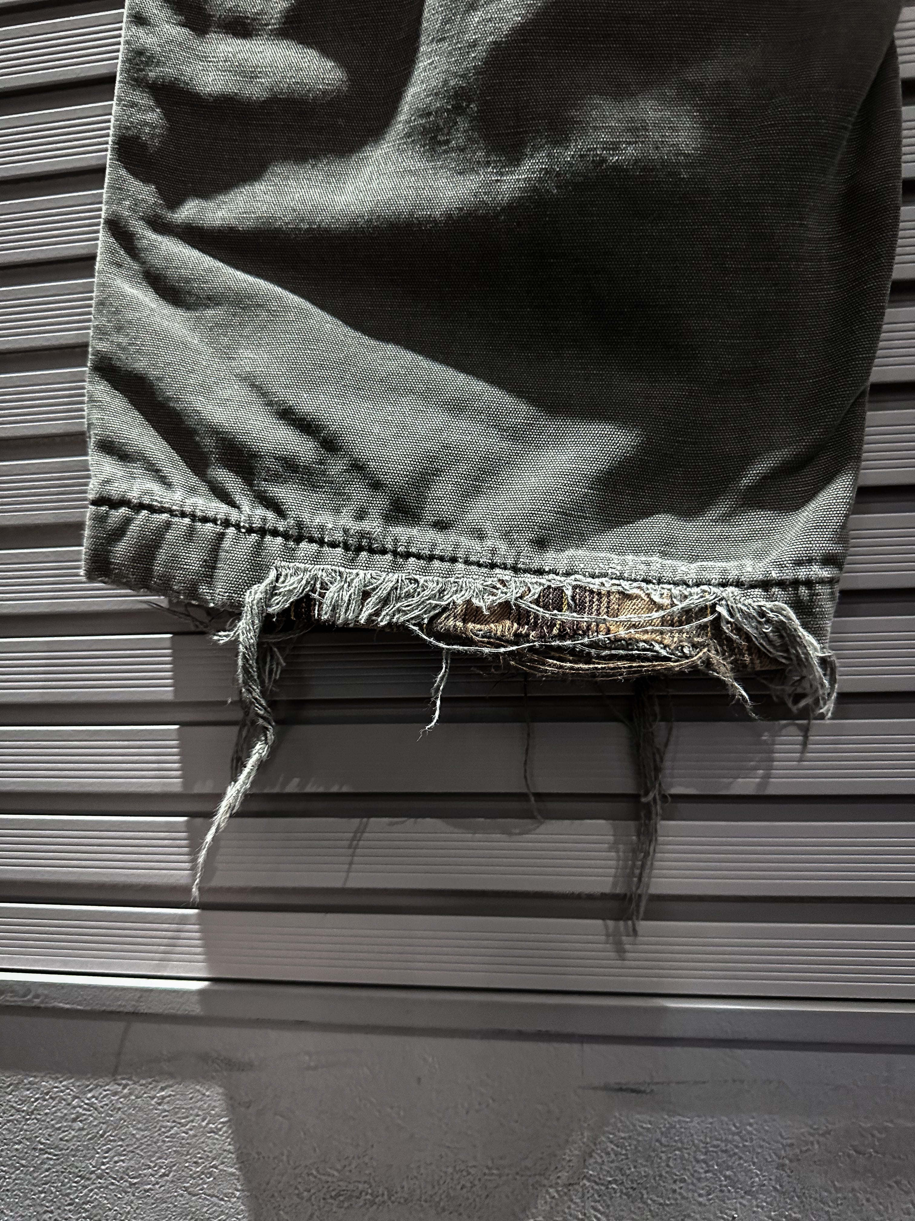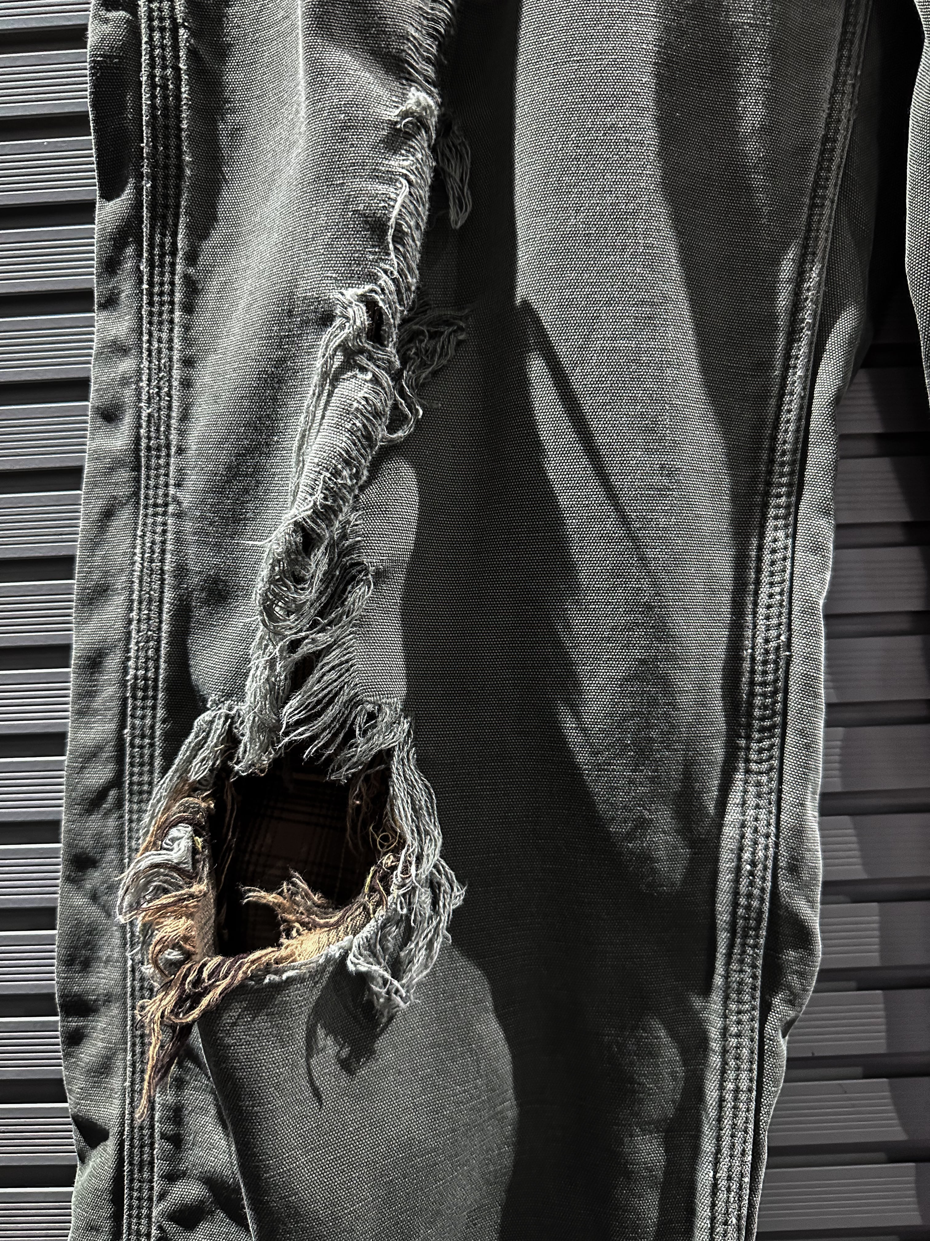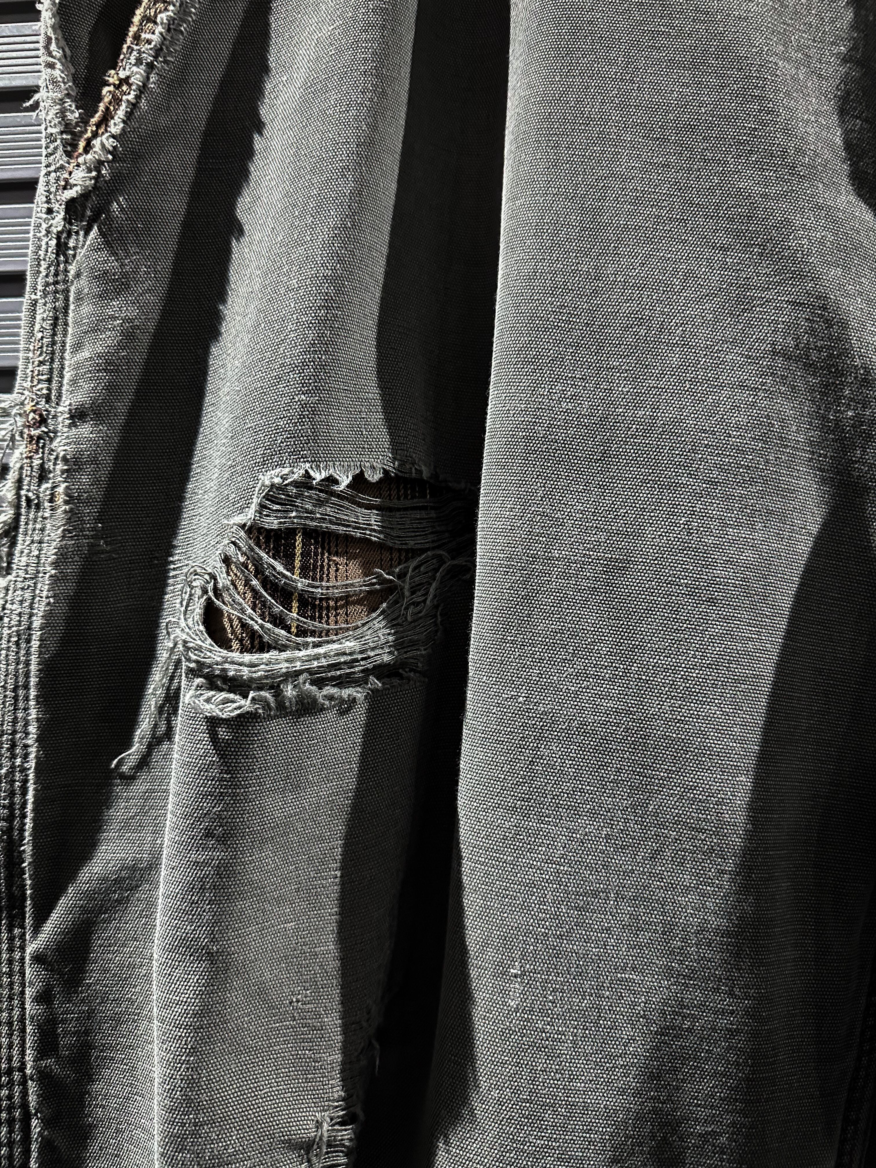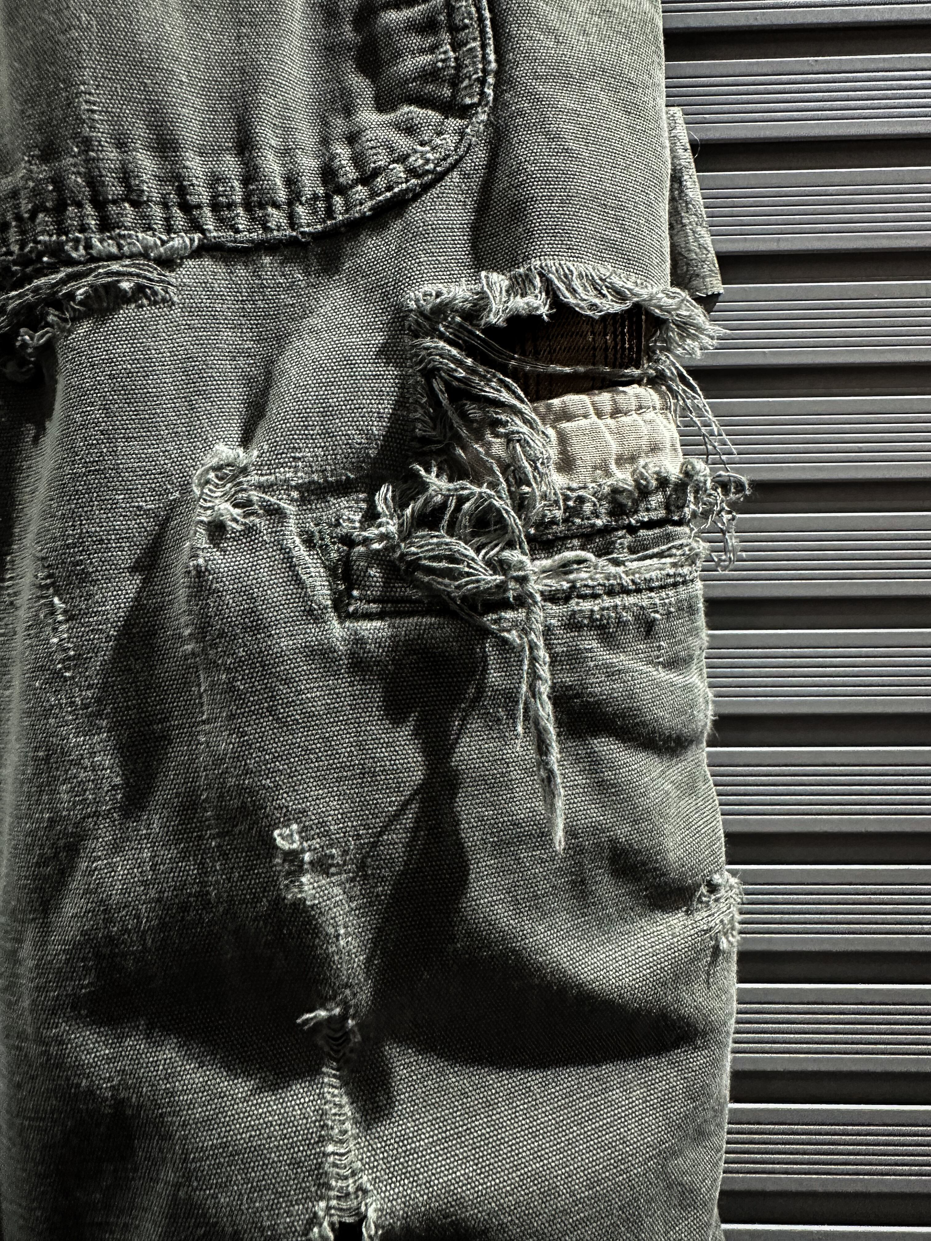 経年変化による美しいフェードの効いたダック地をボディに使用し、大胆なダメージ加工を施したペインターパンツ。