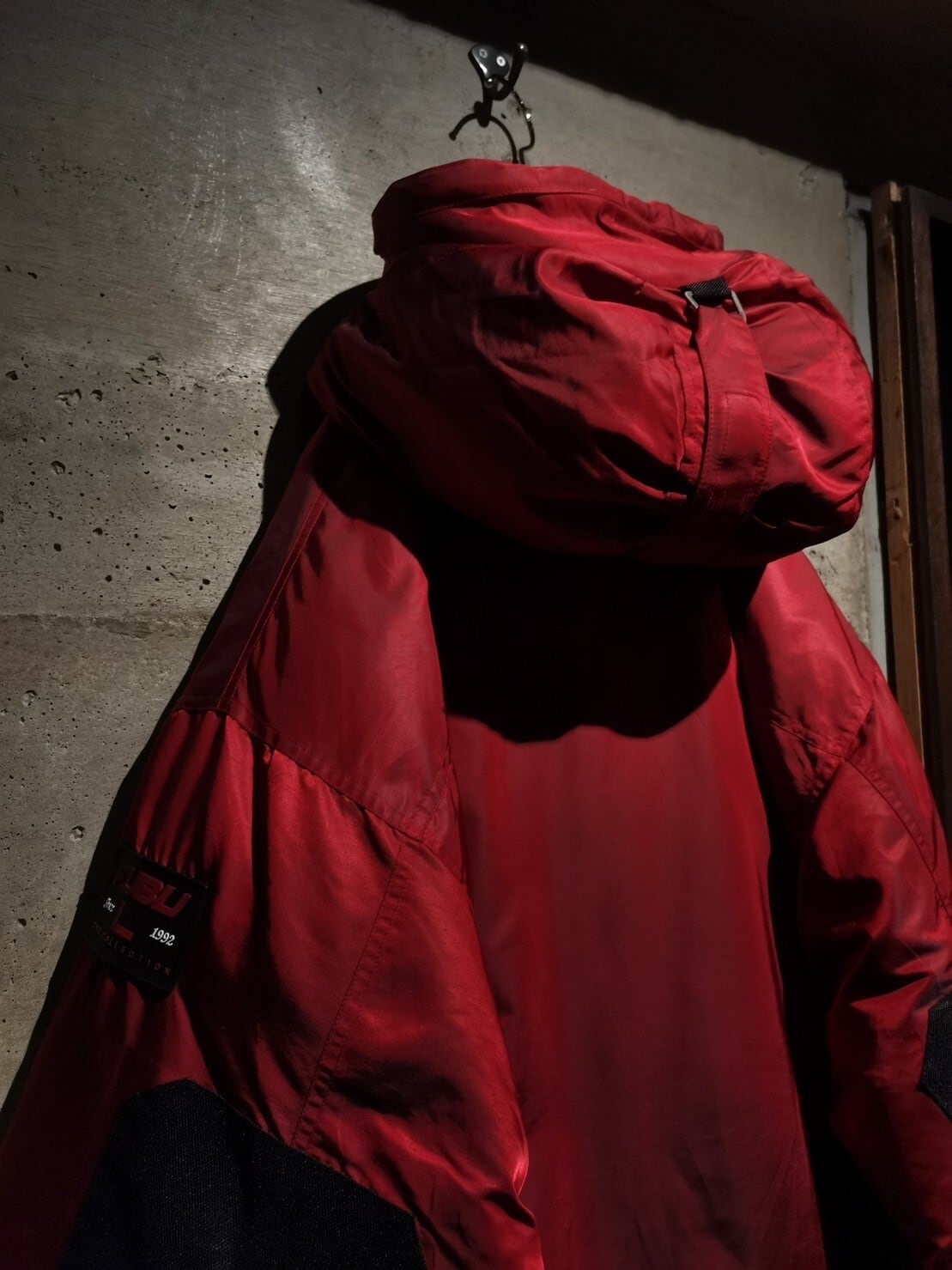 鈍い光沢を放つメタリックな赤色のボディをベースに、多種多様なギミックを載せたダウンジャケット。