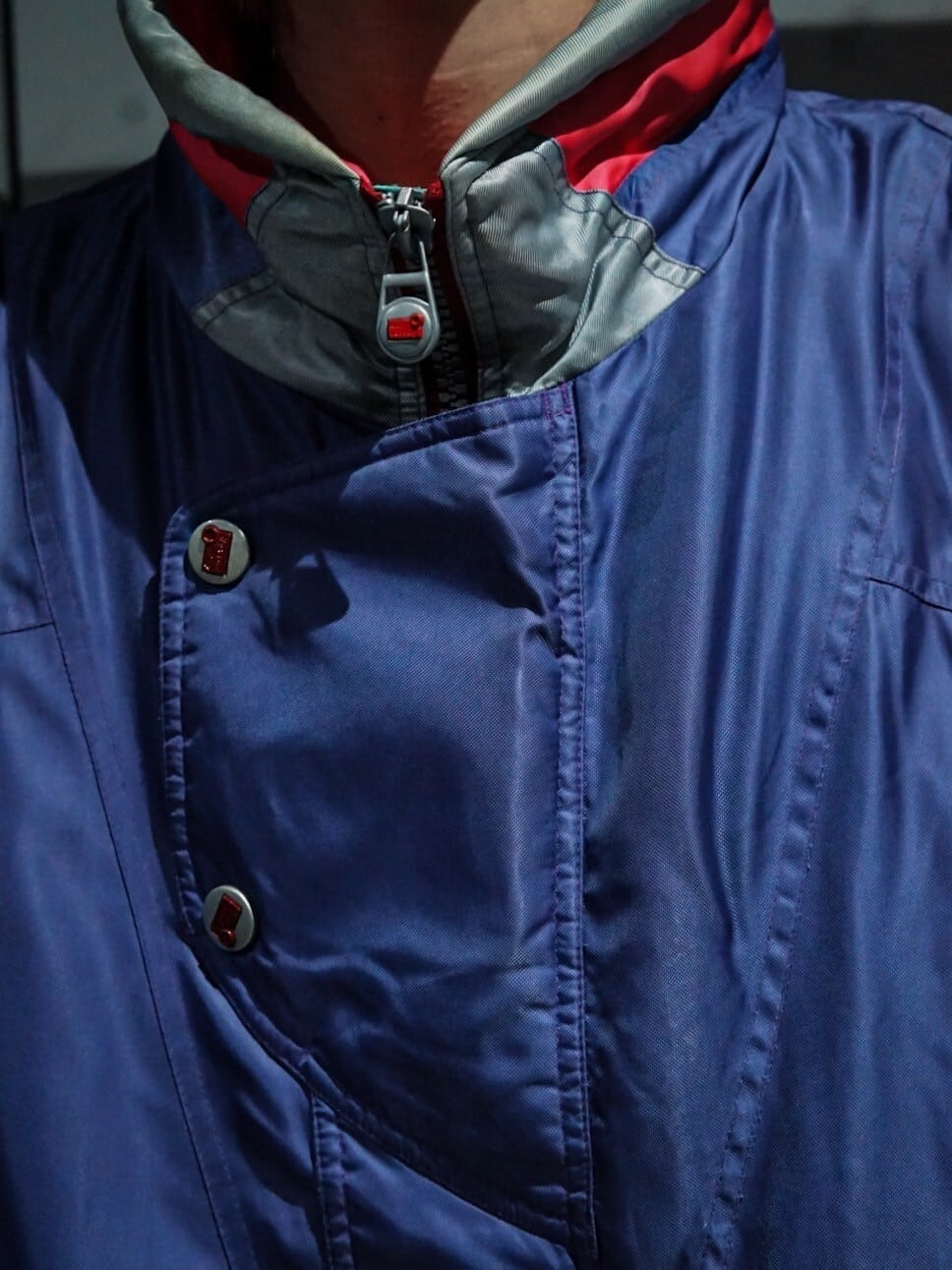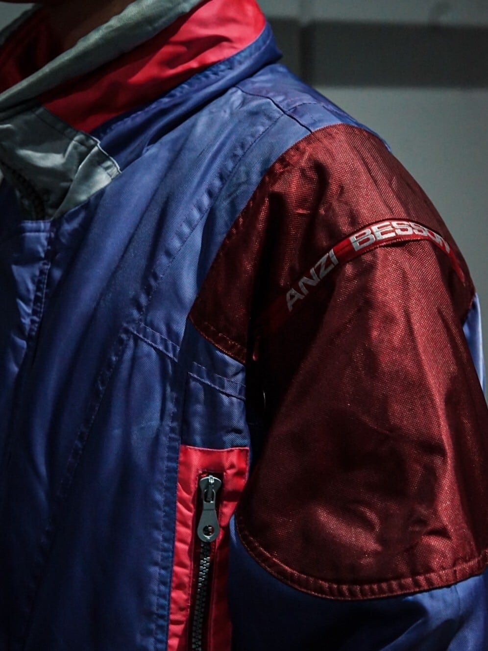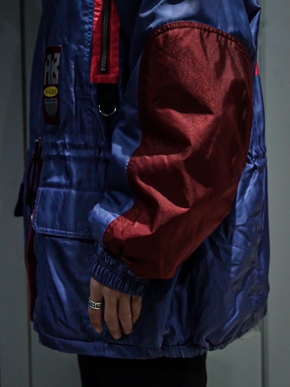 ブラックカラーをベースとし、随所にブルーやシルバーの色切り替えを載せたギアジャケット。