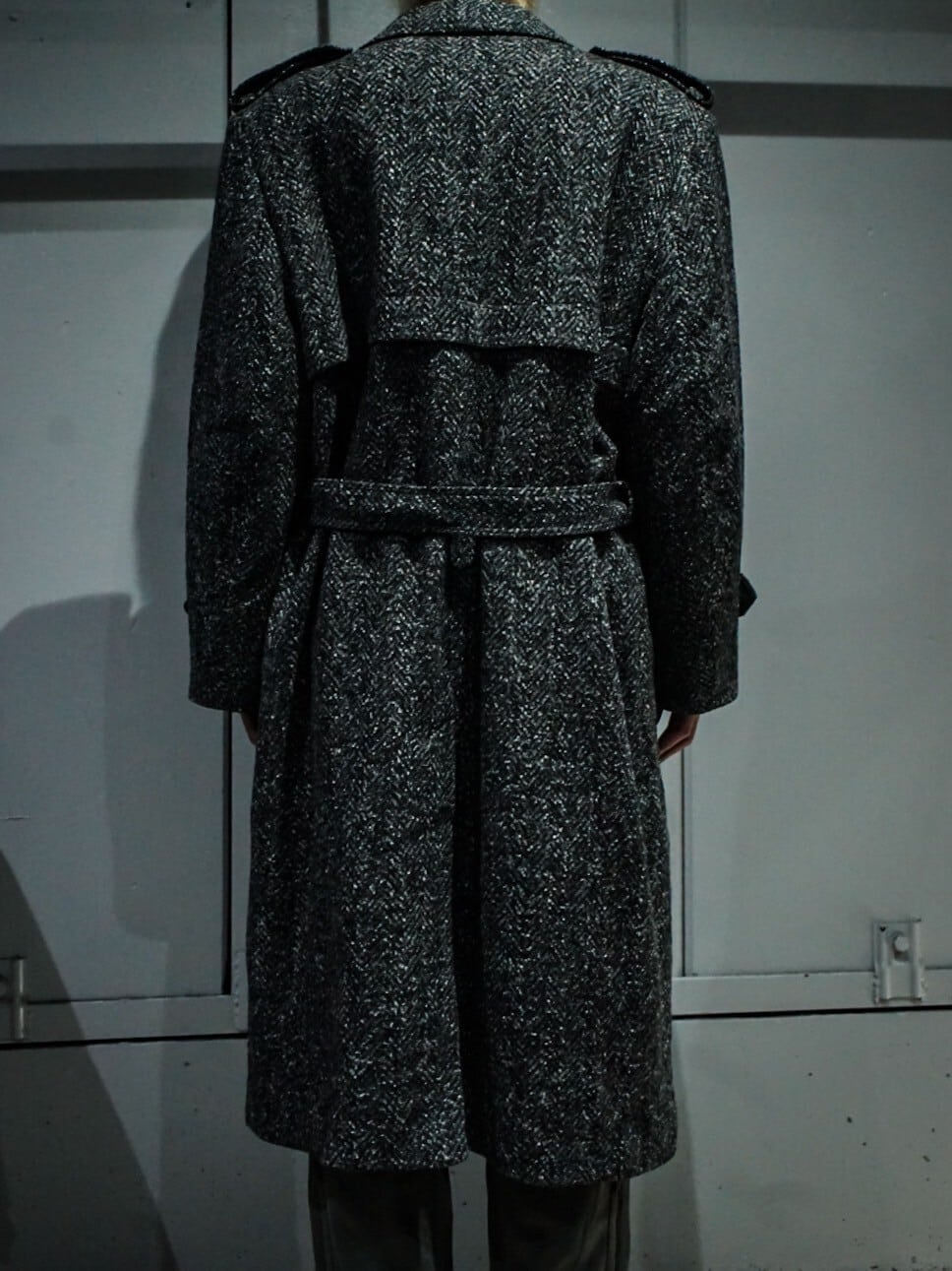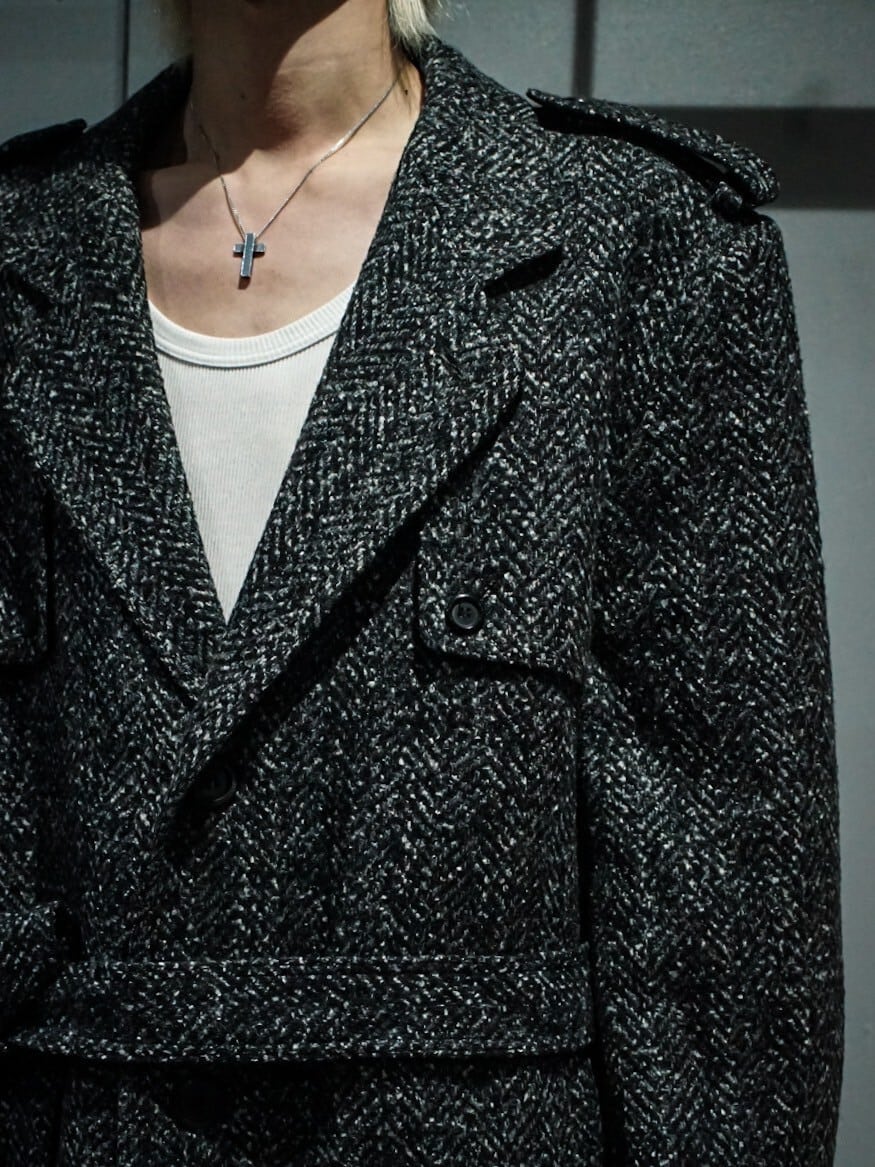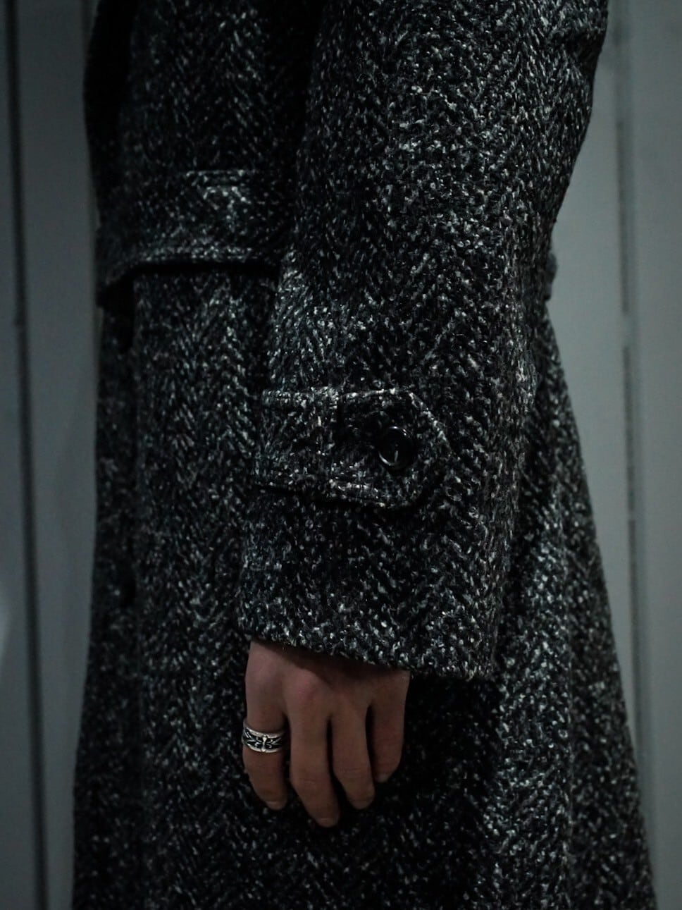 黒×白のモノトーンのカラーリングで、上質かつタフなツイードの全体を仕上げたツイードトレンチコート。