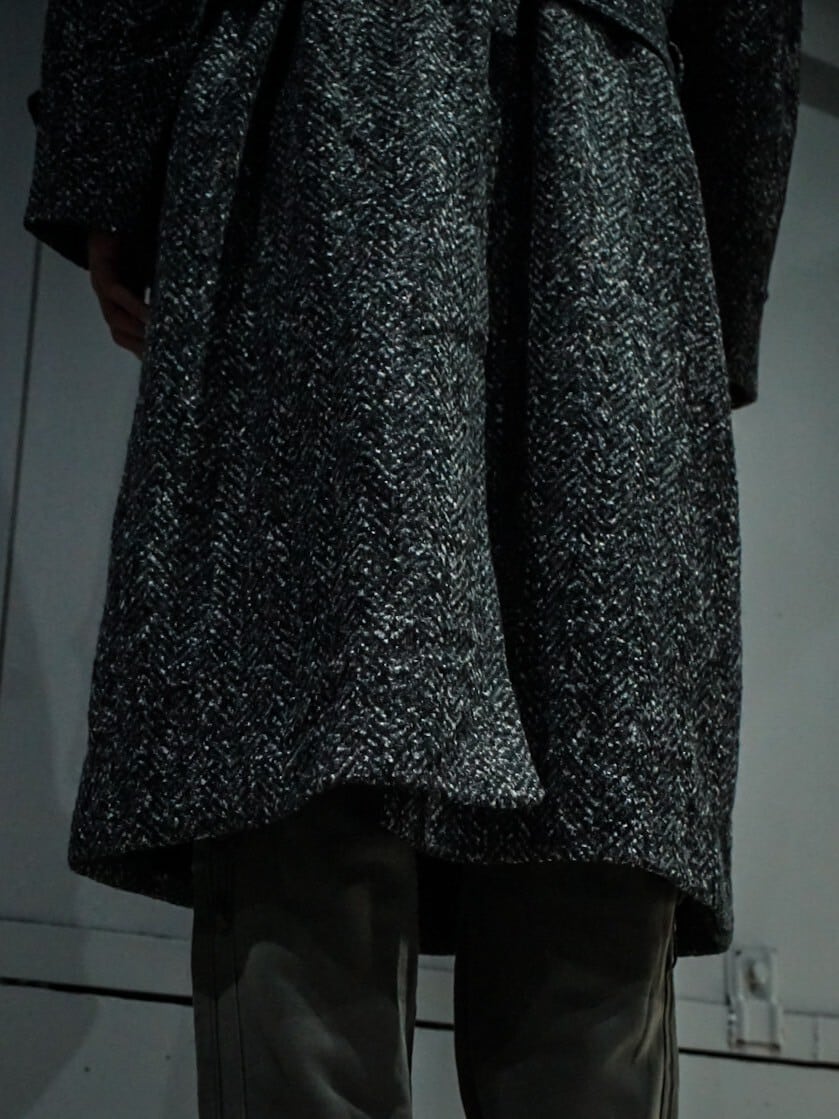 シングルブレストの仕立てで仕上げられたフロントに、トレンチならではのギミックを載せ、重厚感のあるツイードの表情が掛け合わさることによって生み出された、風格漂う佇まいが非常に美しいですね…