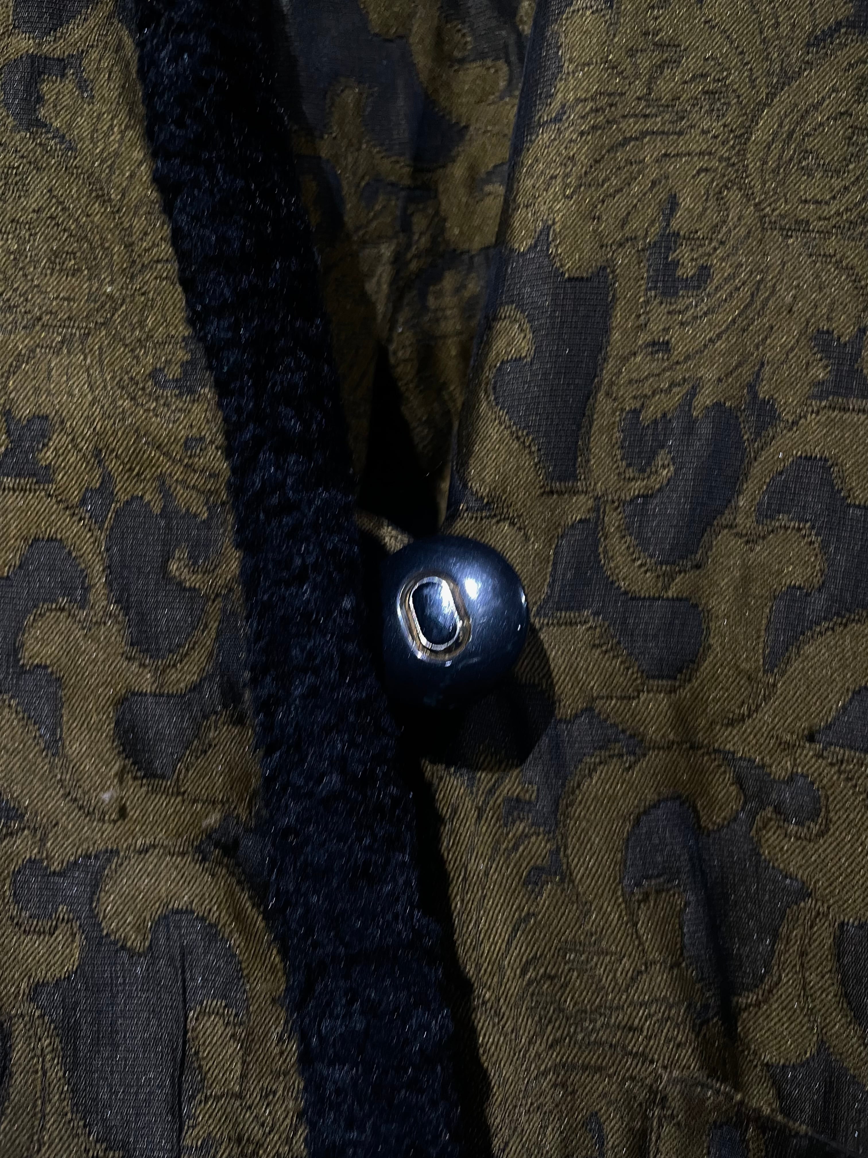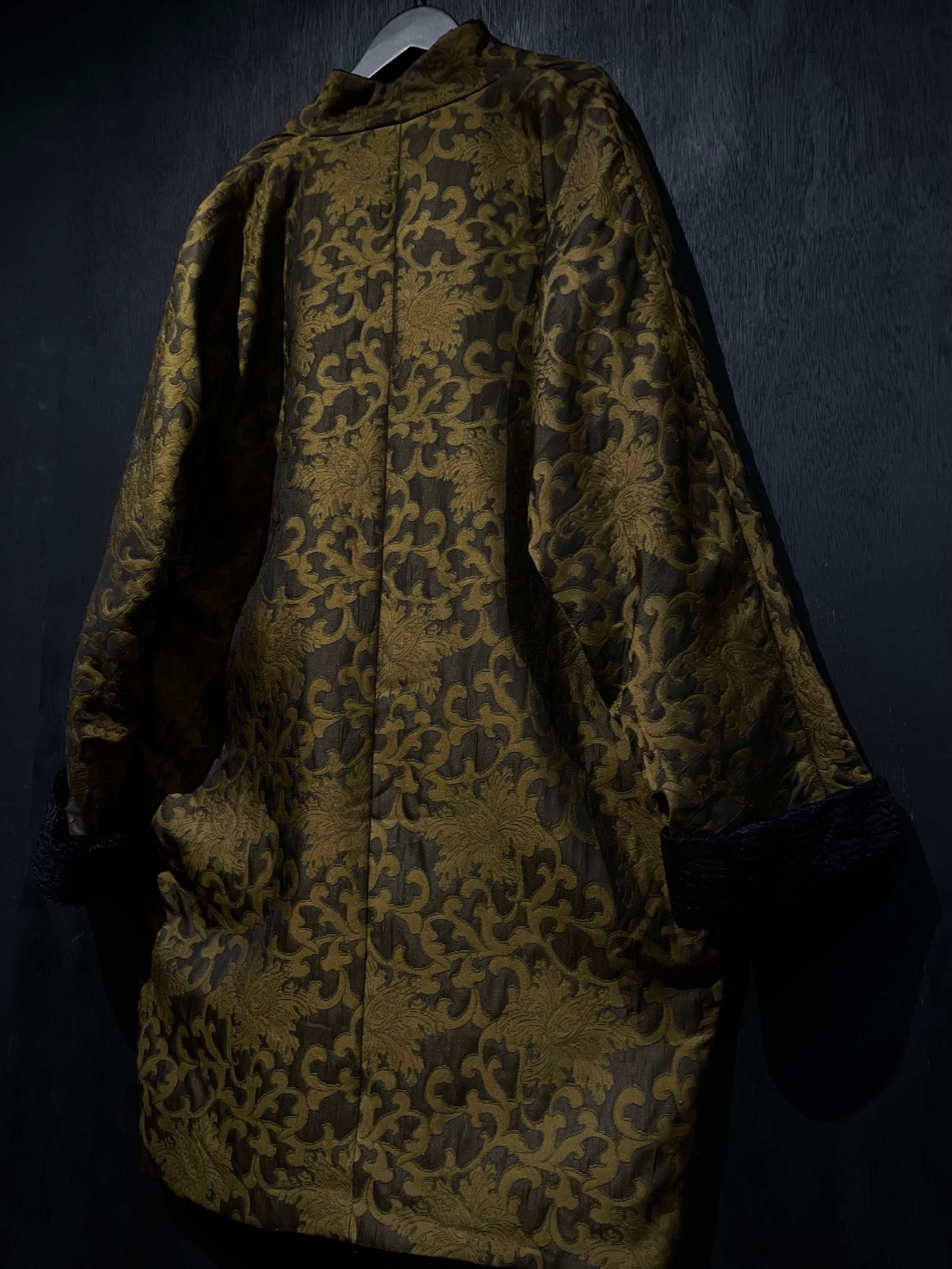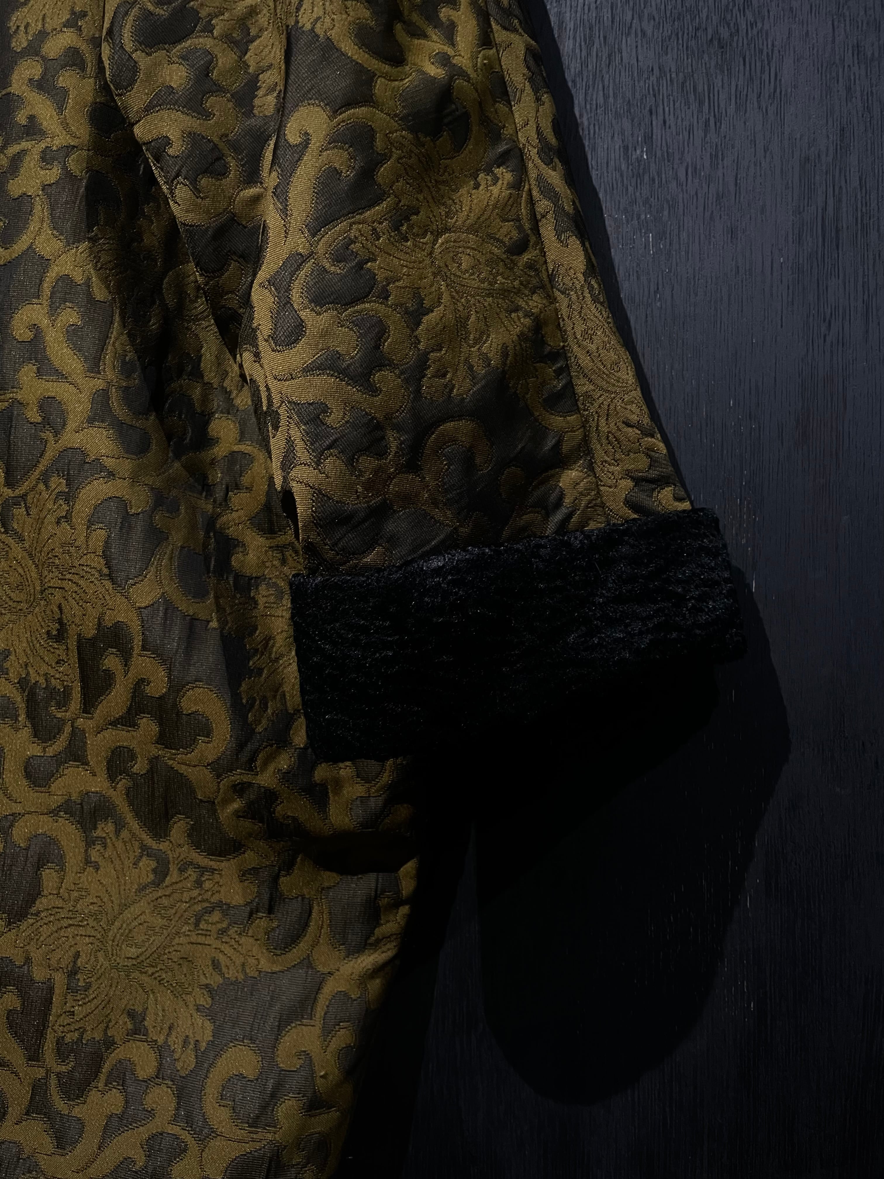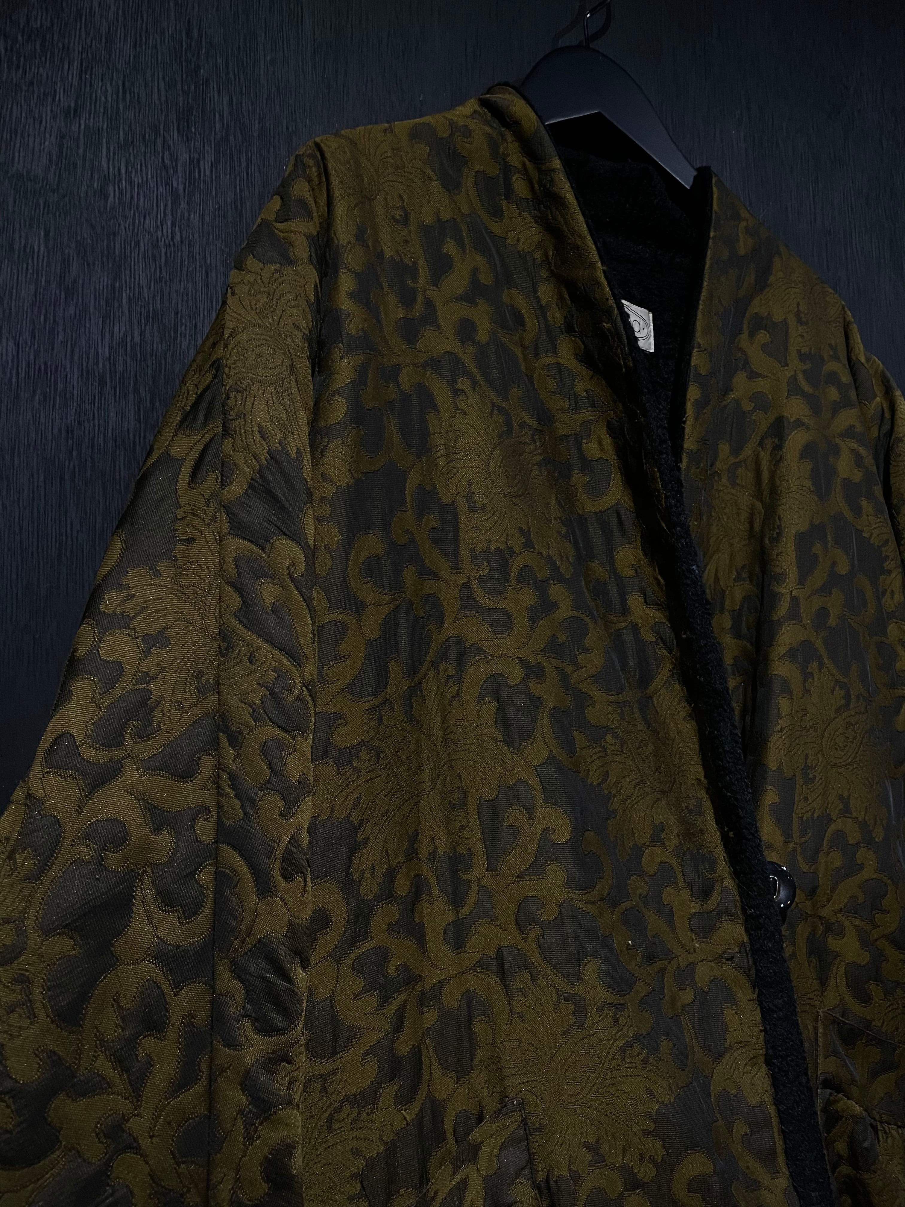 フワッと柔らかな素材をベースに、上質なジャガード織りで非常〜に緻密で繊細なダマスク柄を織り成したロングジャケット。