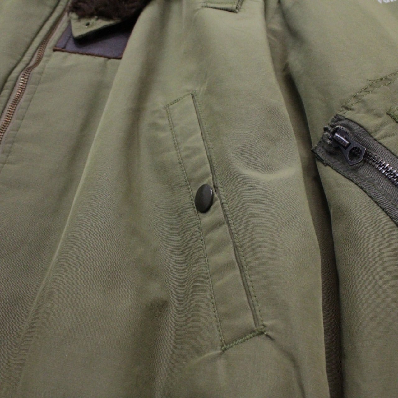 襟元の大ぶりなフェイクファーやキュッとしまったフライトジャケットらしいシルエット、ディテールを随所に載せたフライトジャケット。