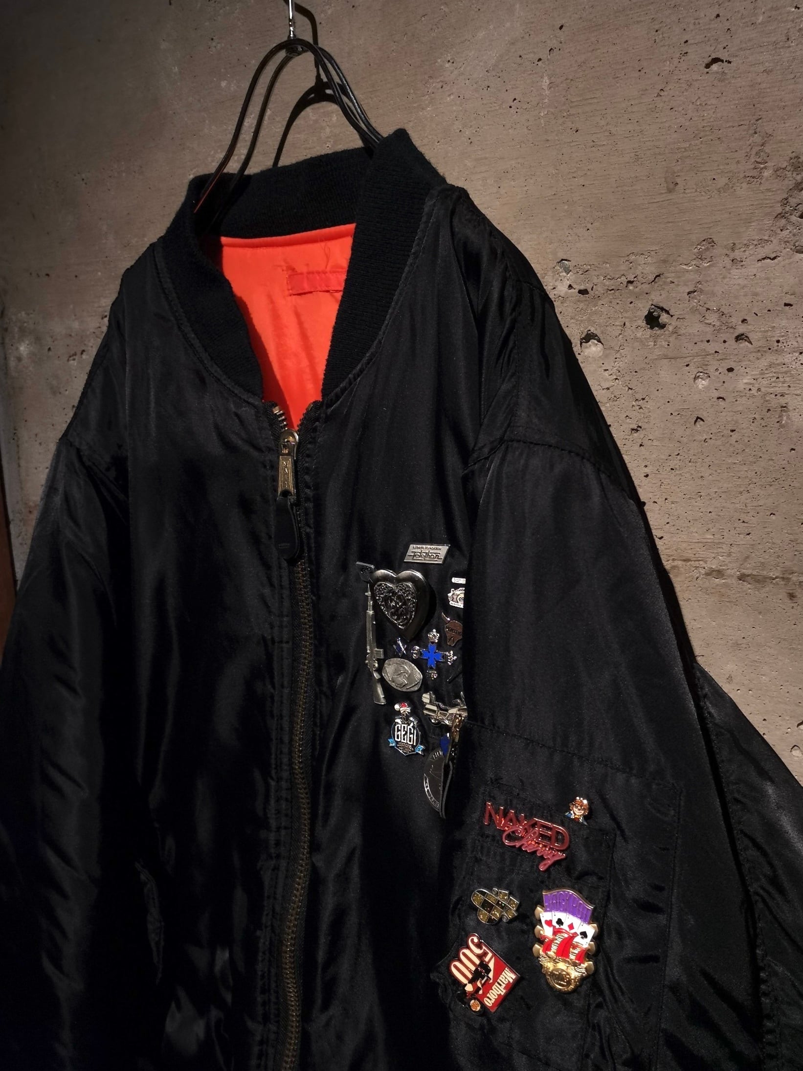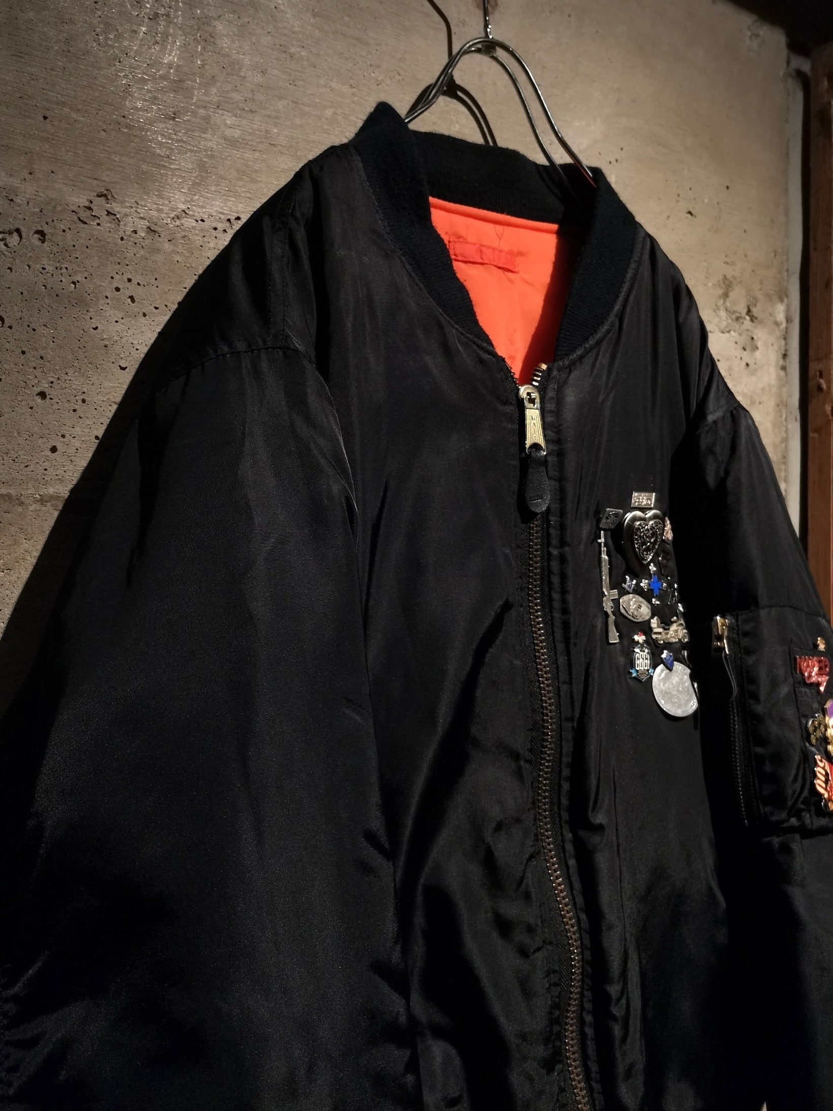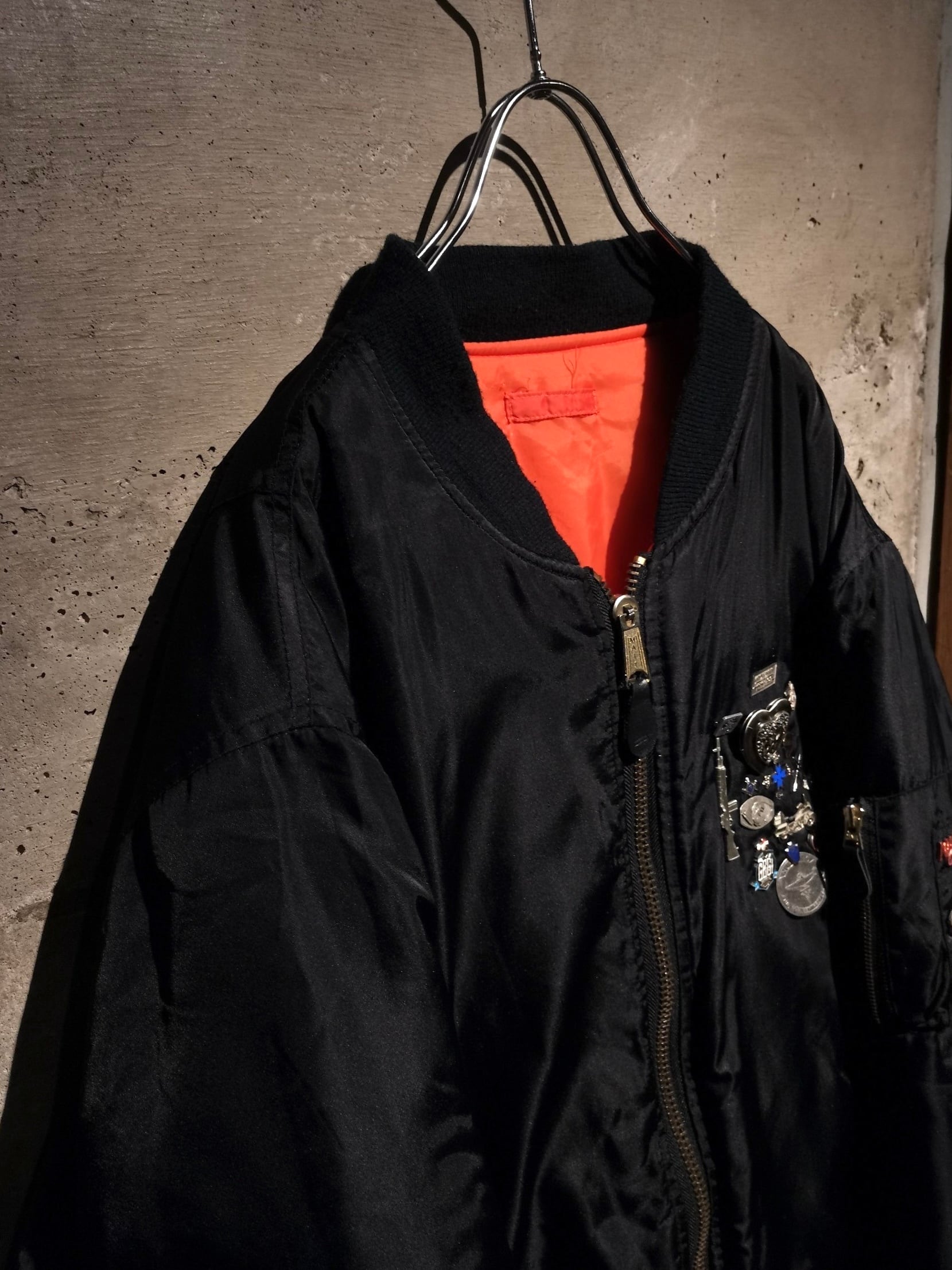 定番で今時期に探されている方も非常に多い“MA-1”に、Caka独自の感性による豪華かつ豪快なピンズカスタムを施した、唯一無二のスペシャルな逸品となっております。
