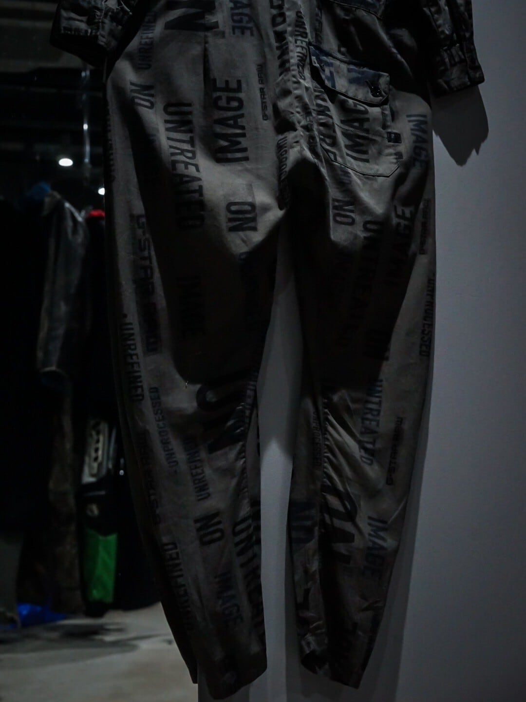フロントはジップアップ仕様、ウエストにはアジャスターベルトを施し、スポッと着るだけで楽〜に決まるヤツ。裾はジョガーパンツのようにキュッと締まったシルエットで、着用時のシルエットも◎