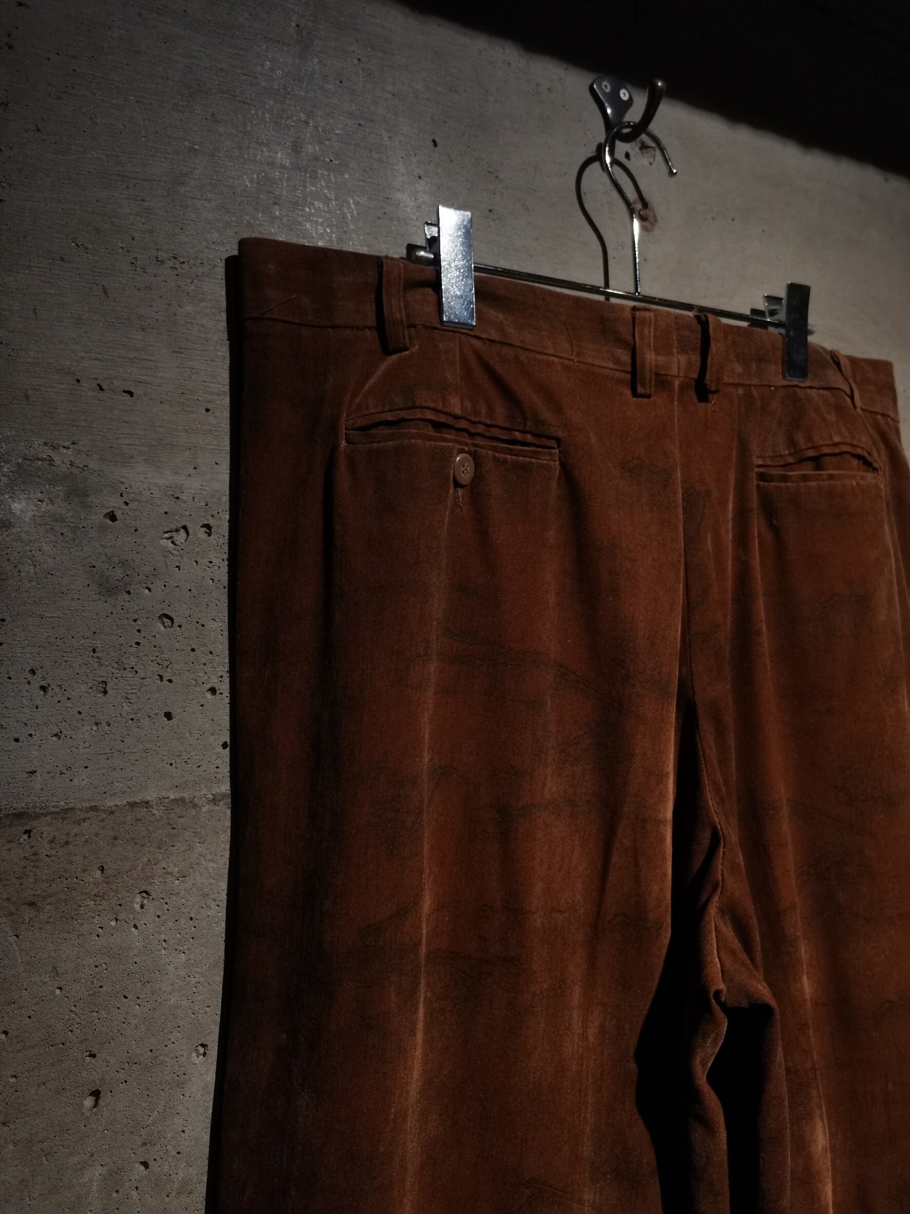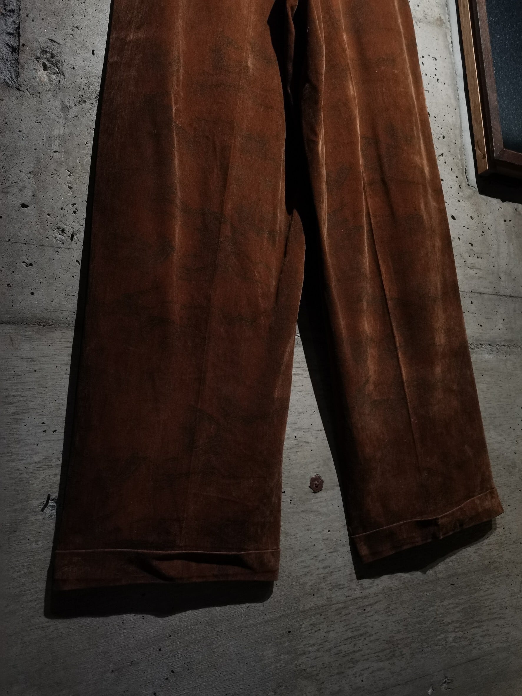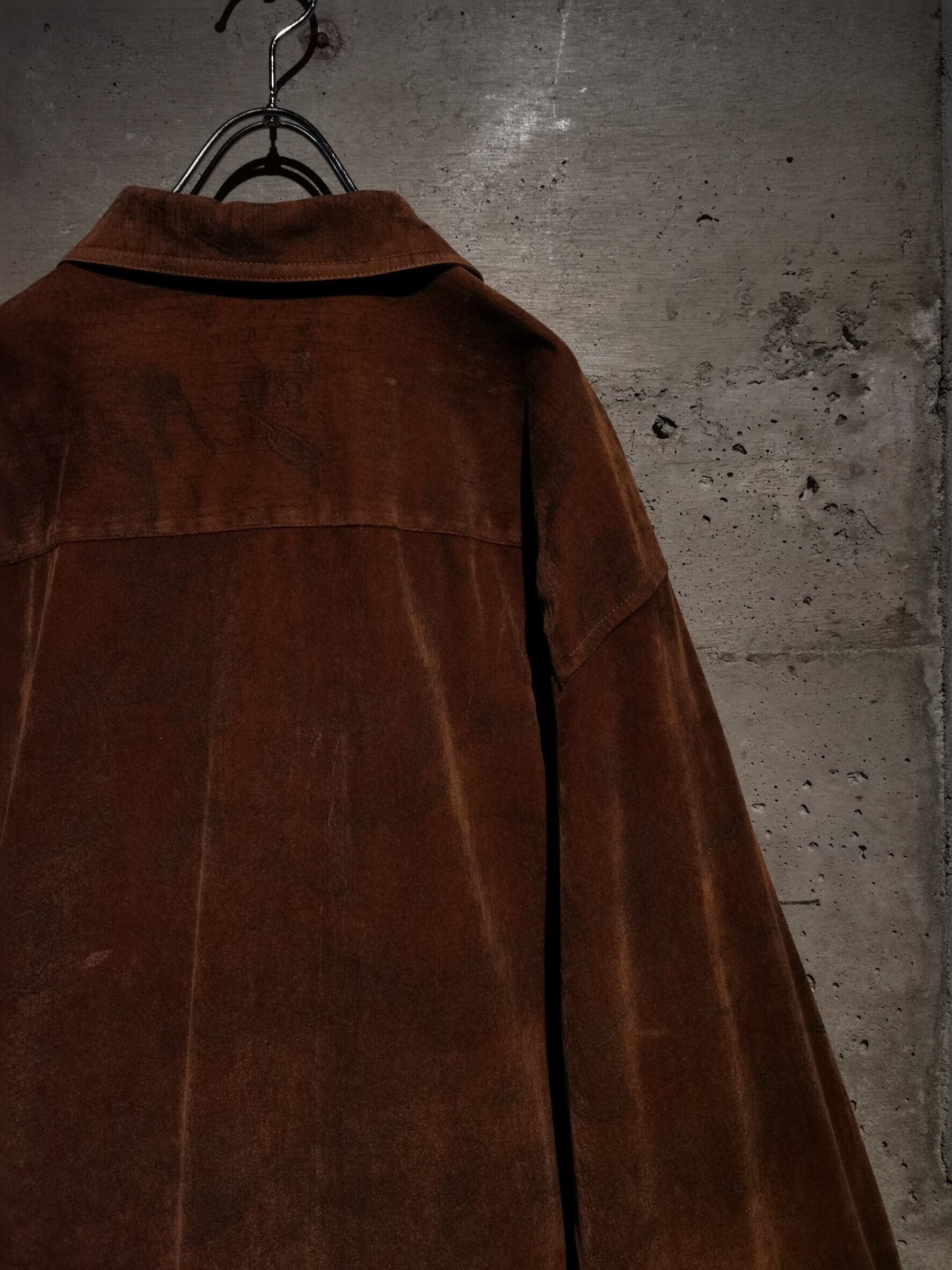 美しい光沢を帯びたブラウンのベロアに、大理石調のマーブル柄を載せたシャツセットアップ。