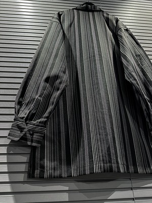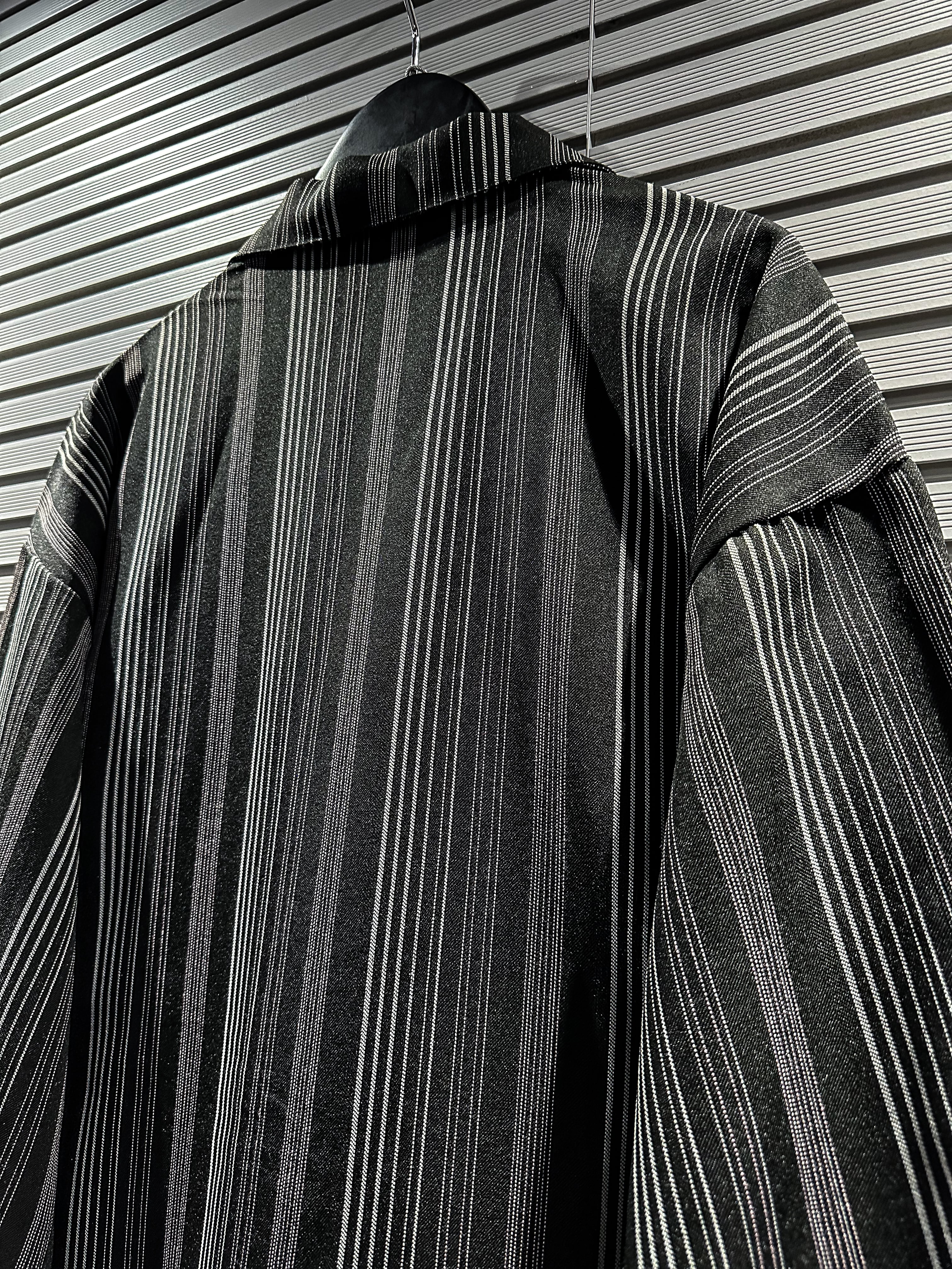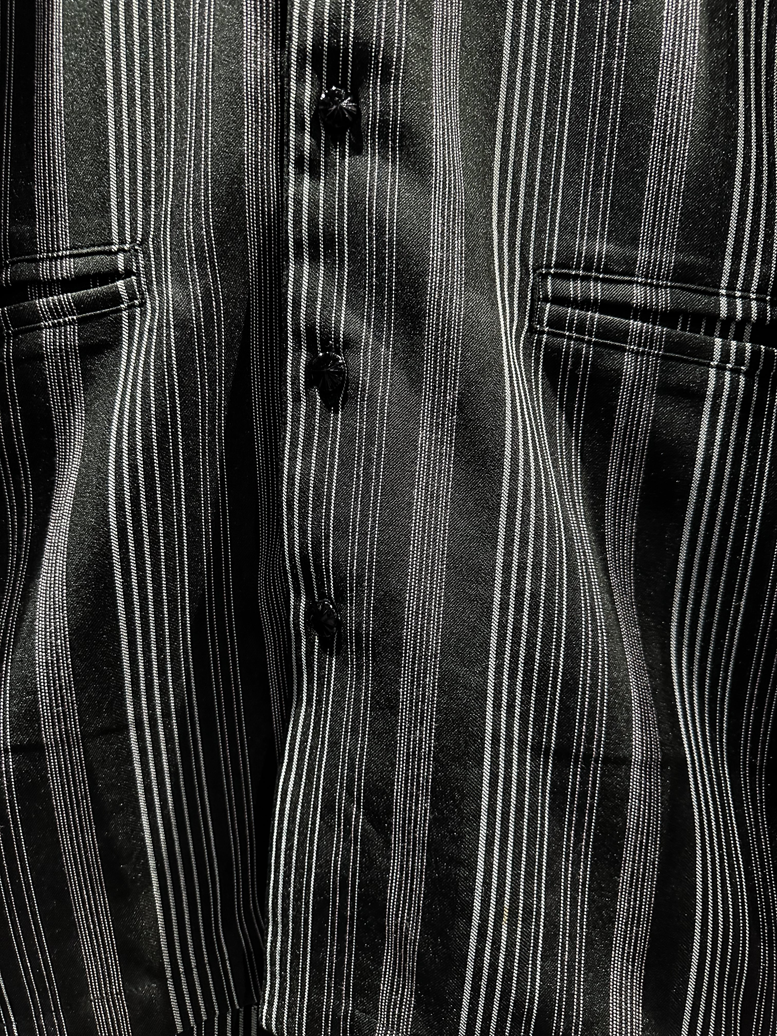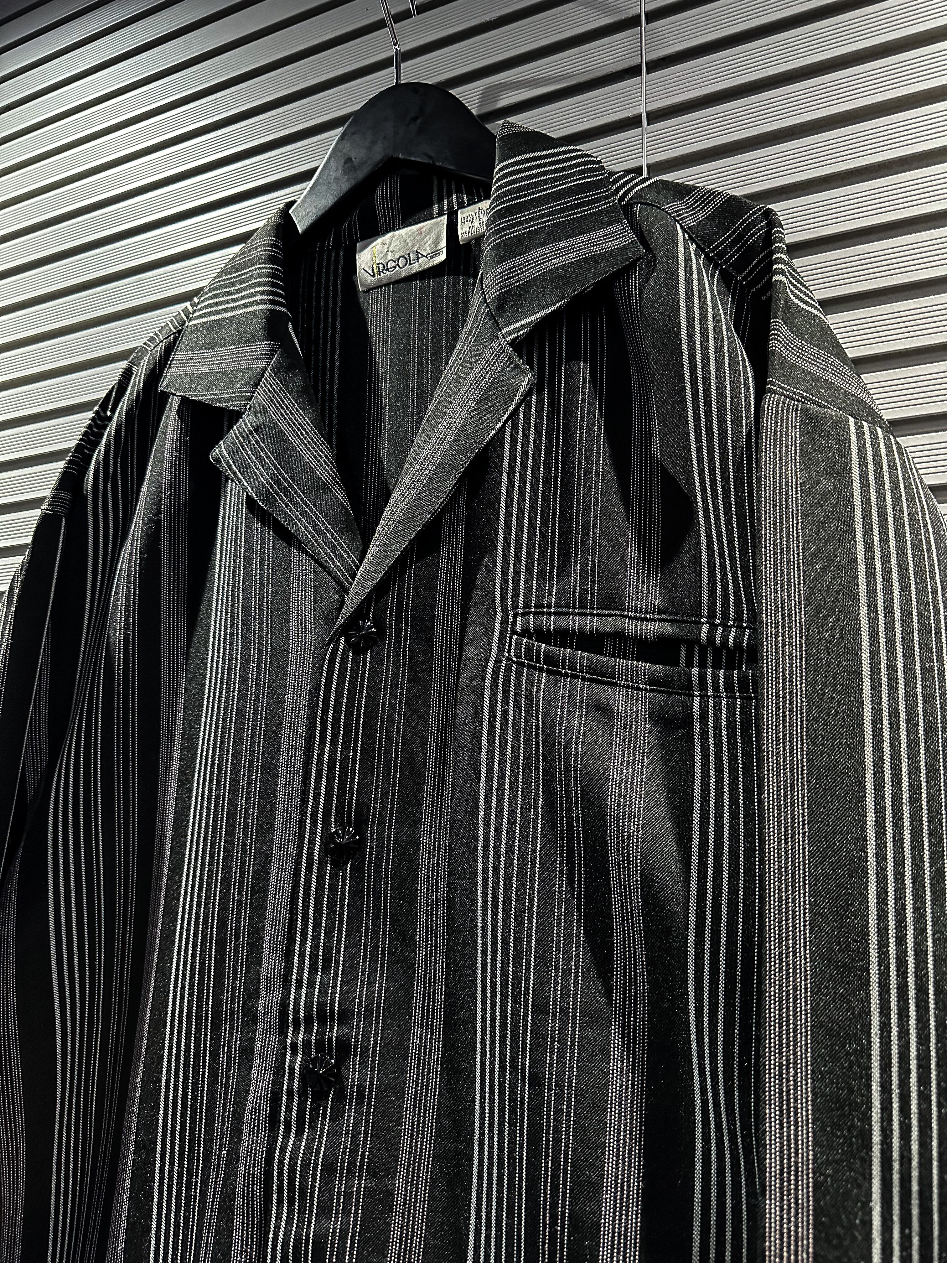 柔らかくもハリのある素材を用いて、ストライプを載せた逸品。シャツはフロントに3つポケット、首元は美しく開いたオープンカラータイプ。
