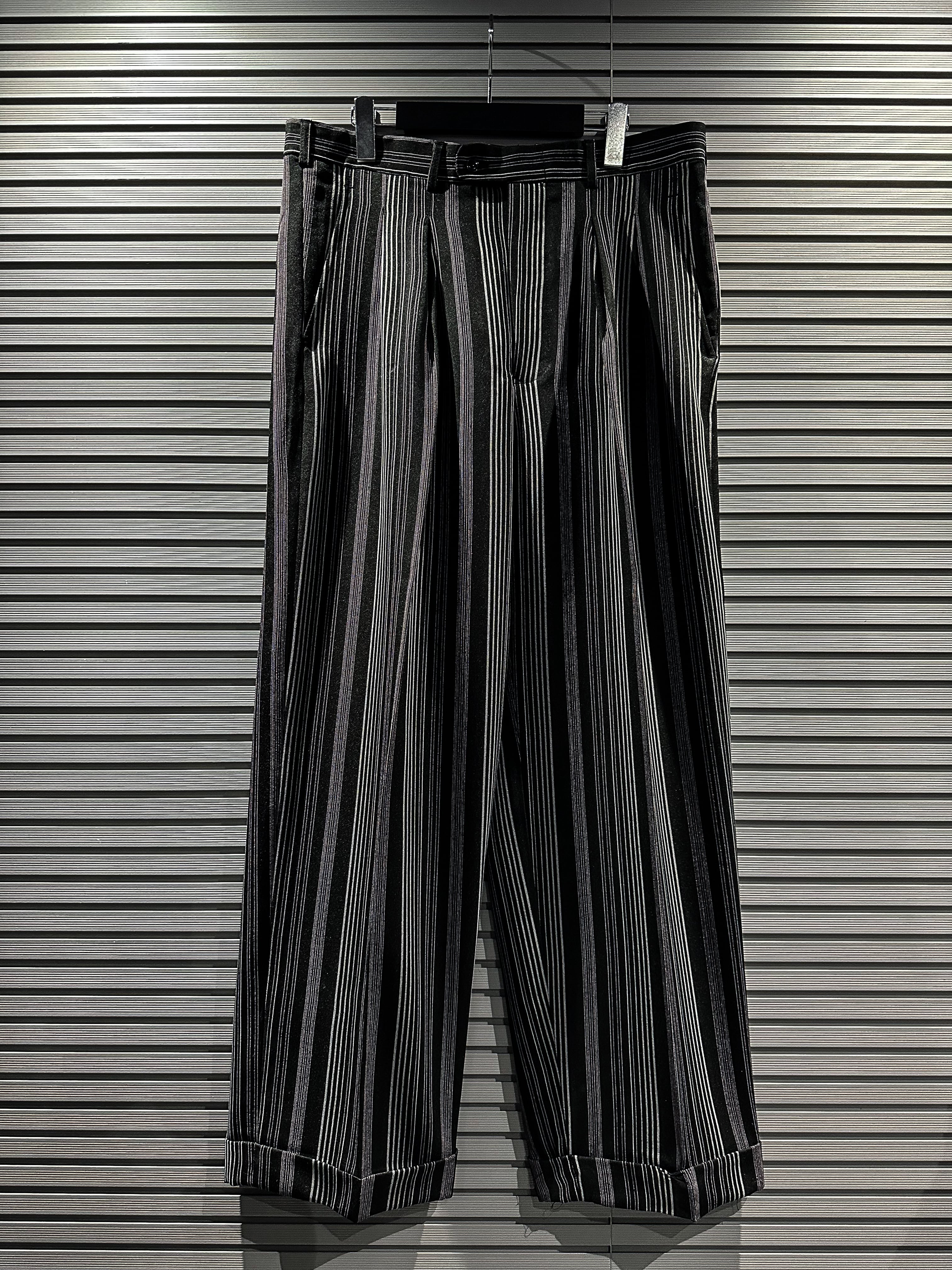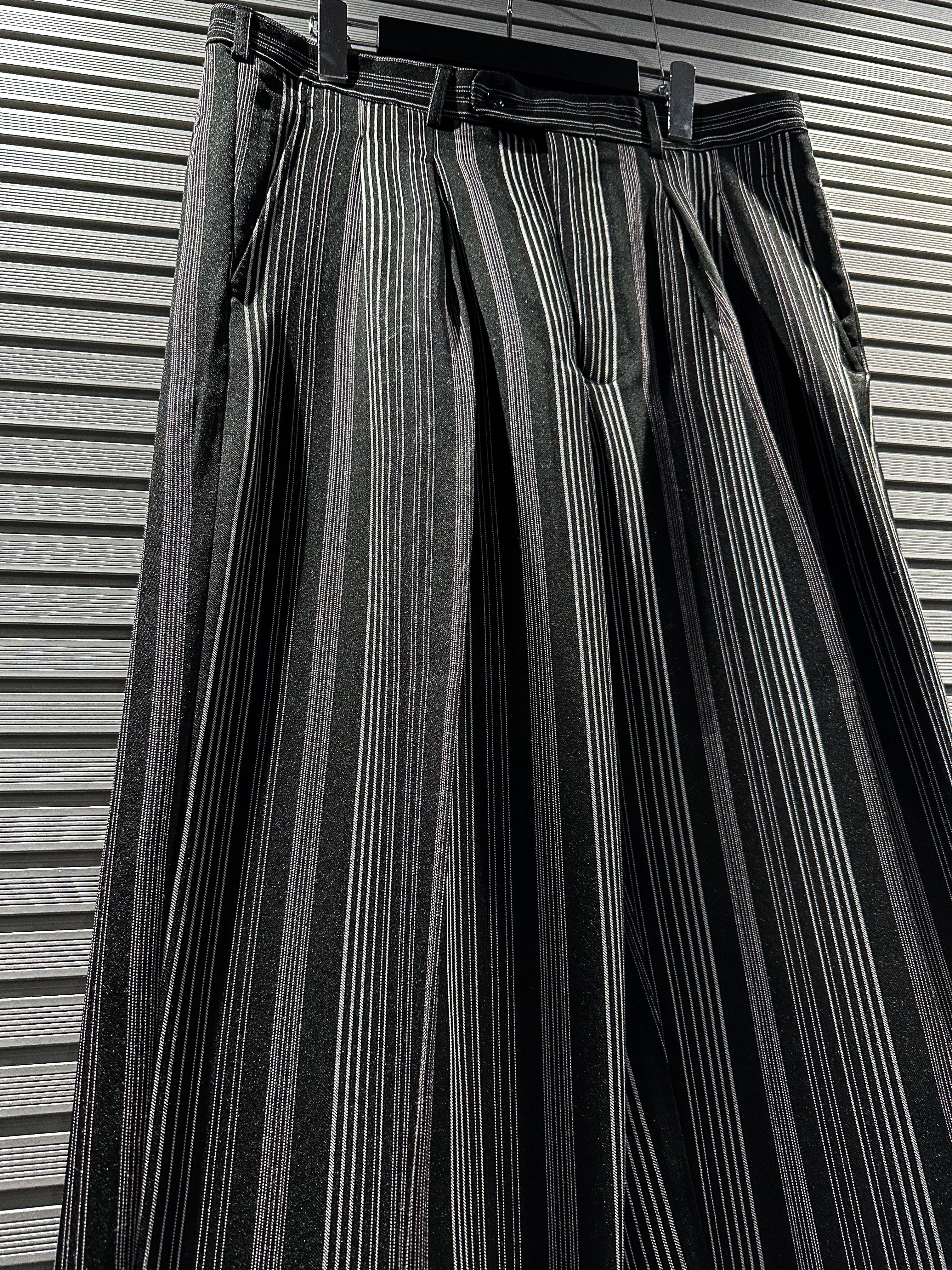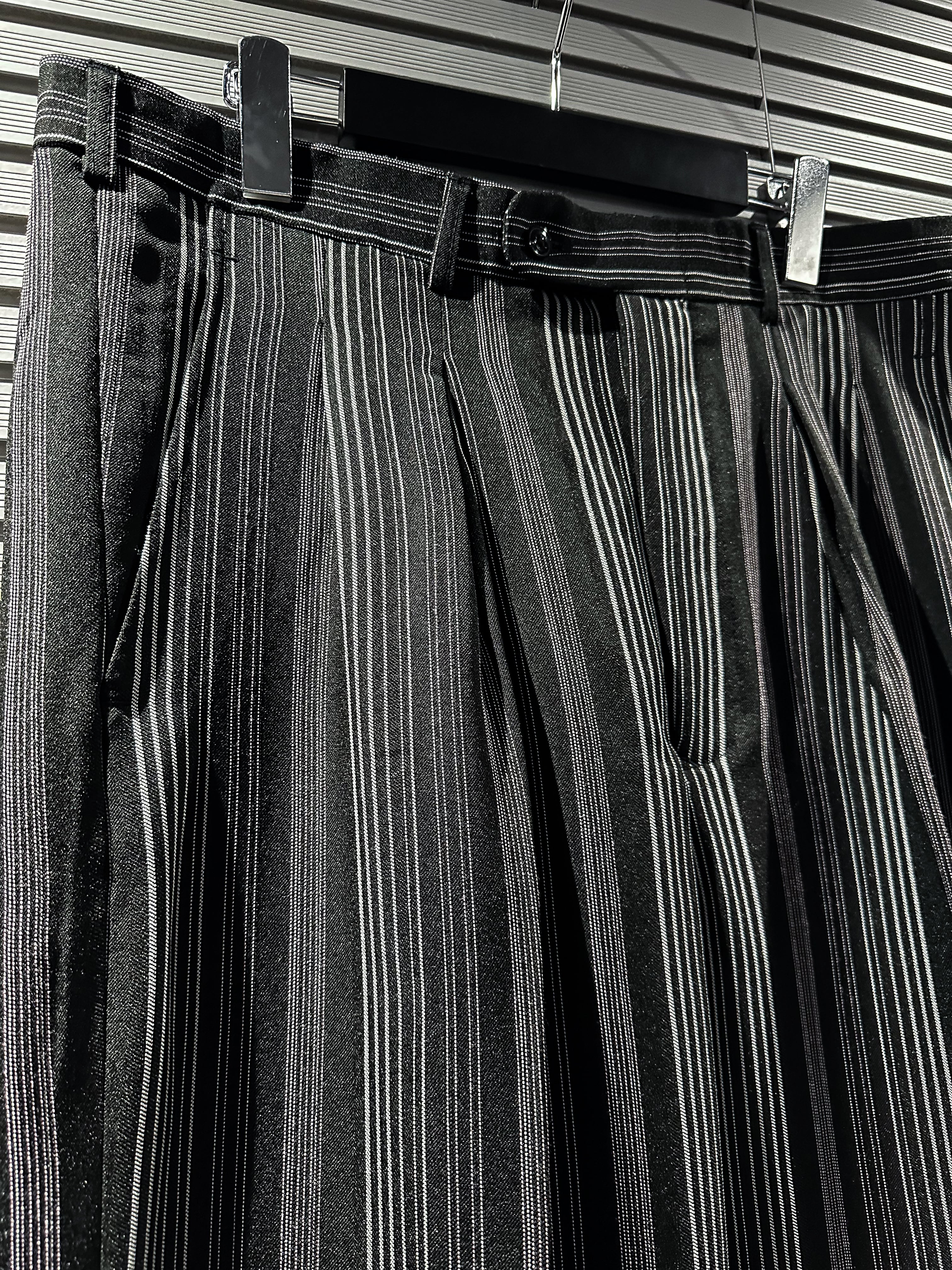 パンツは内ひだが入ったズドン下まで落ち感の素晴らしいワイドなスラックス。着用時のシルエットが非常に美しく、太めのスラックスって今まさに気分ですよね。