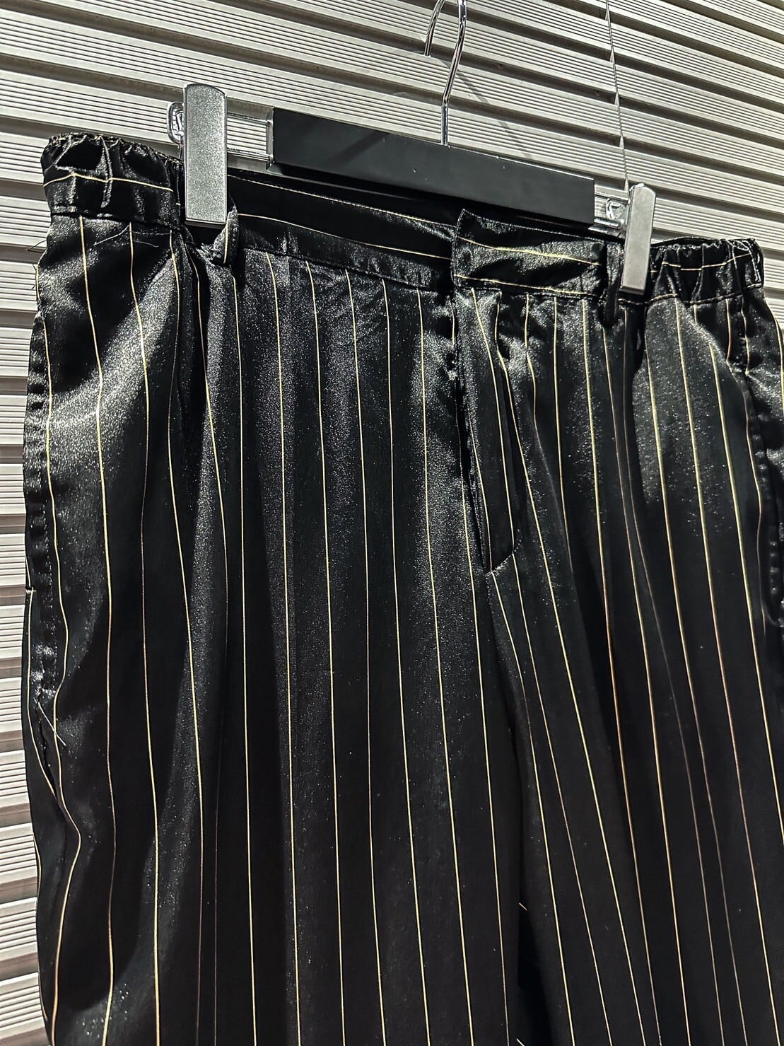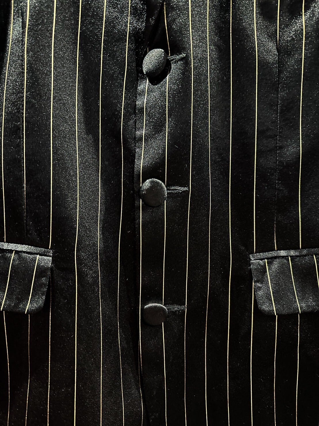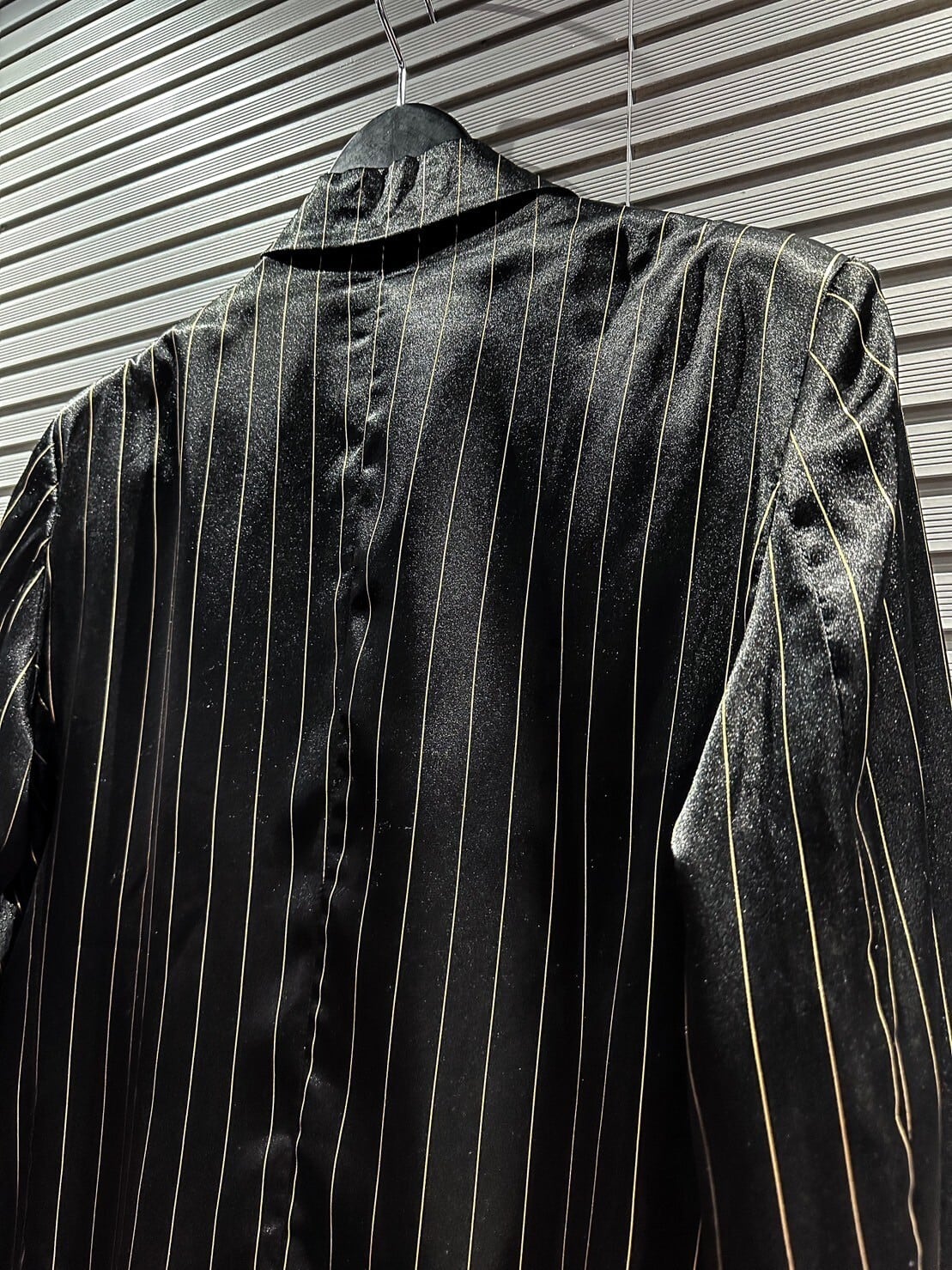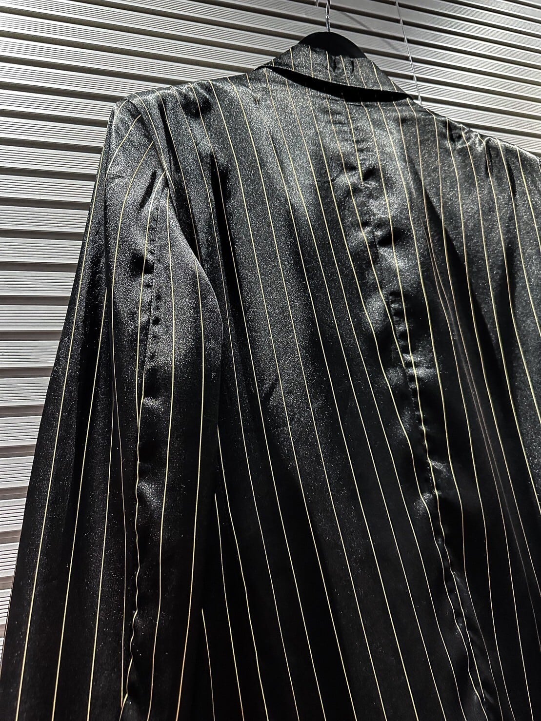 真珠のように鈍く美しい光沢を放つシルク素材を使用したブラックのボディに、ゴールドのストライプを載せた高級感の漂う1着。