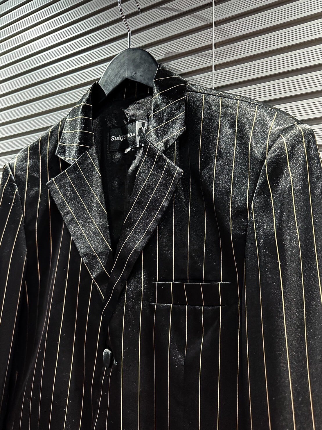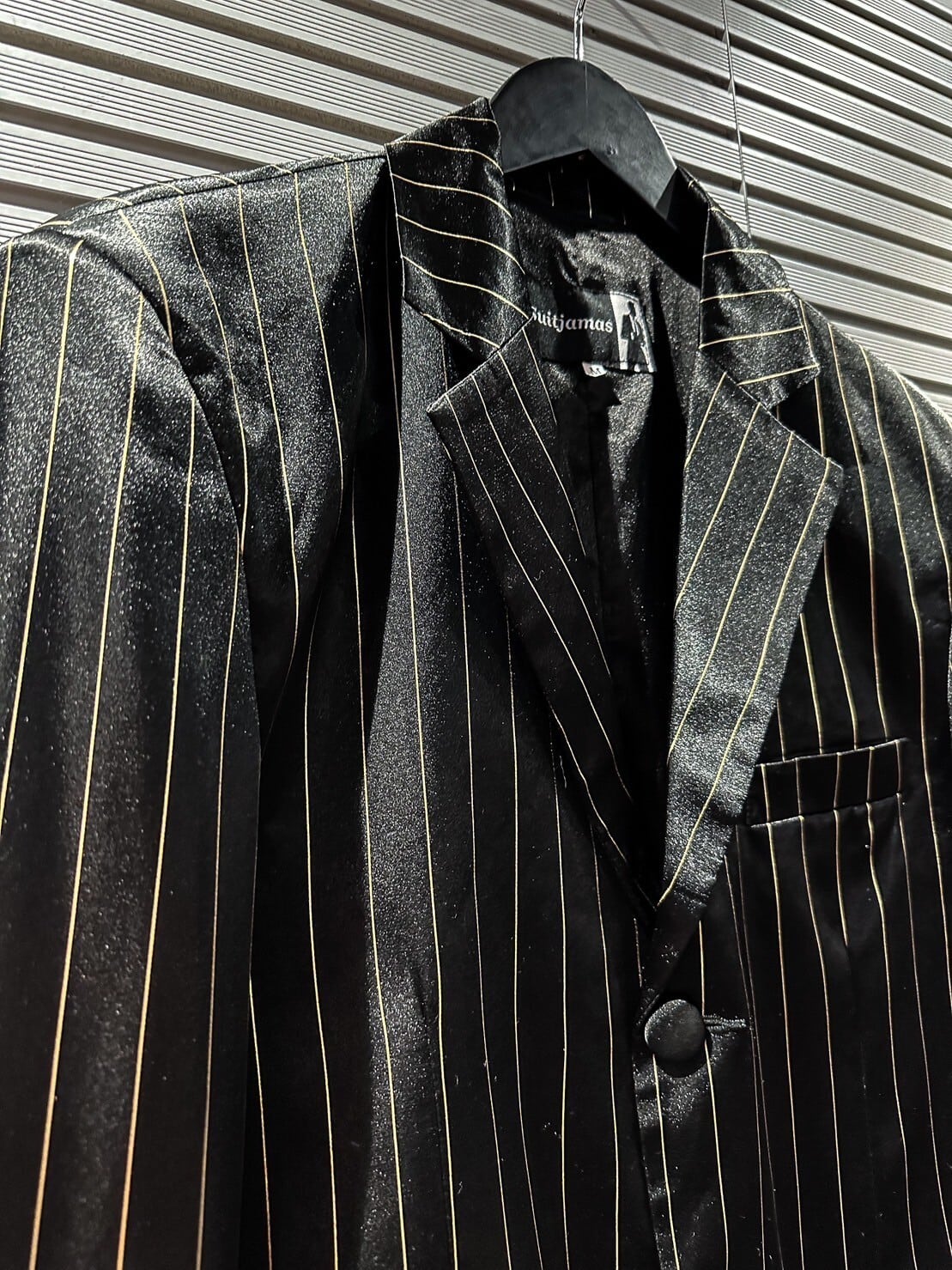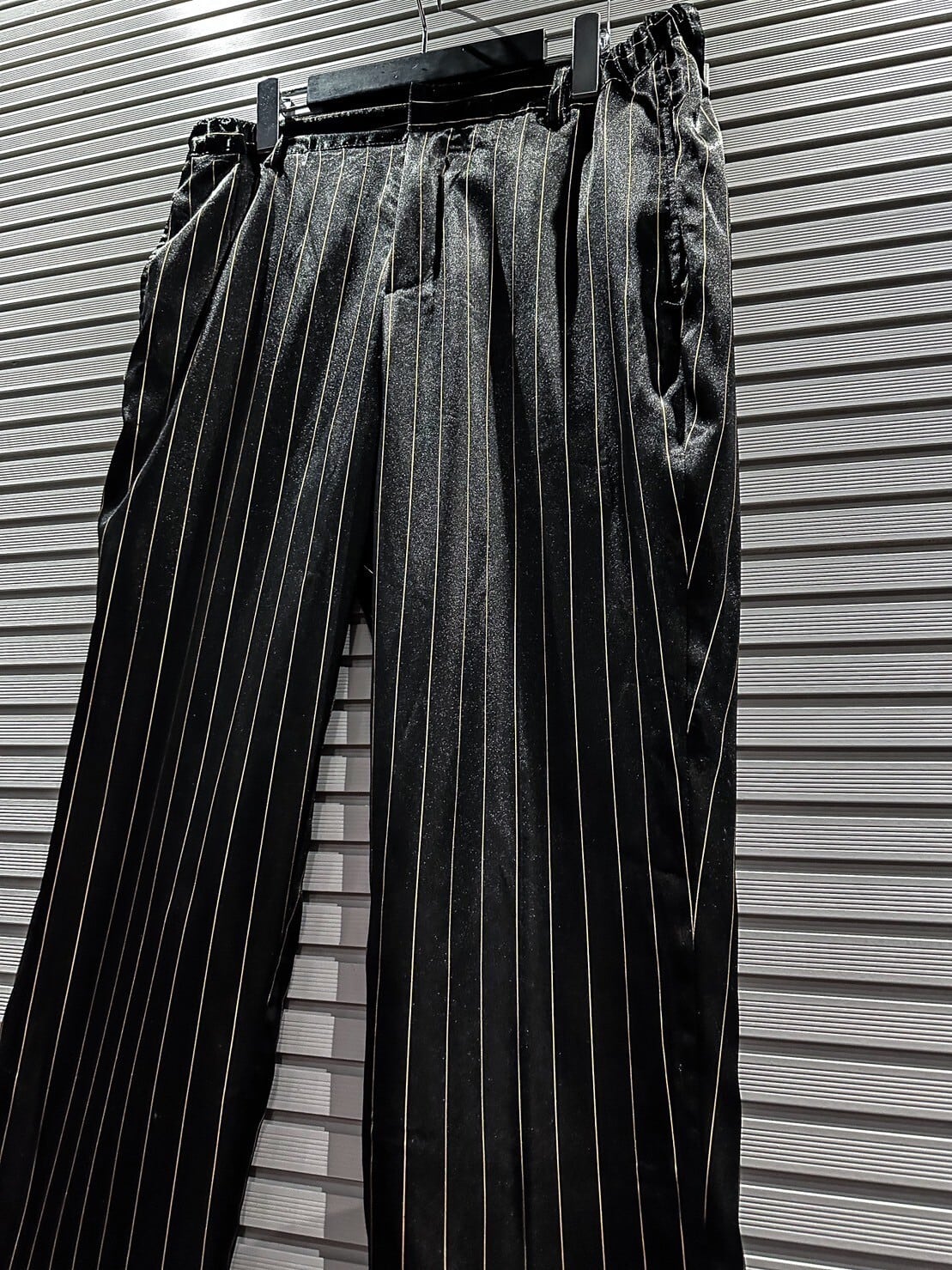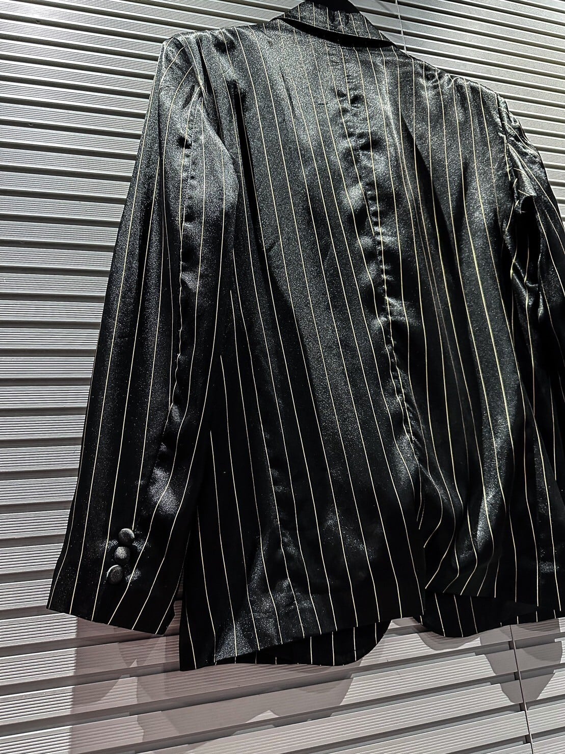 真珠のように鈍く美しい光沢を放つシルク素材を使用したブラックのボディに、ゴールドのストライプを載せた高級感の漂う1着。