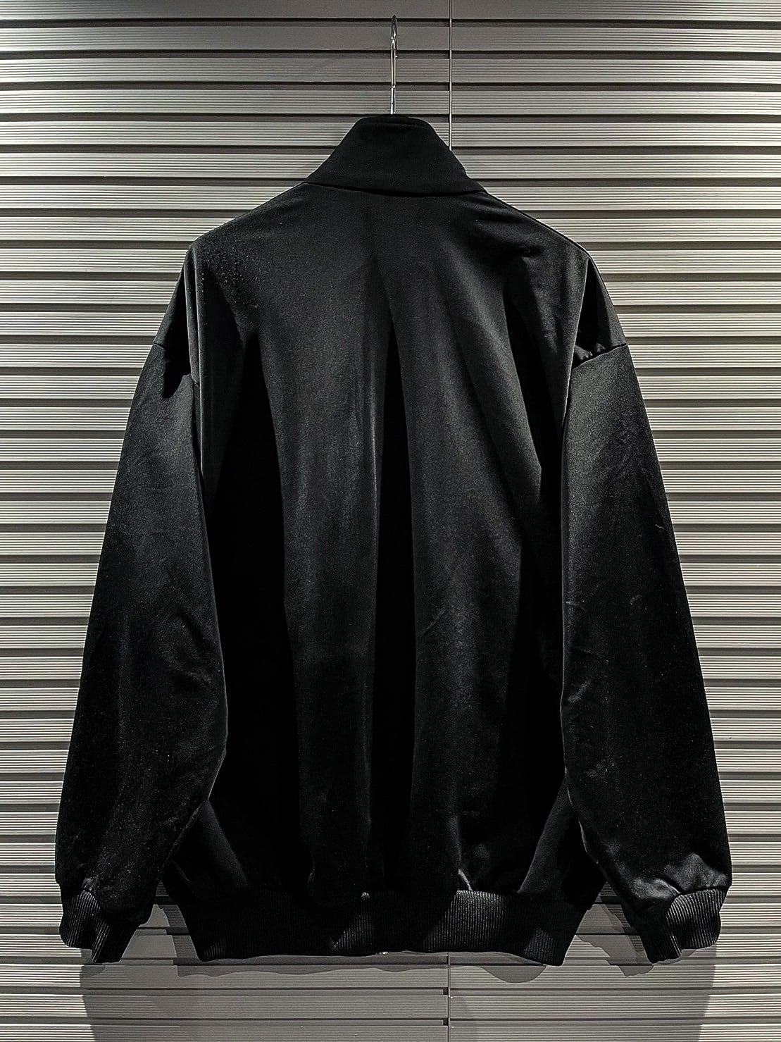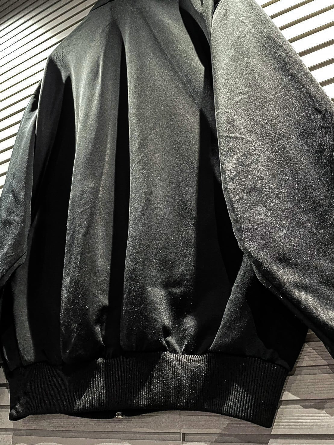 ジャケットは左胸にブランドロゴの刺繍、肩から袖にかけて黒×シルバーのカラーリングでブランドロゴを載せたテープをON。