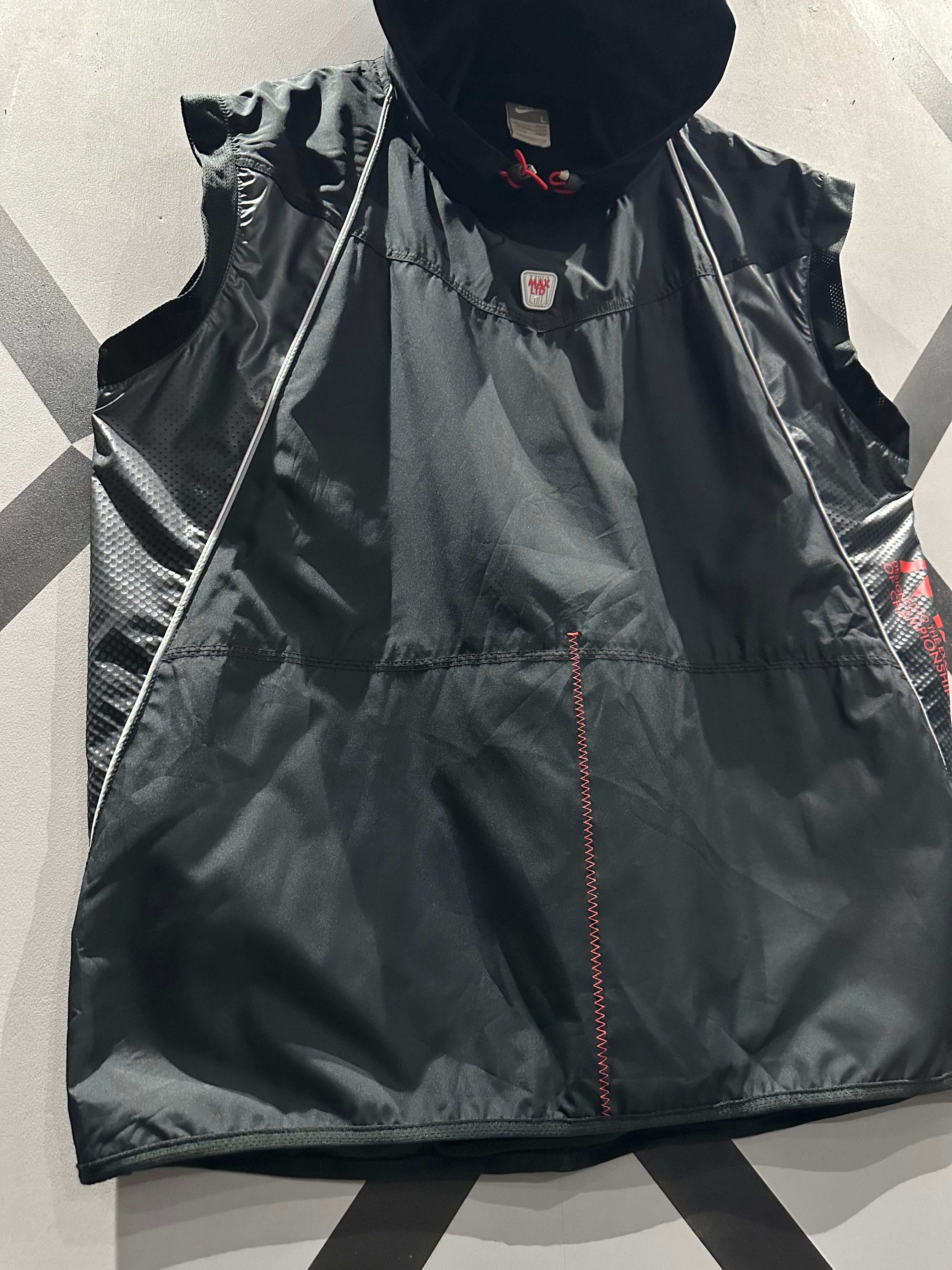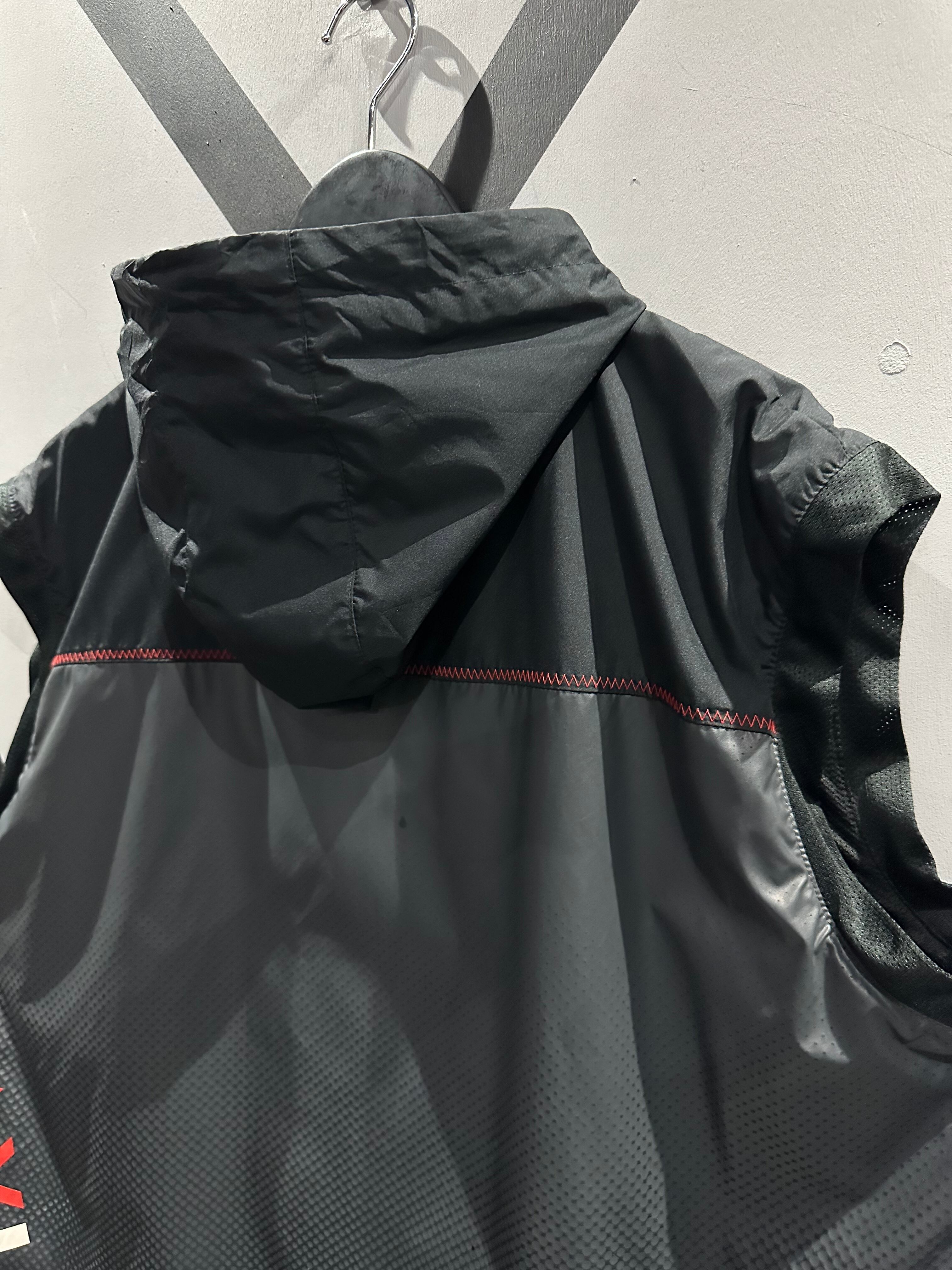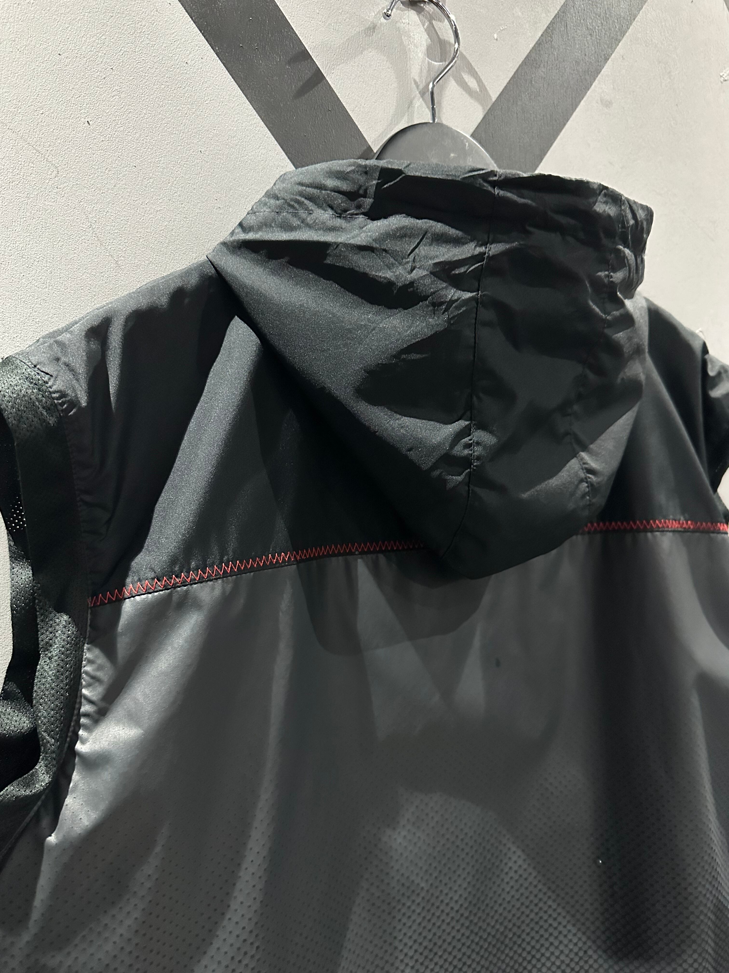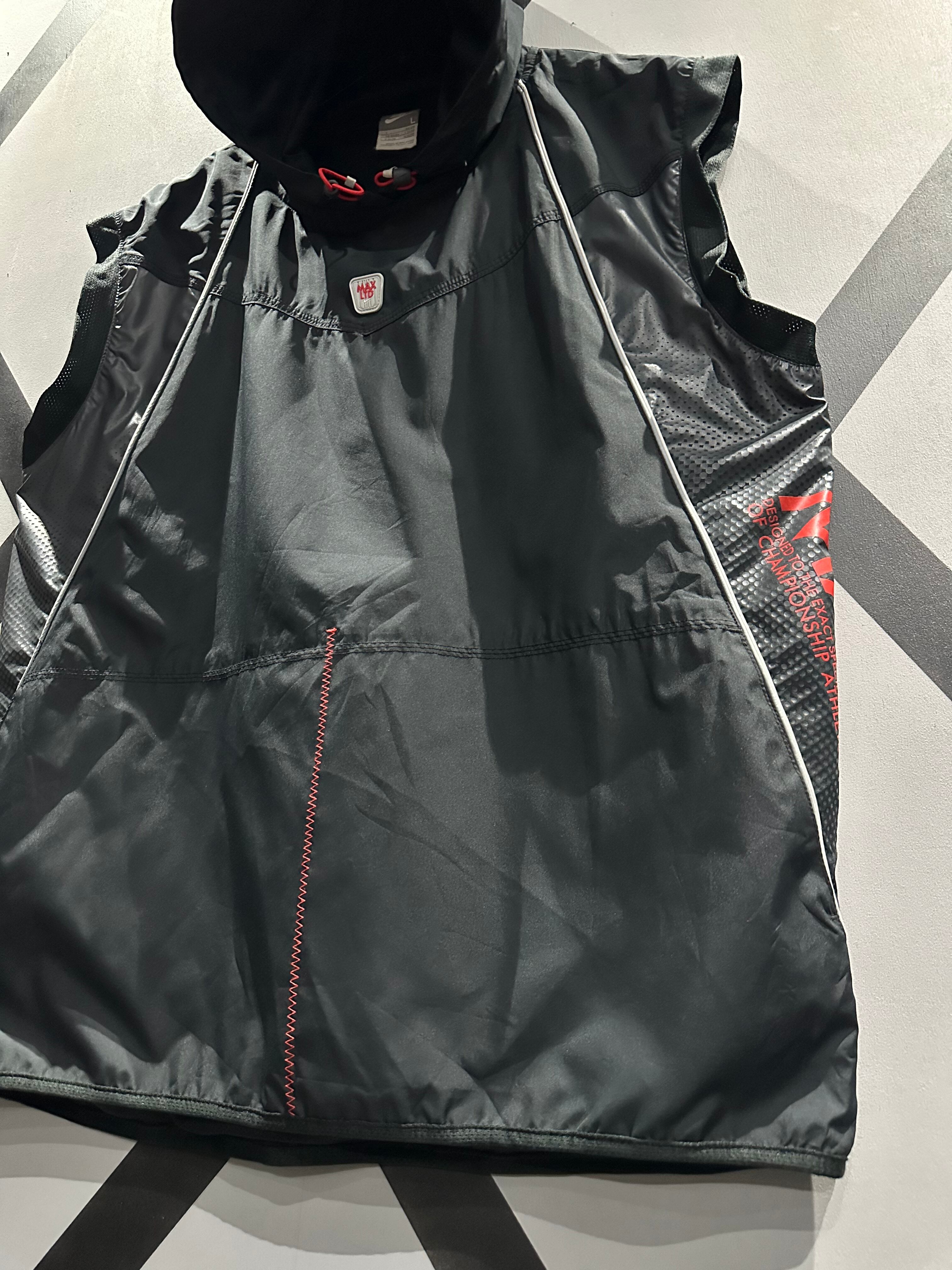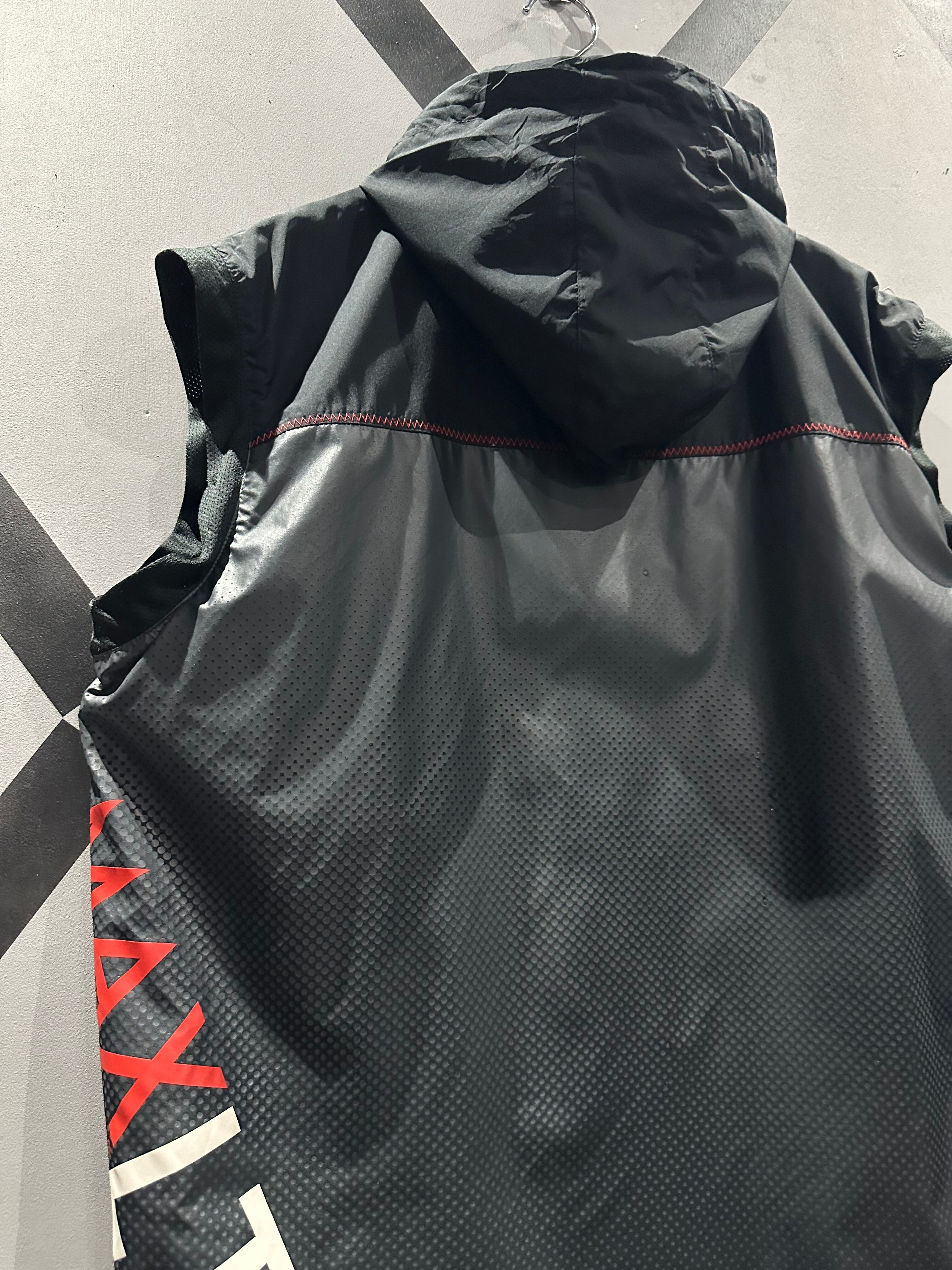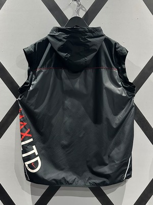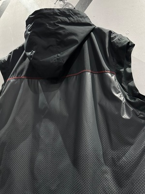 シャリ感のあるポリエステル素材を用いて、グレー×ブラックのカラーリングで切り替えた"NIKE"のベスト。