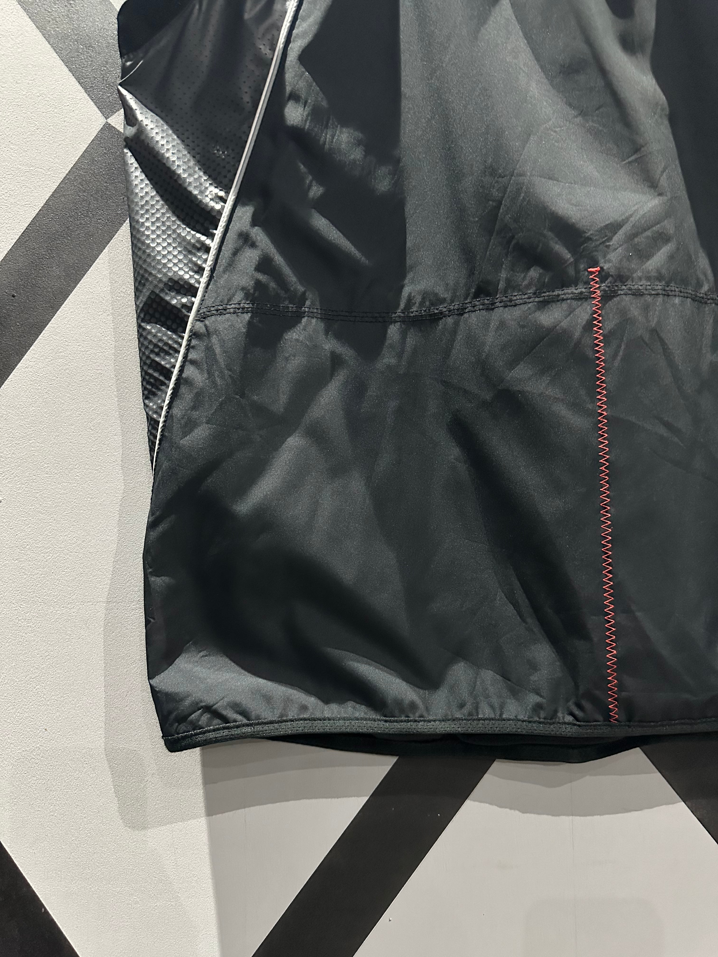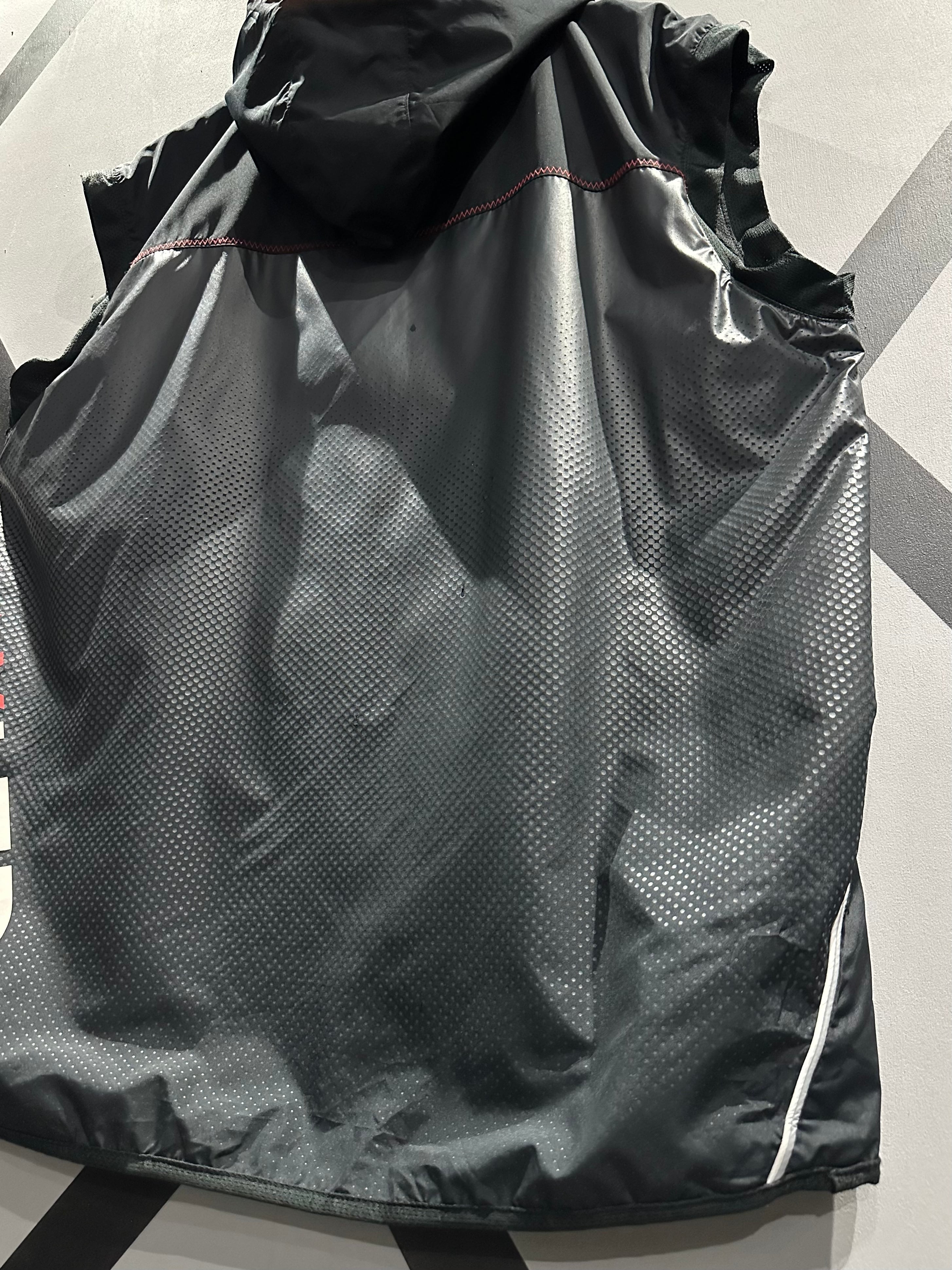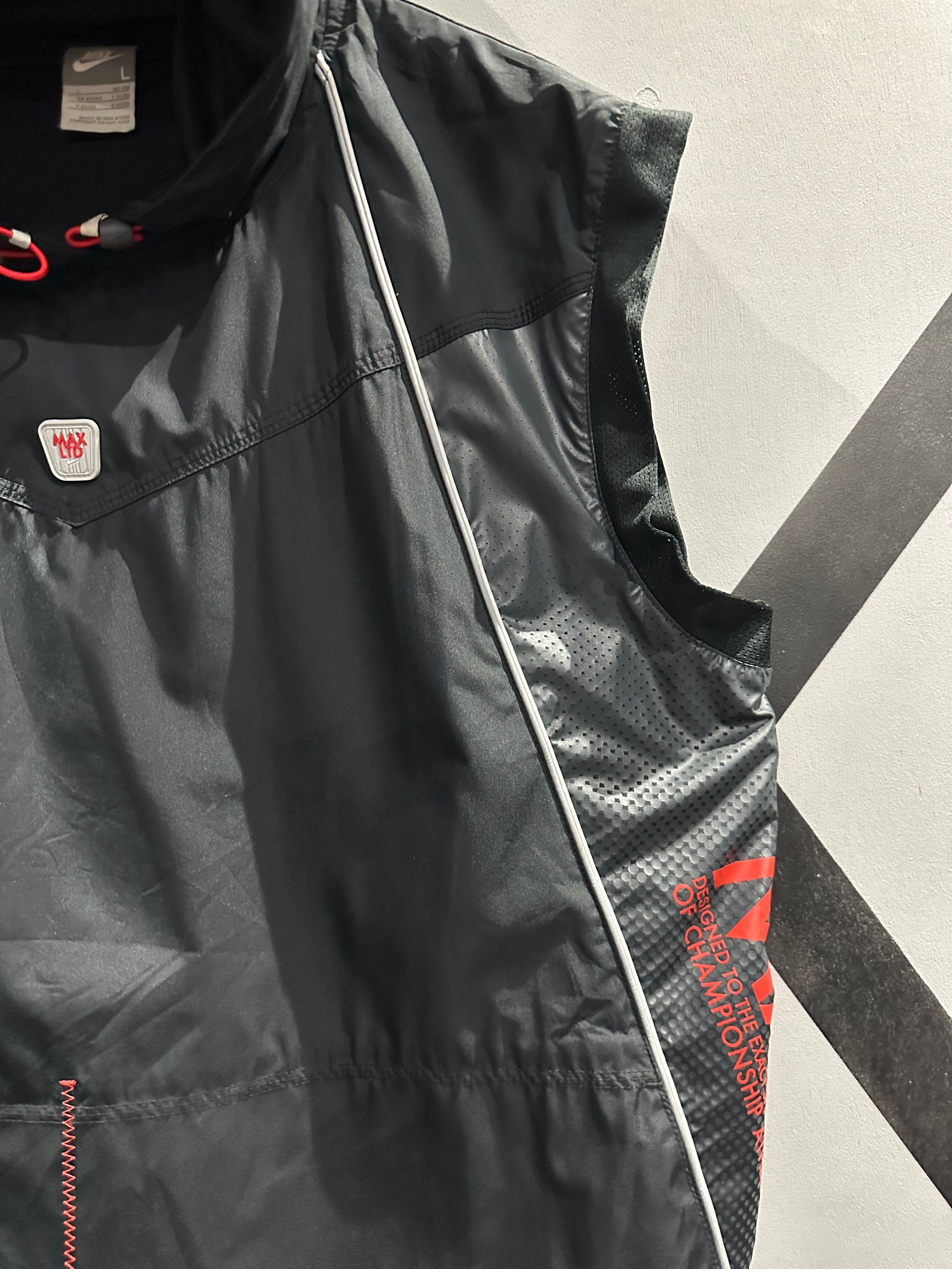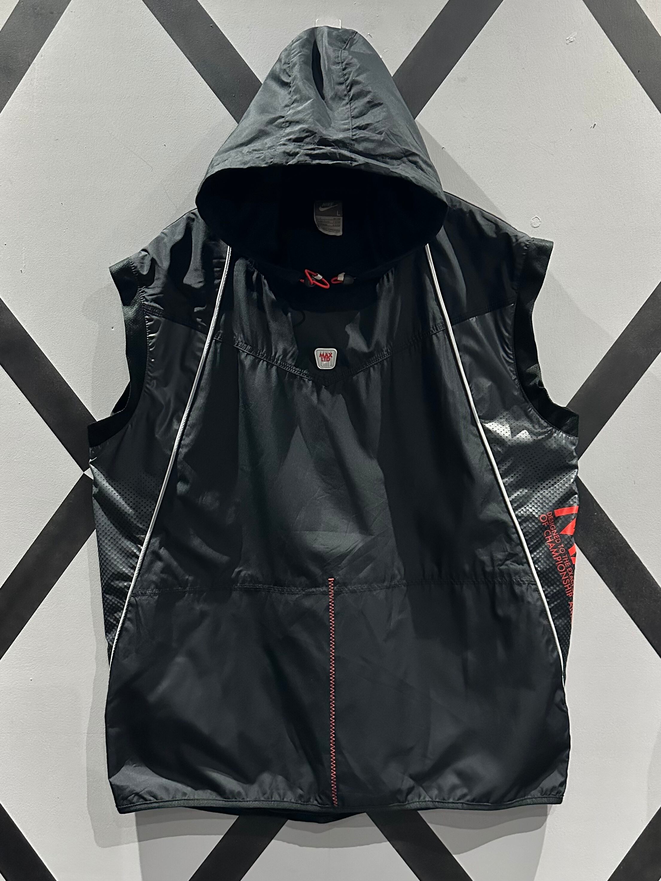 シャリ感のあるポリエステル素材を用いて、グレー×ブラックのカラーリングで切り替えた"NIKE"のベスト。