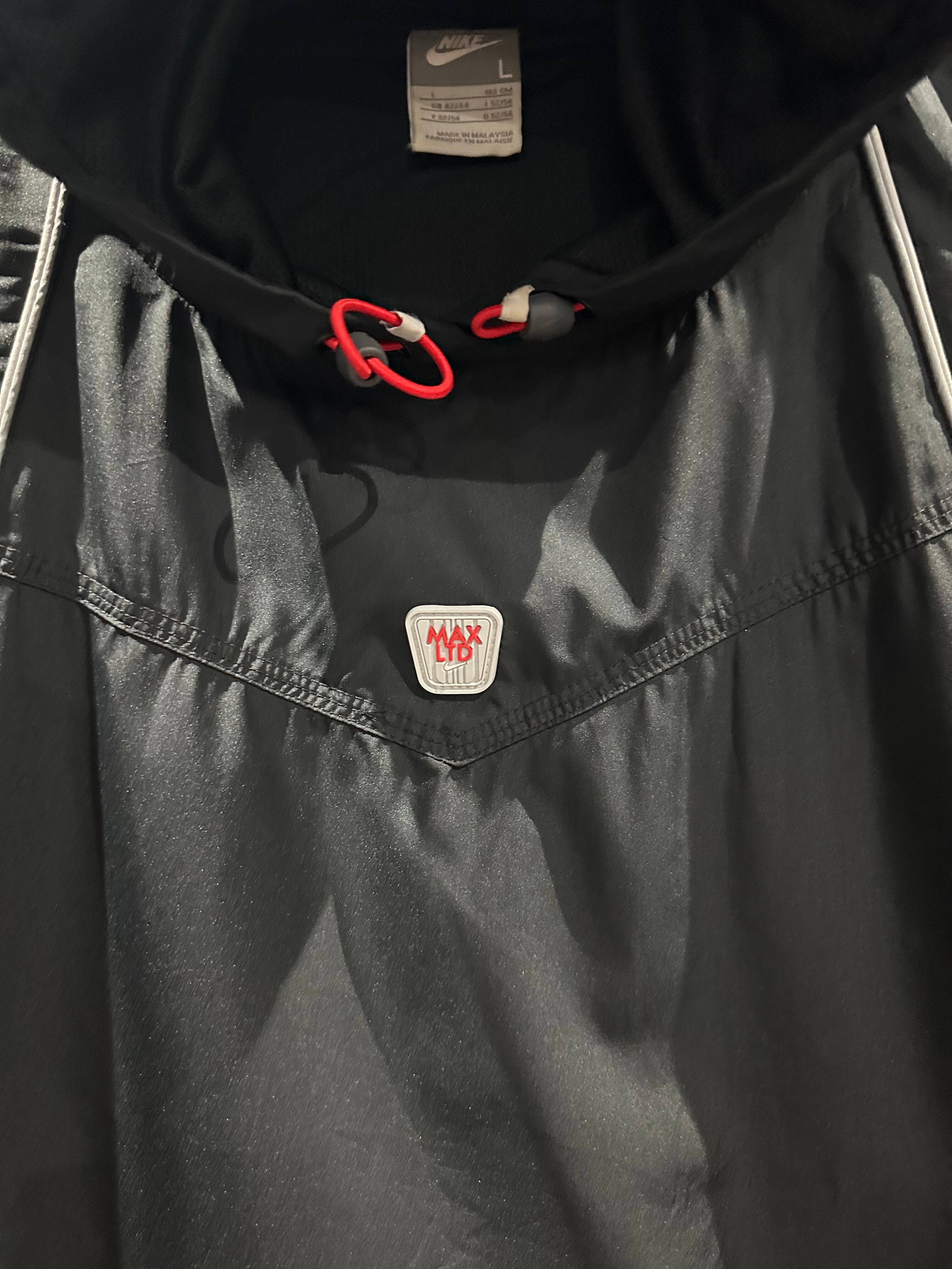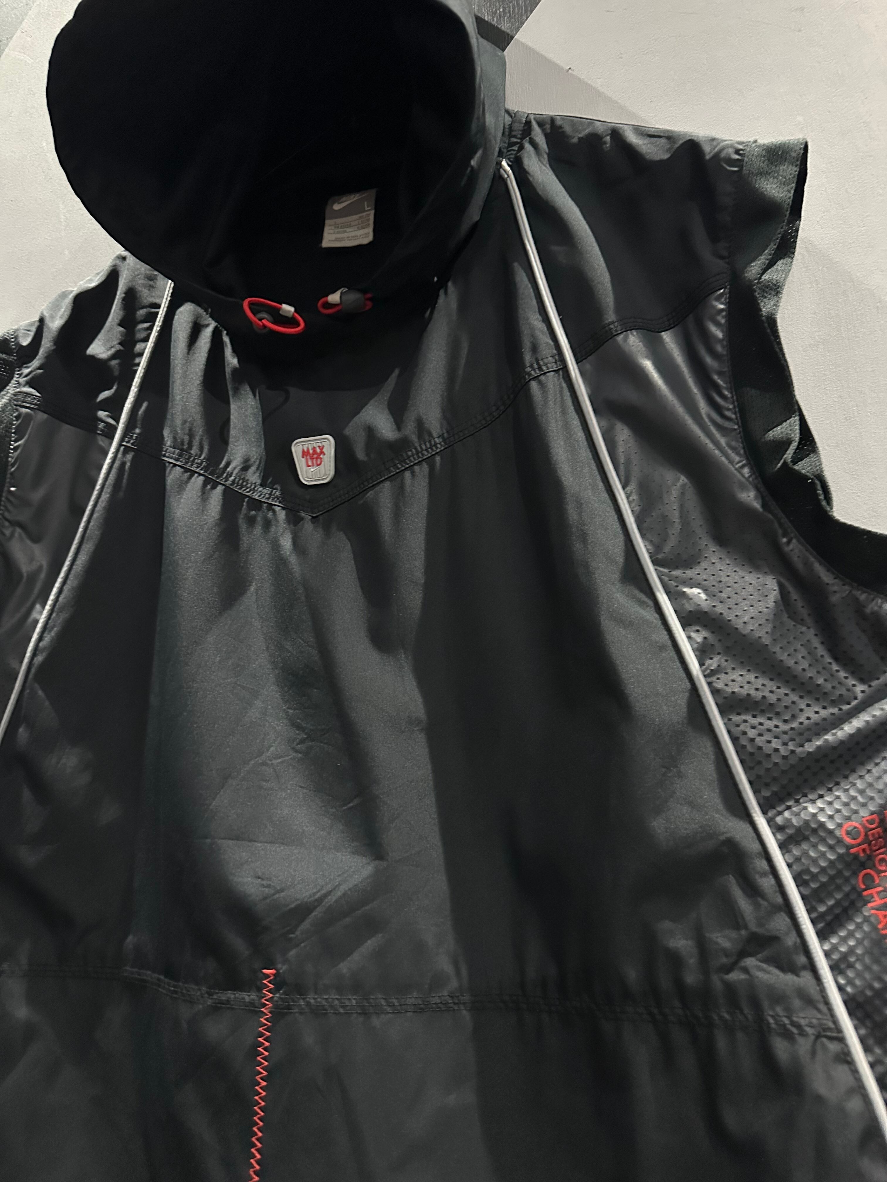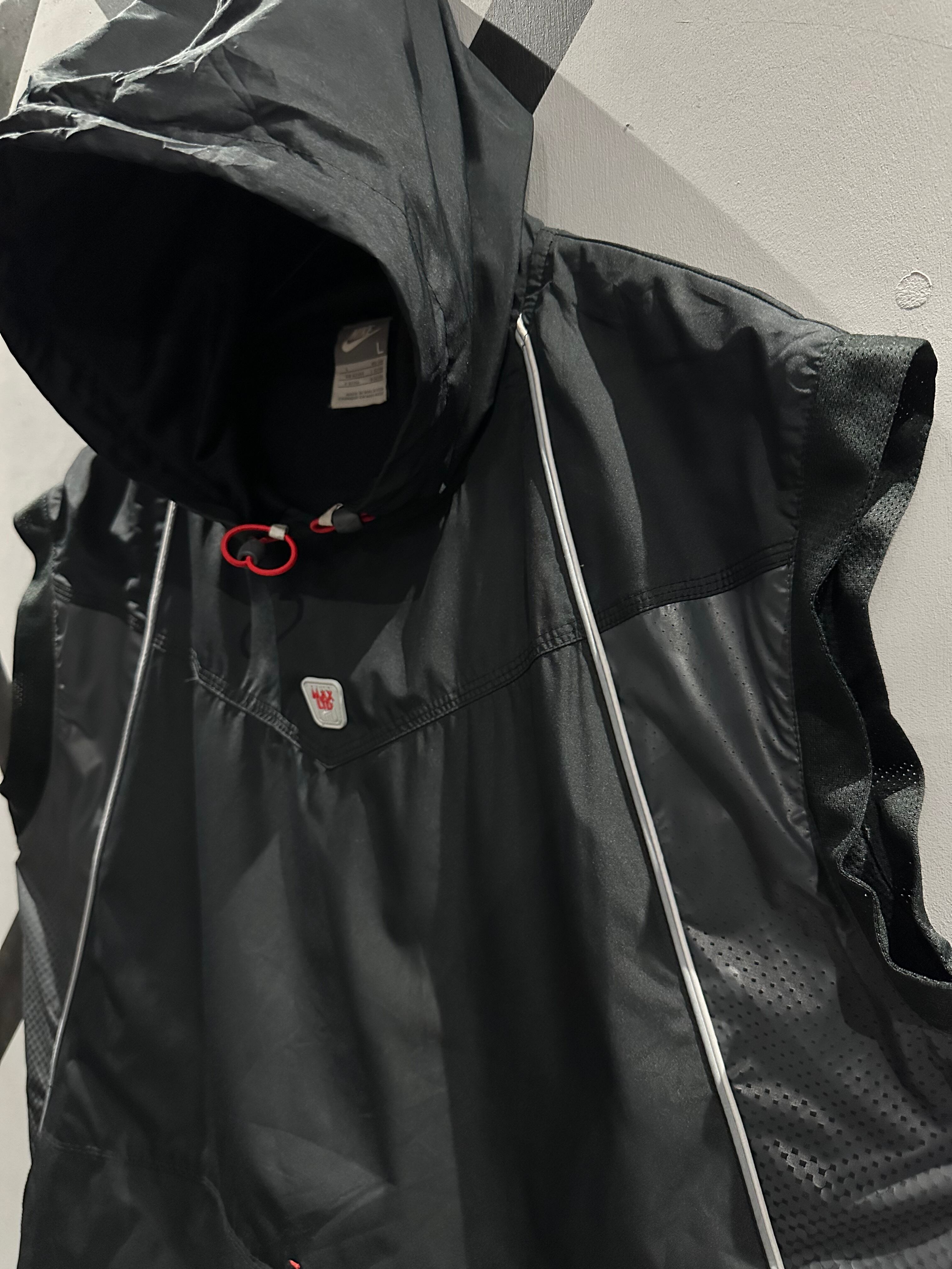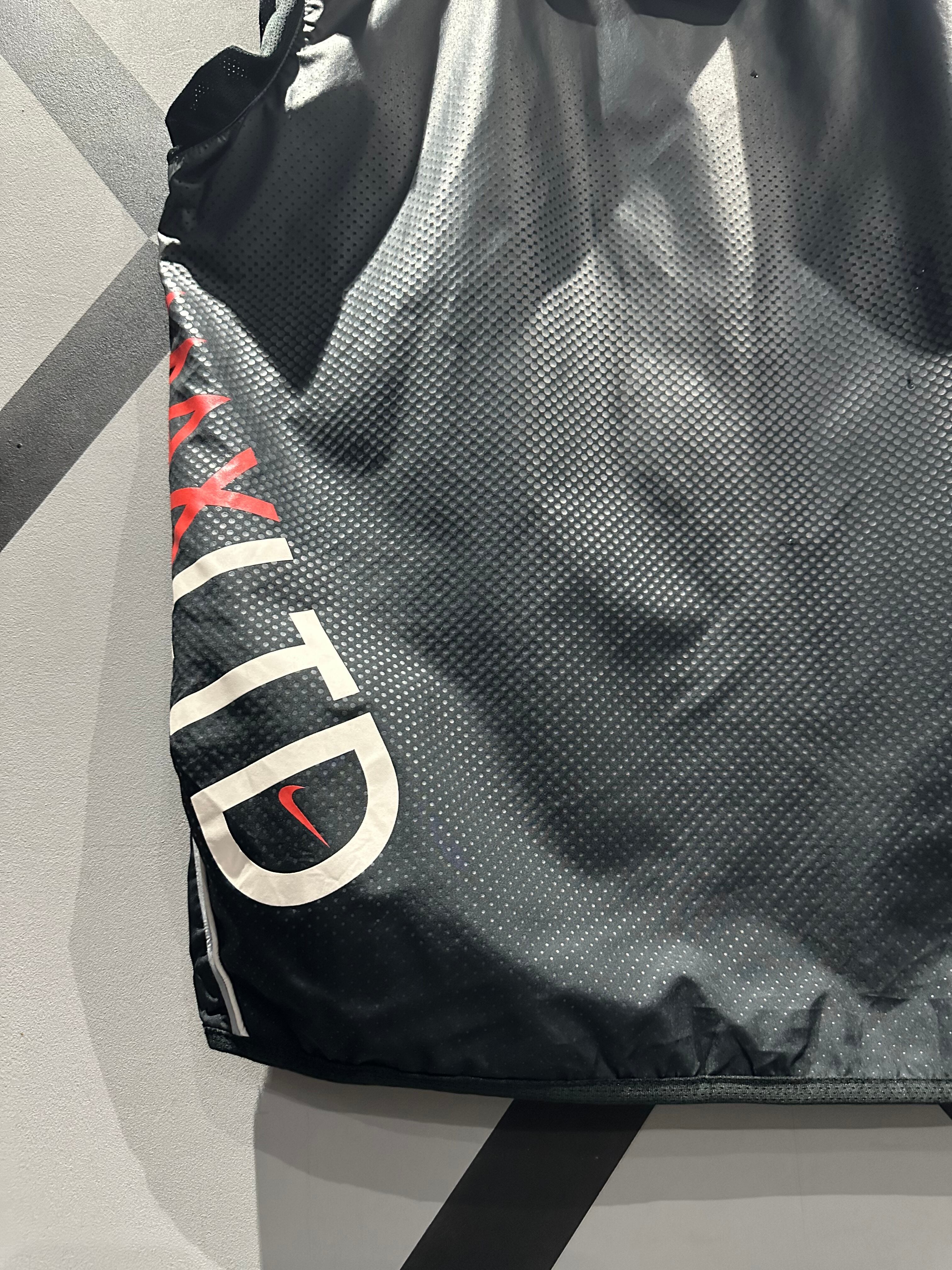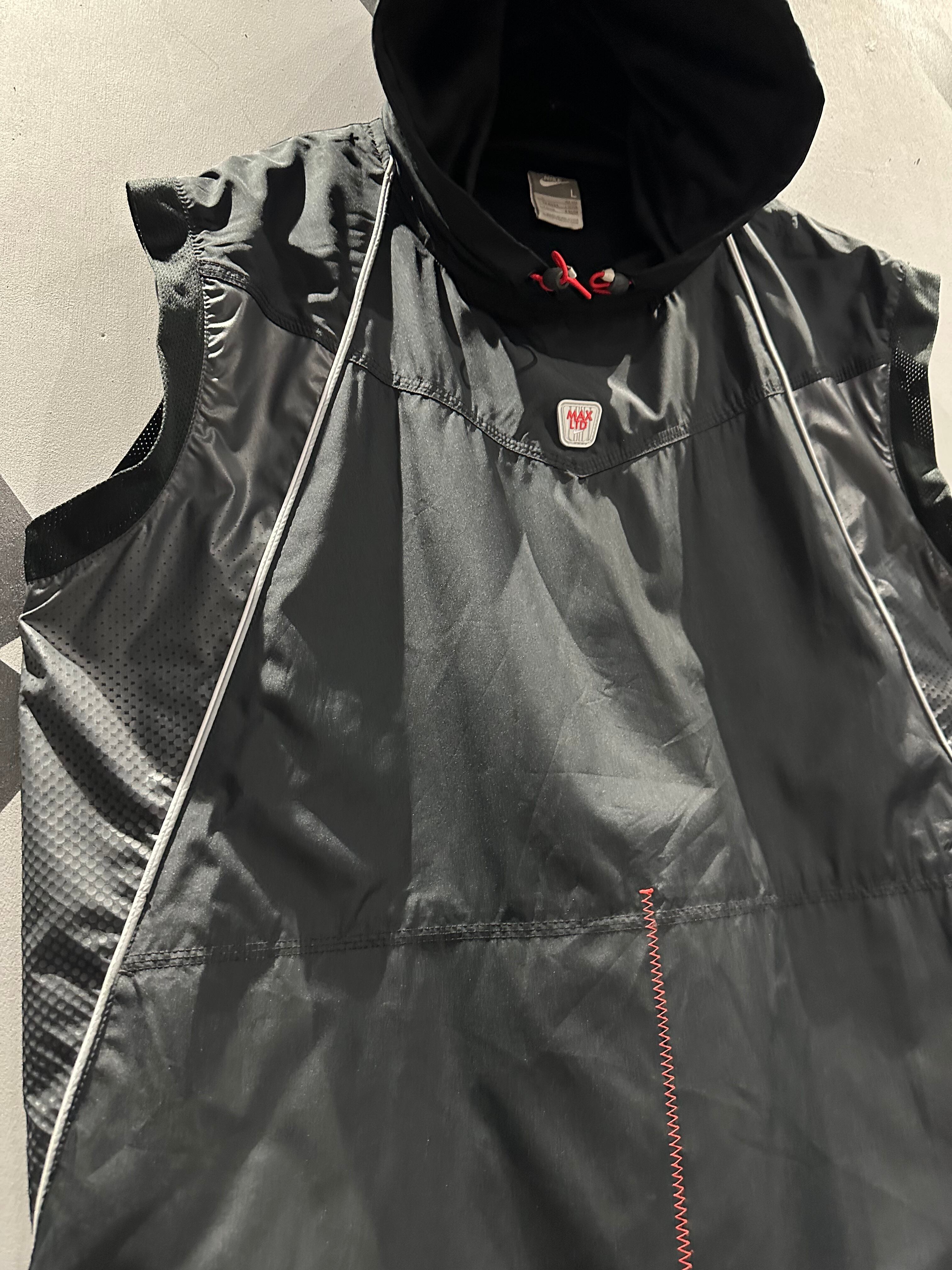 シャリ感のあるポリエステル素材を用いて、グレー×ブラックのカラーリングで切り替えた"NIKE"のベスト。