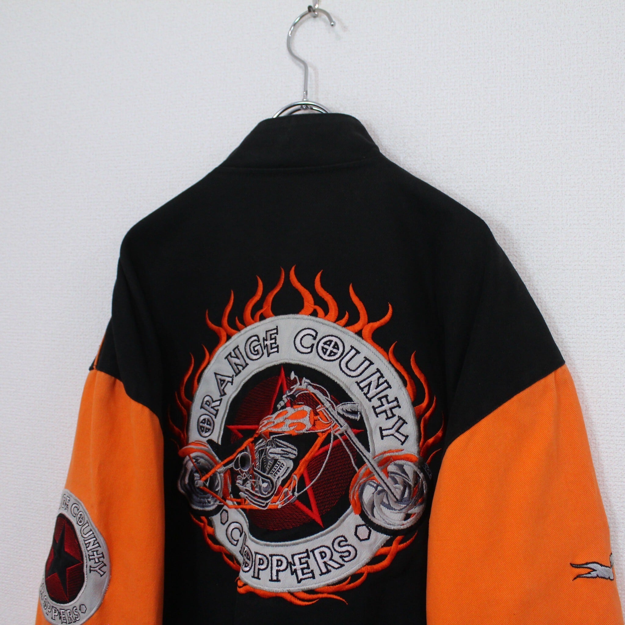 タフなコットン素材をベースに黒×オレンジでカラーを切り替え、メーカーネームとチョッパーのバイクを刺繍によって施したジャケット。バイクのロゴにメーカーネームの頭文字OCCを組み込むという遊び心に惹かれちゃいますよね。