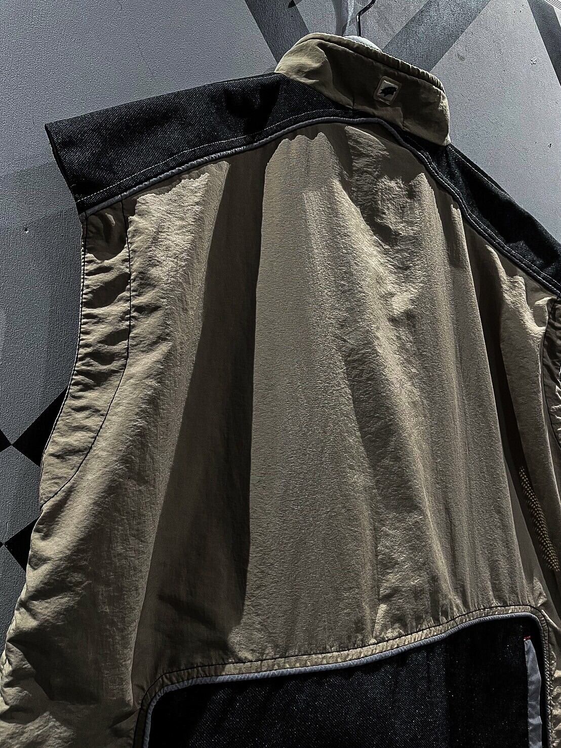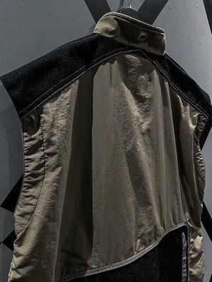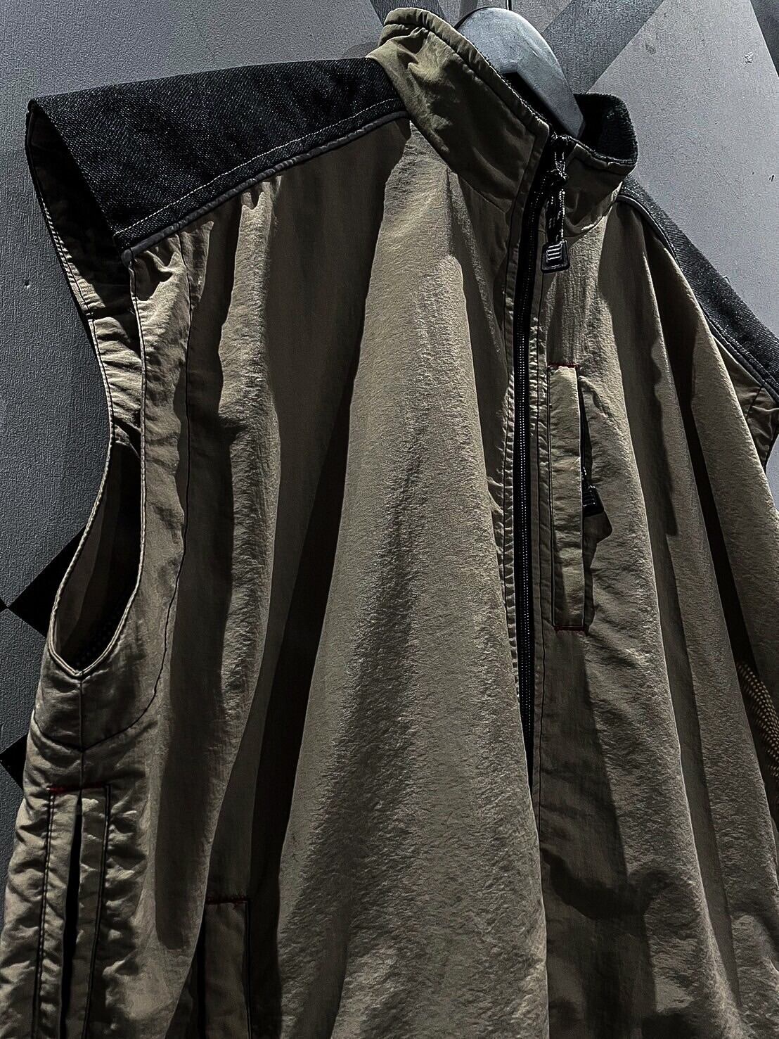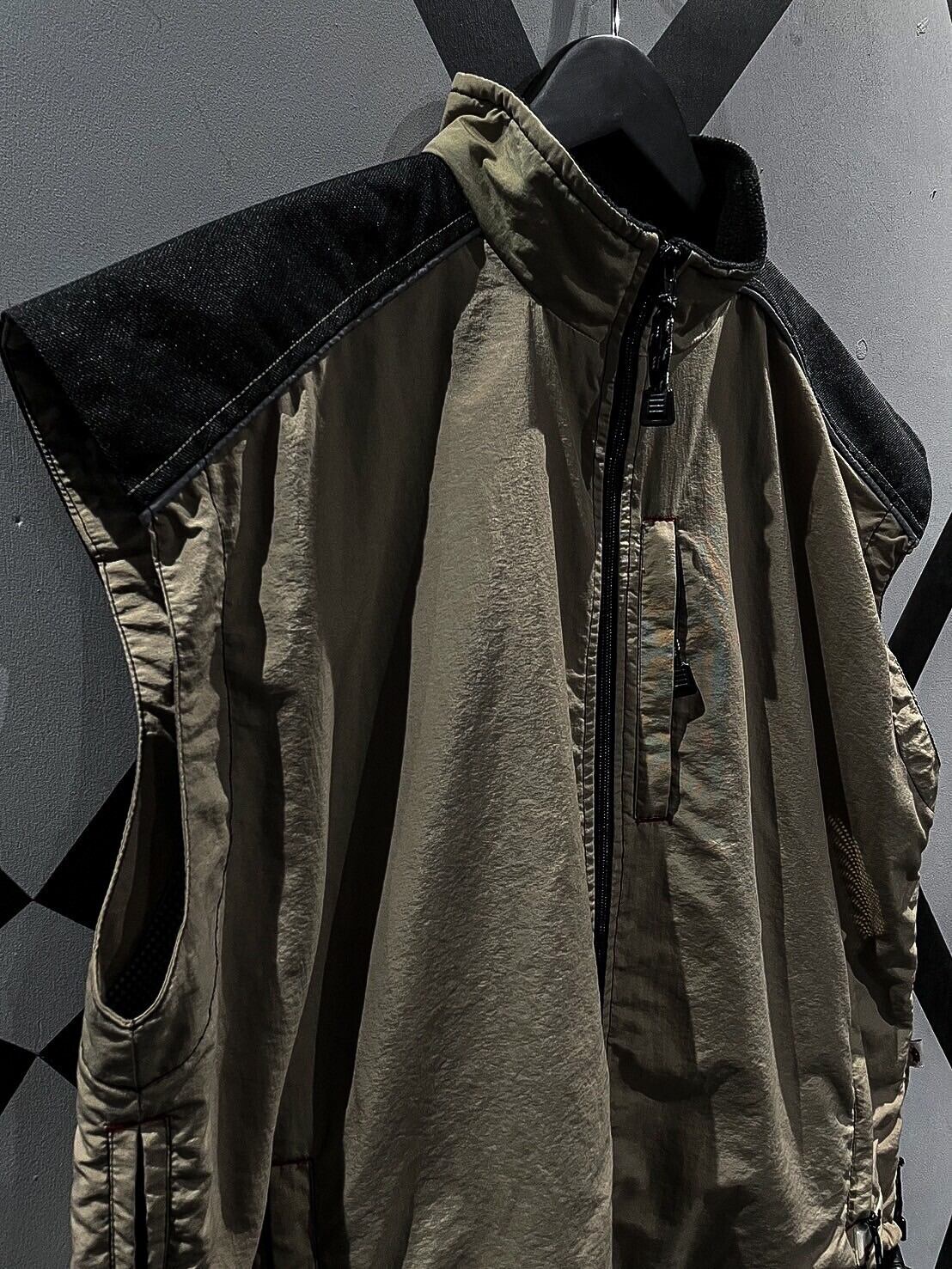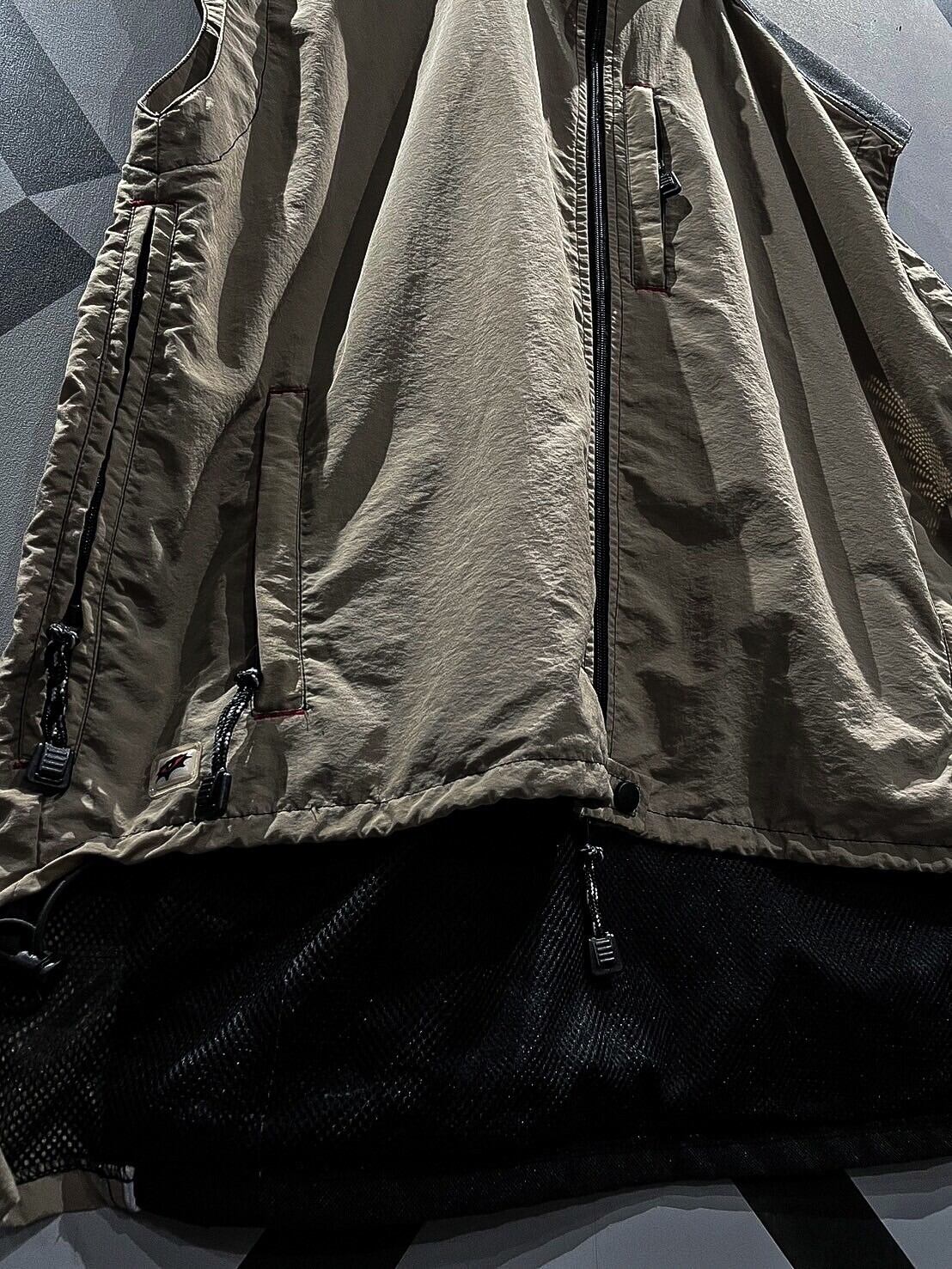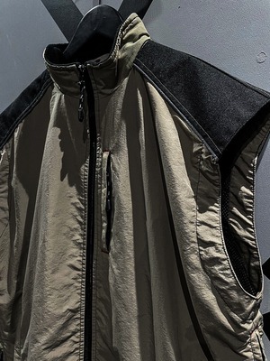 シャリ感のあるナイロン素材をベースに、ショルダー、背面に目の詰まったタフな生地を切り替え、ポケットのギミックを載せたベスト。