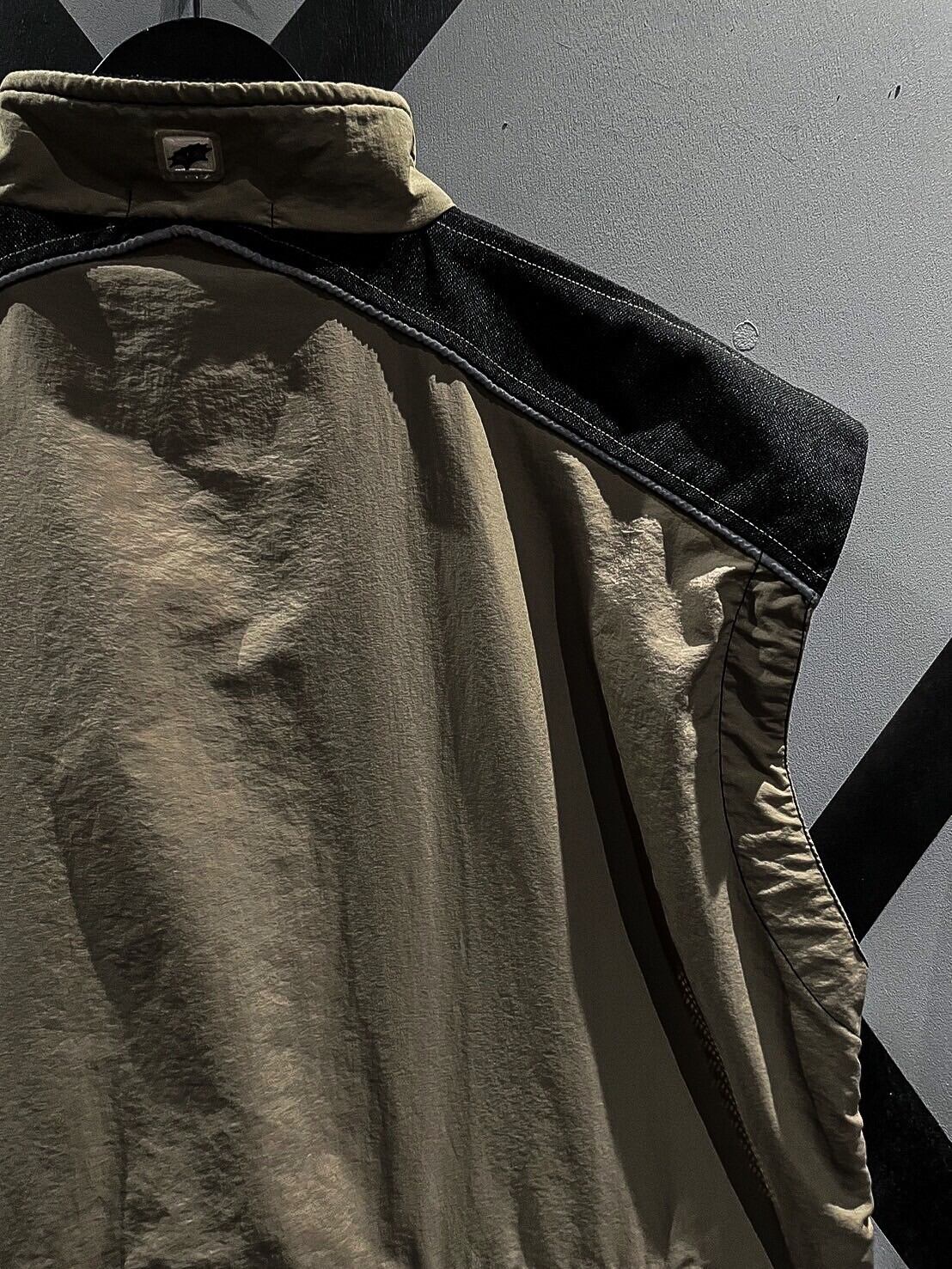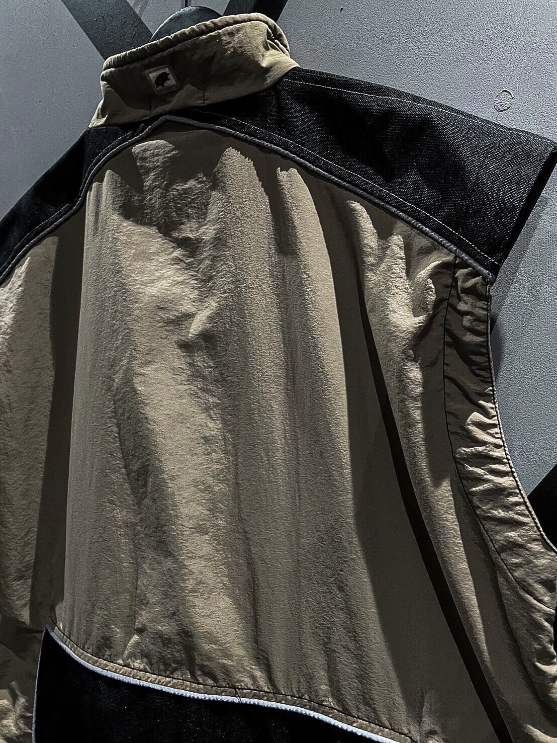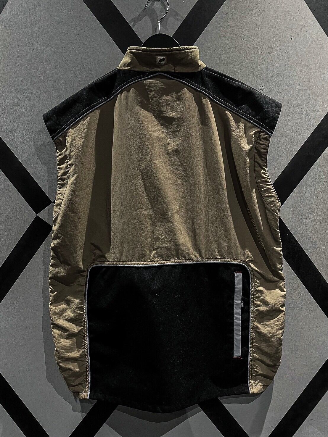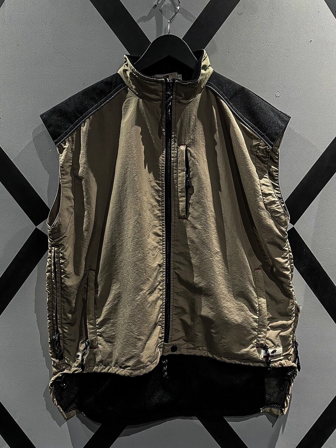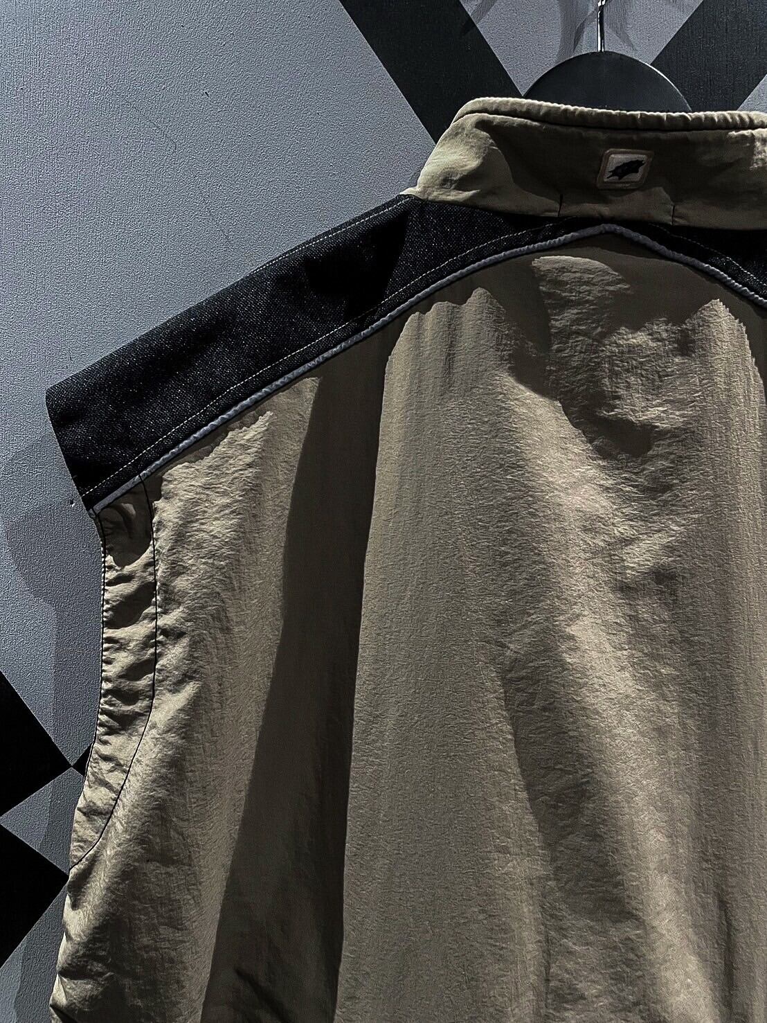 シャリ感のあるナイロン素材をベースに、ショルダー、背面に目の詰まったタフな生地を切り替え、ポケットのギミックを載せたベスト。