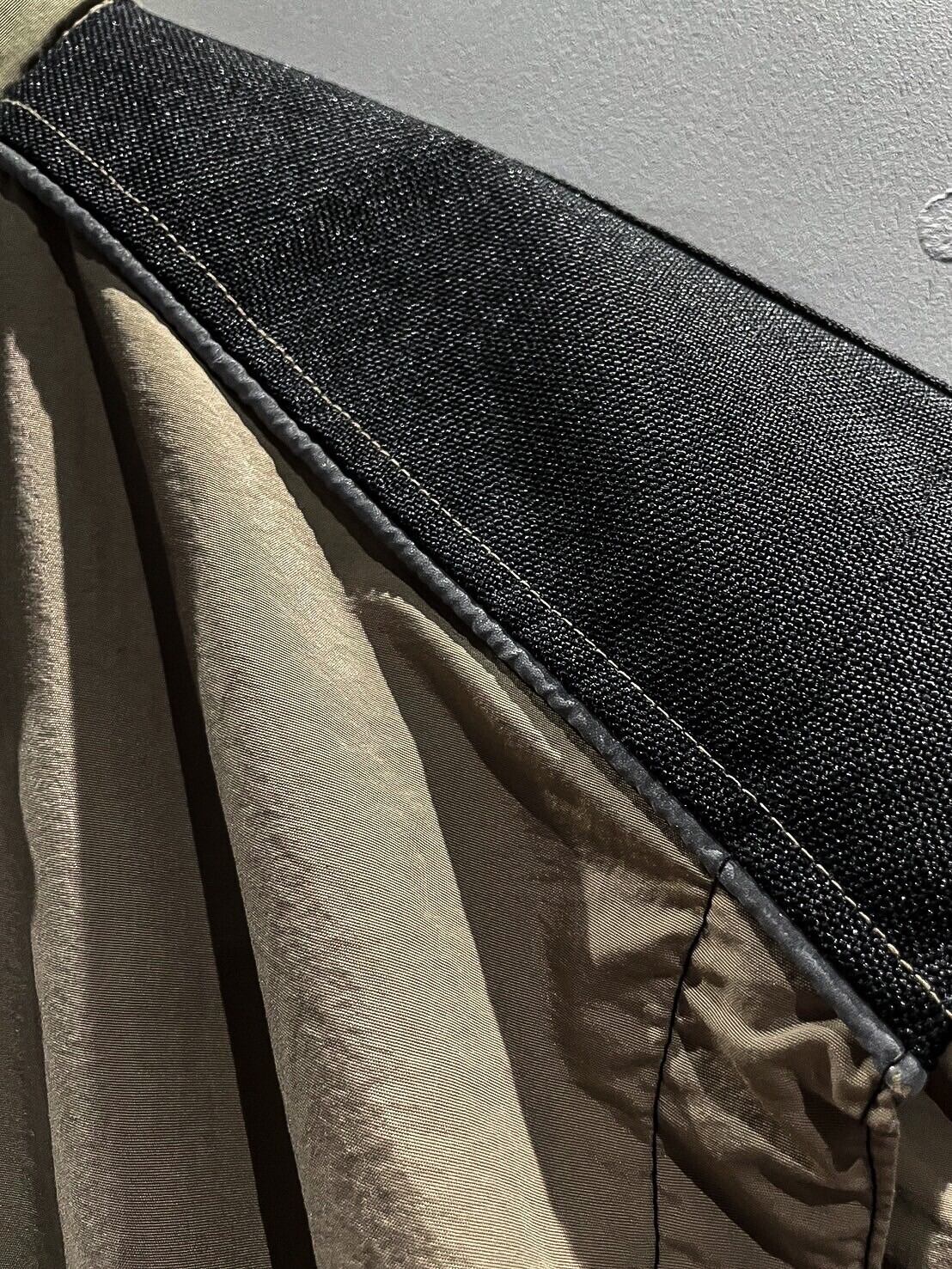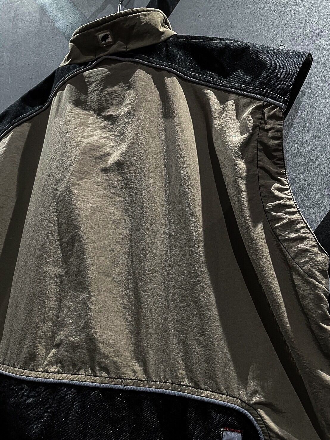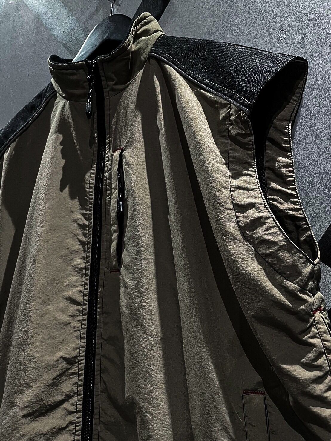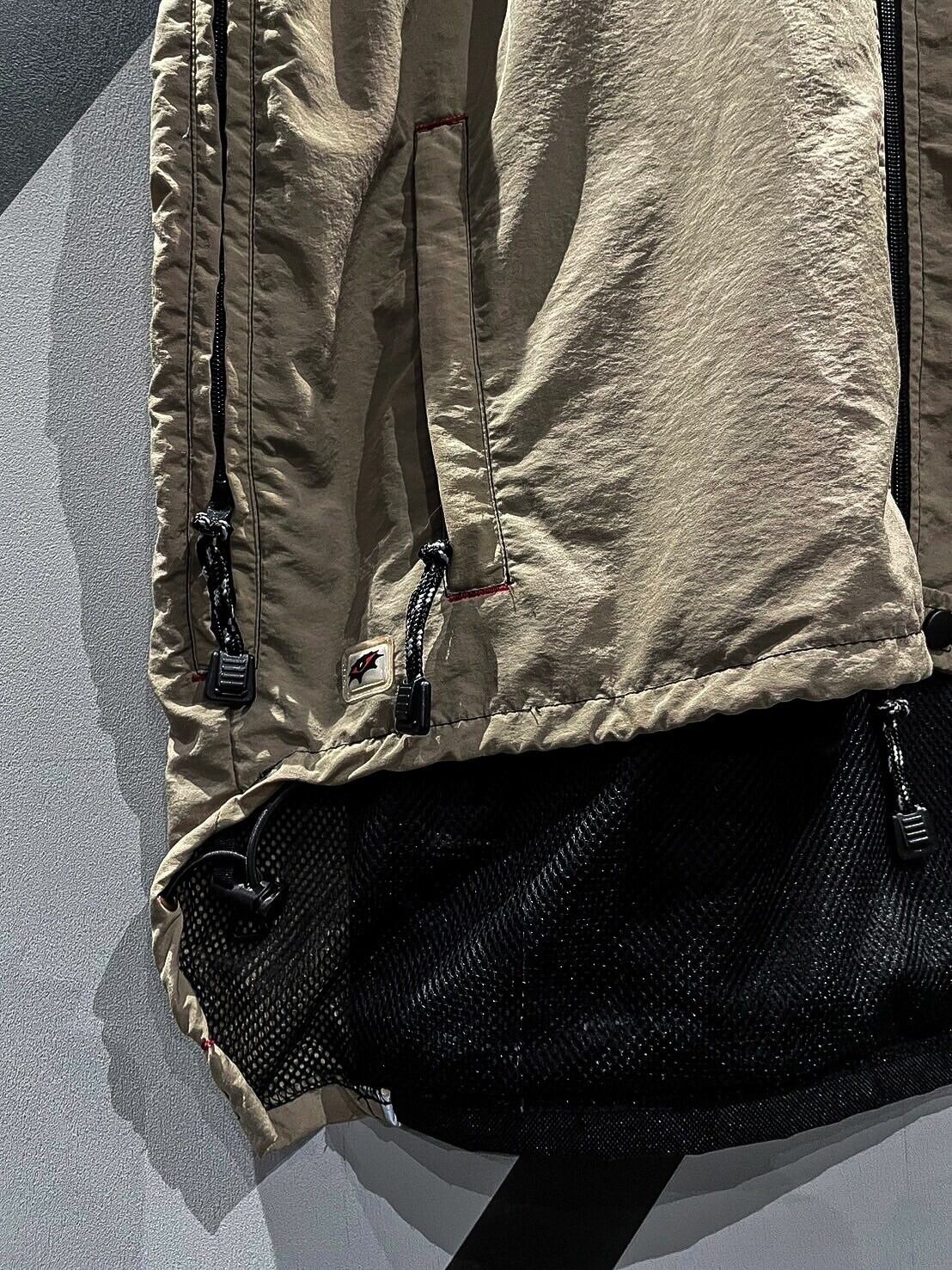 シャリ感のあるナイロン素材をベースに、ショルダー、背面に目の詰まったタフな生地を切り替え、ポケットのギミックを載せたベスト。