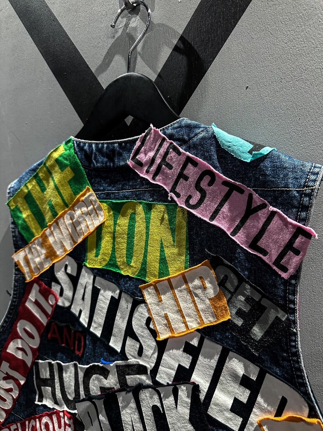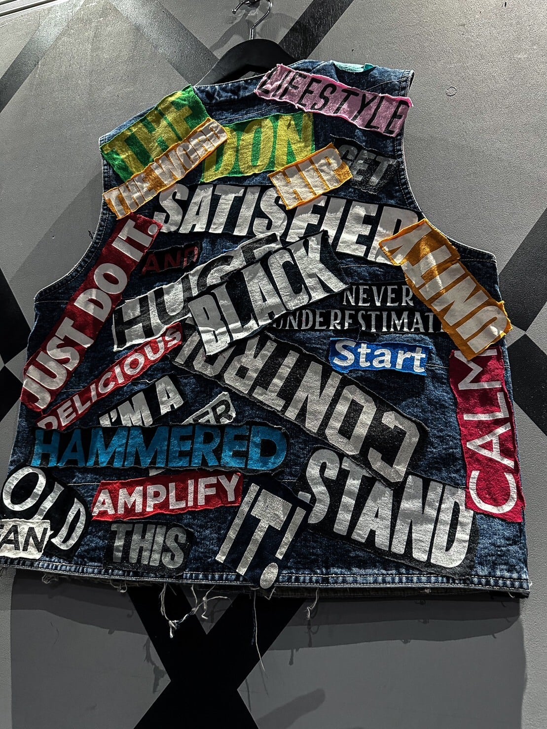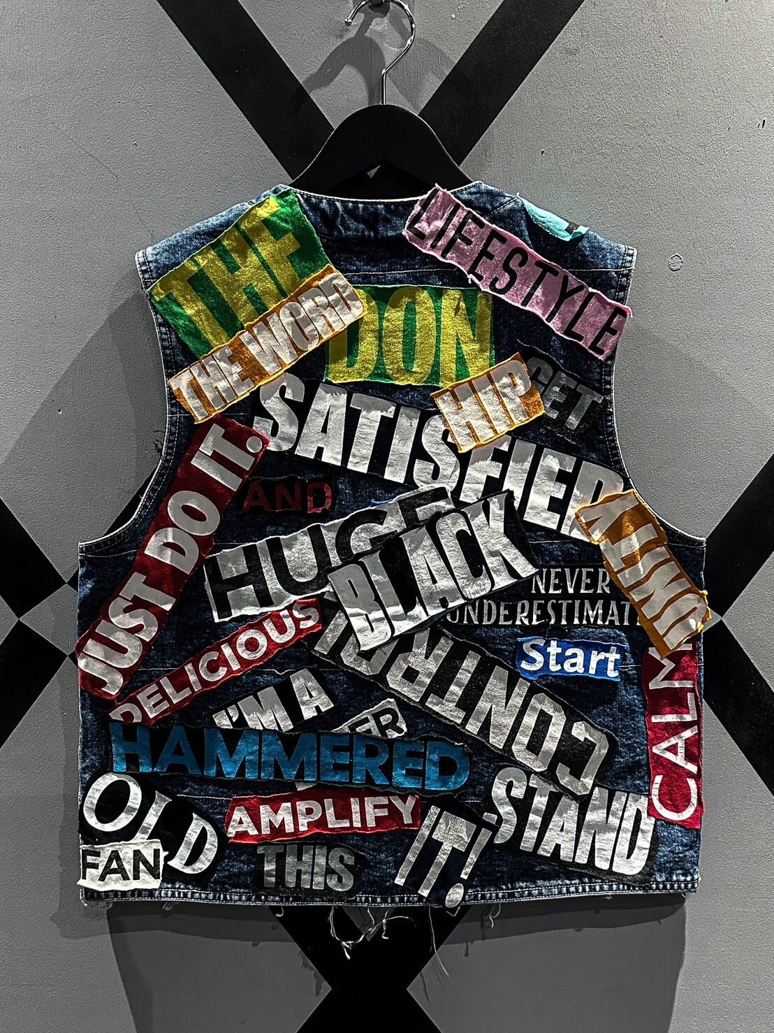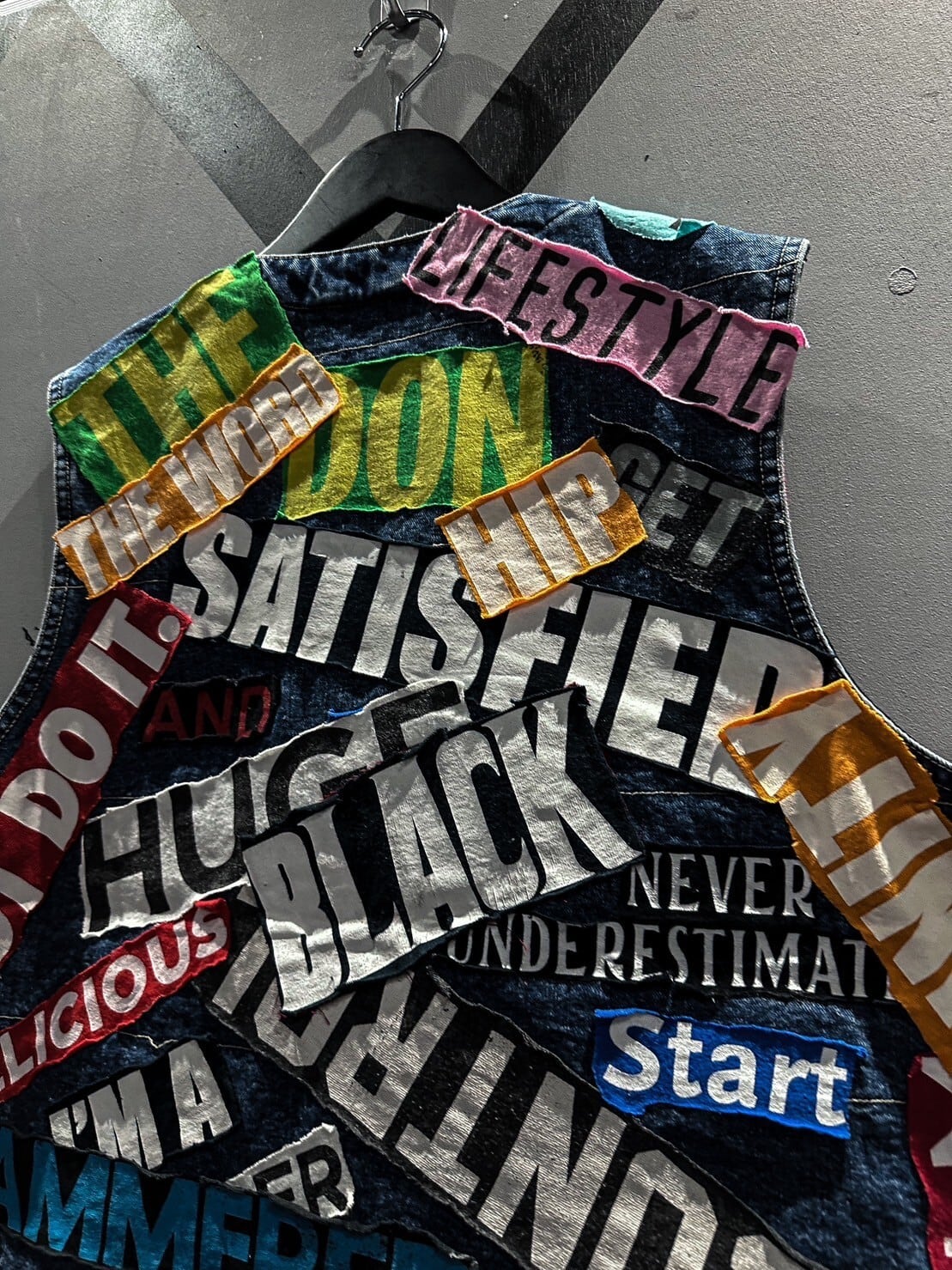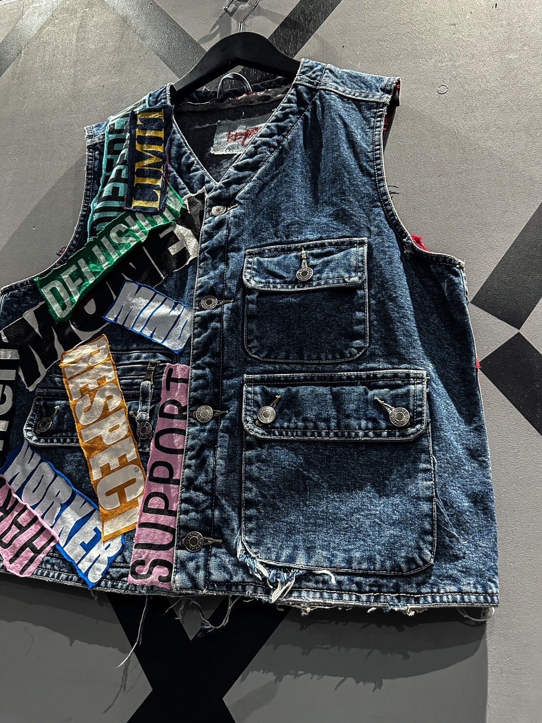 アタリの効いたインディゴブルーのデニムベストに、様々なワードをスクラップして貼り付けた、前所有者のカスタムセンスが光る1着。