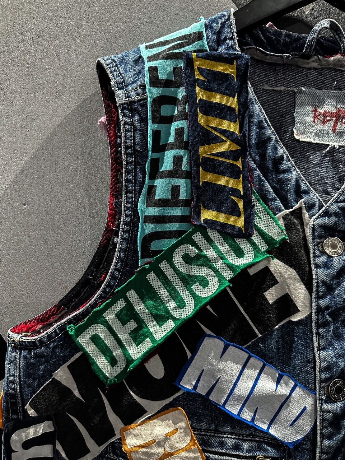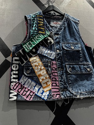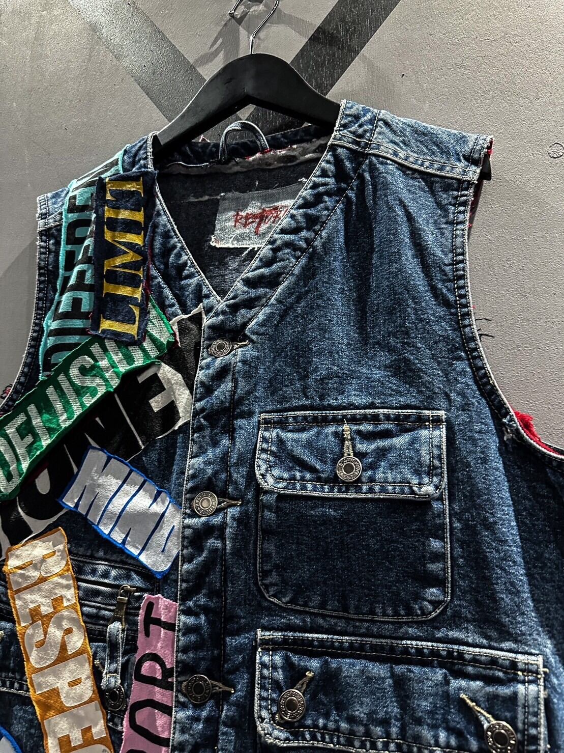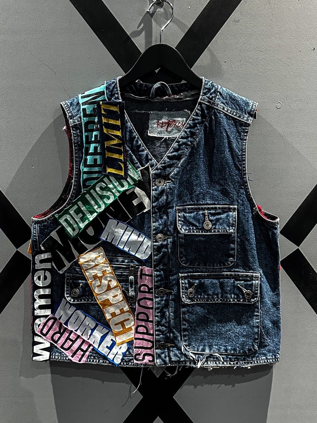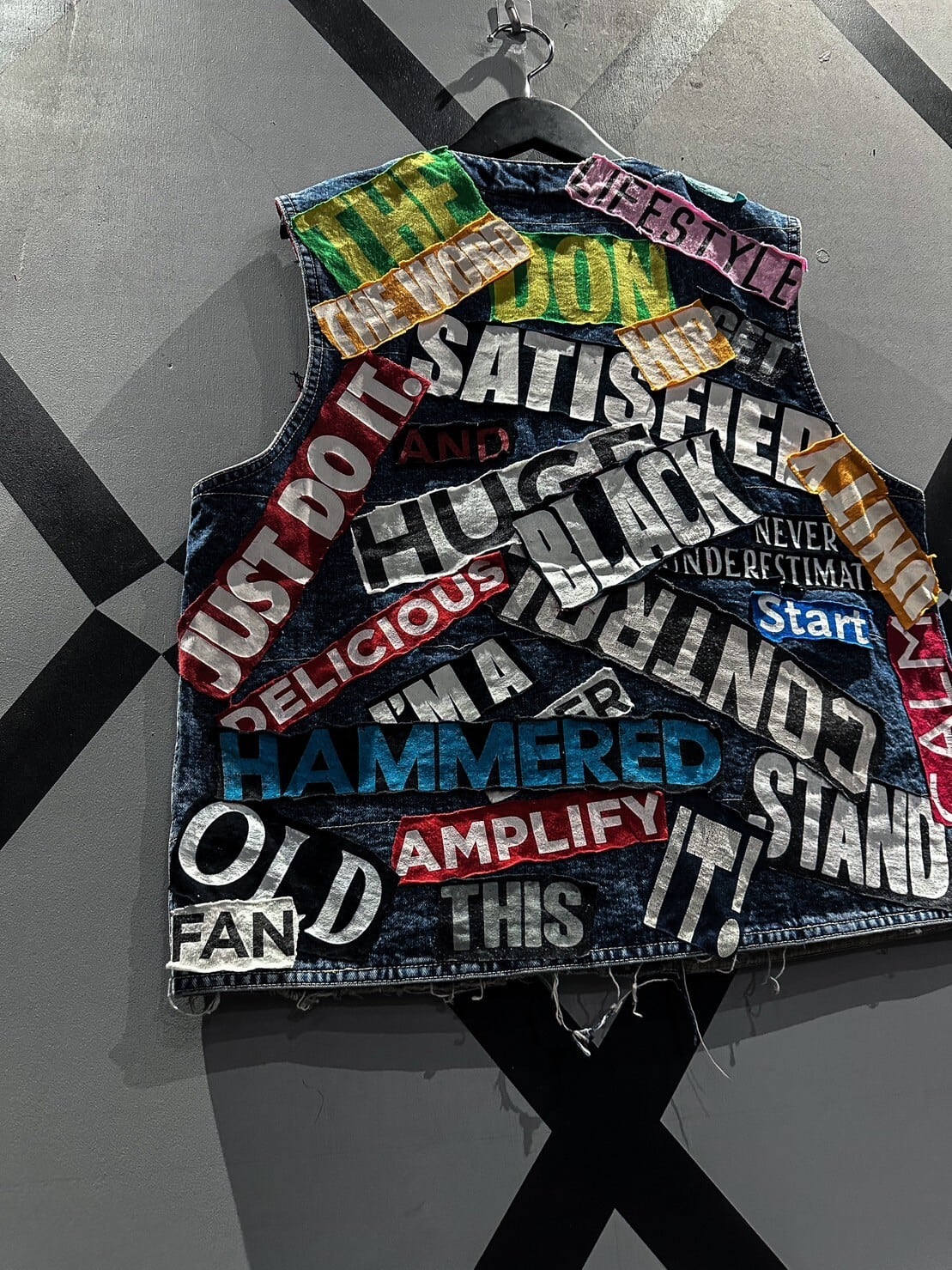 アタリの効いたインディゴブルーのデニムベストに、様々なワードをスクラップして貼り付けた、前所有者のカスタムセンスが光る1着。