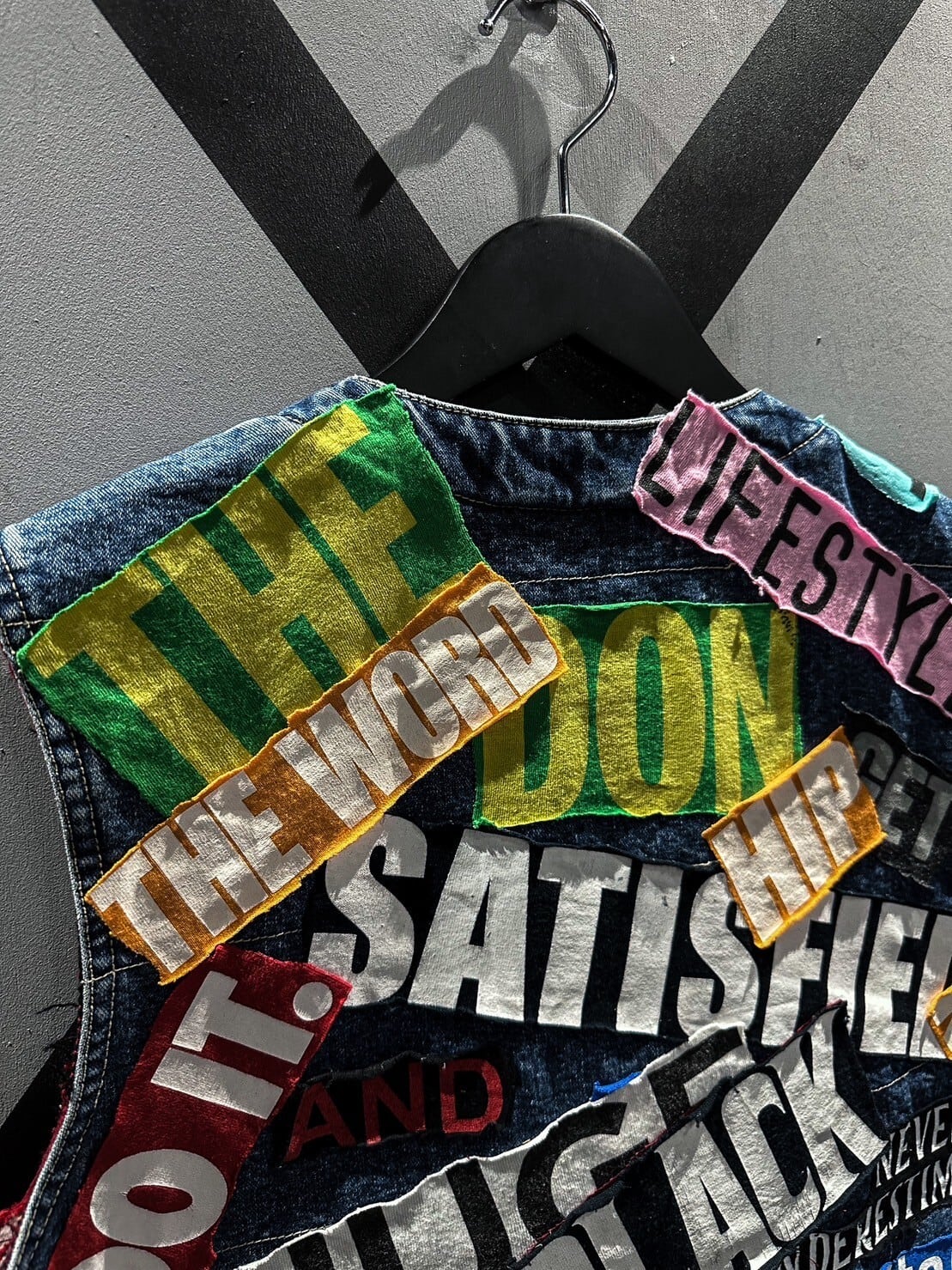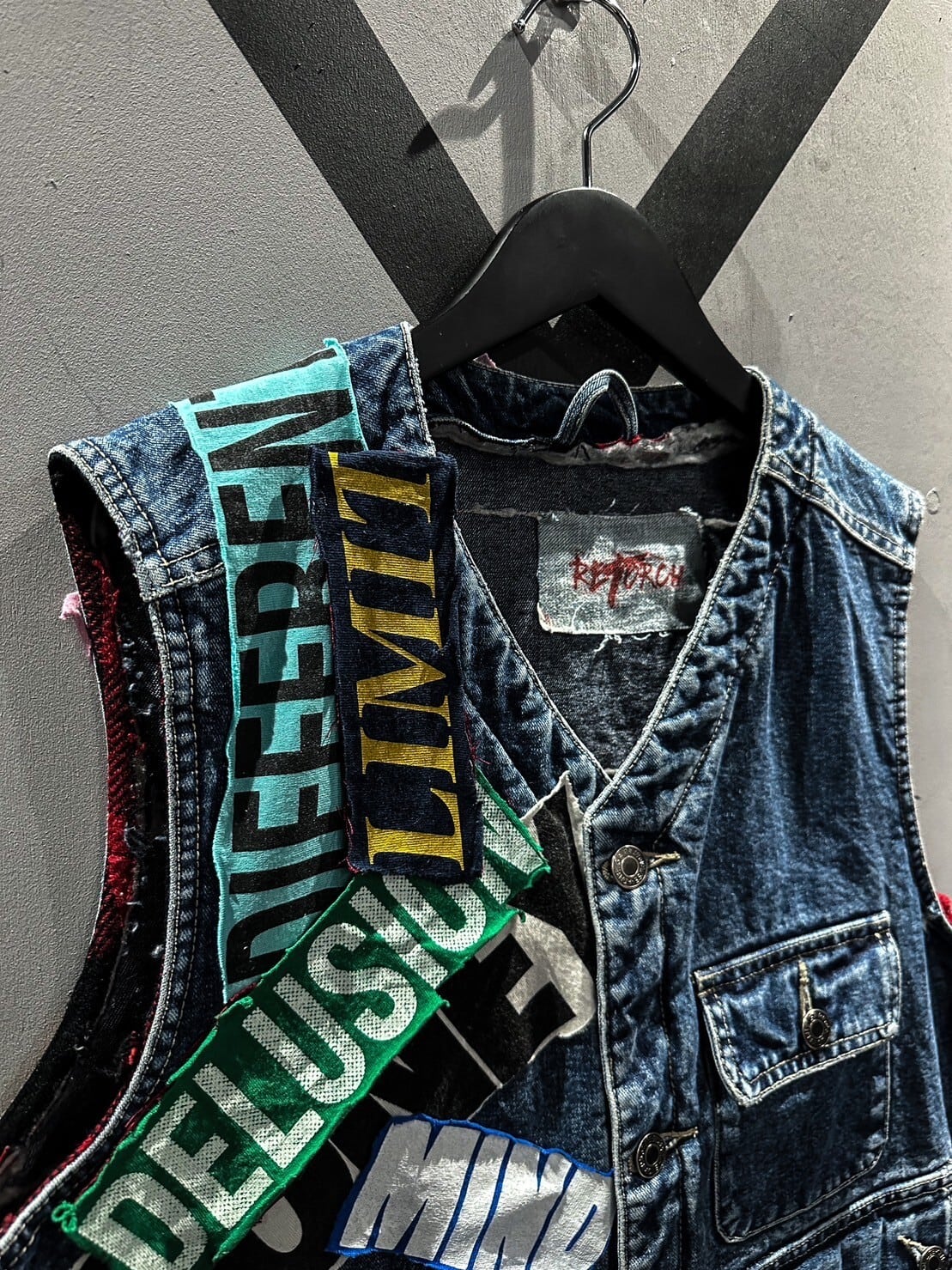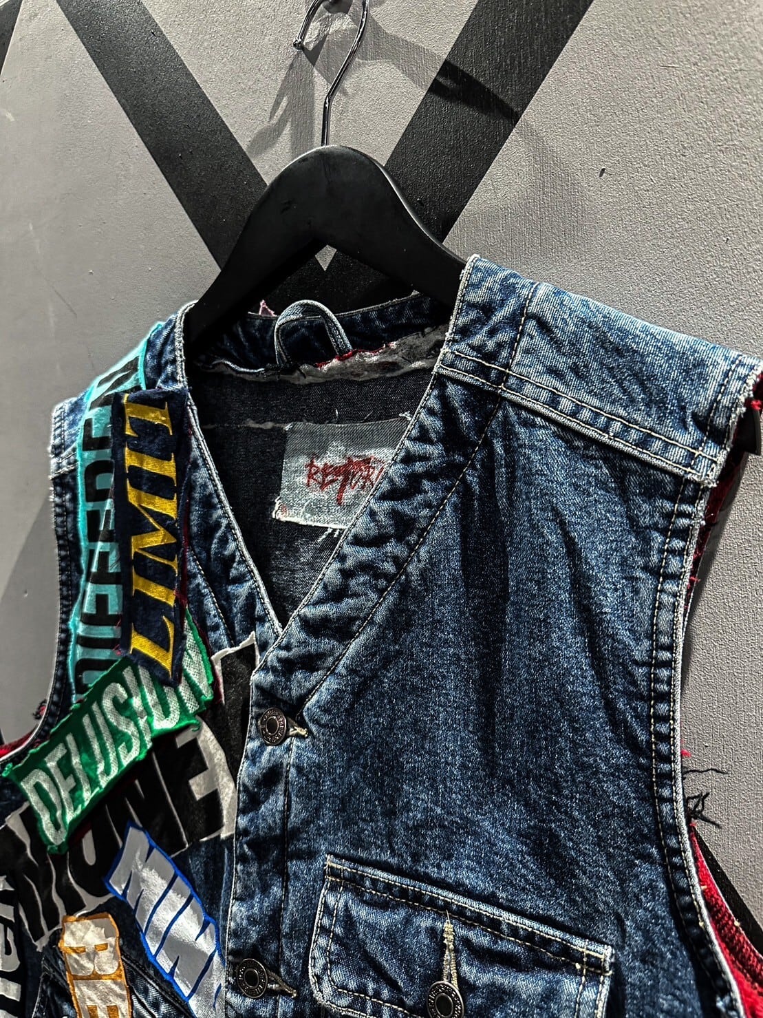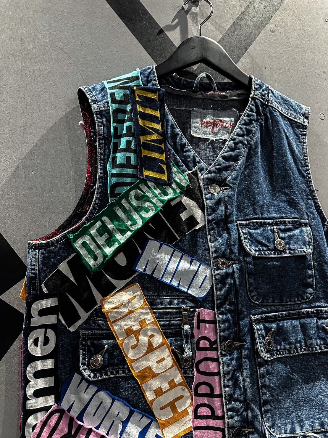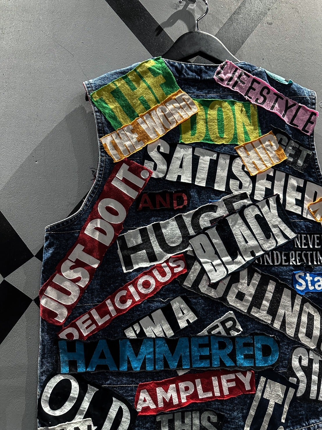 アタリの効いたインディゴブルーのデニムベストに、様々なワードをスクラップして貼り付けた、前所有者のカスタムセンスが光る1着。