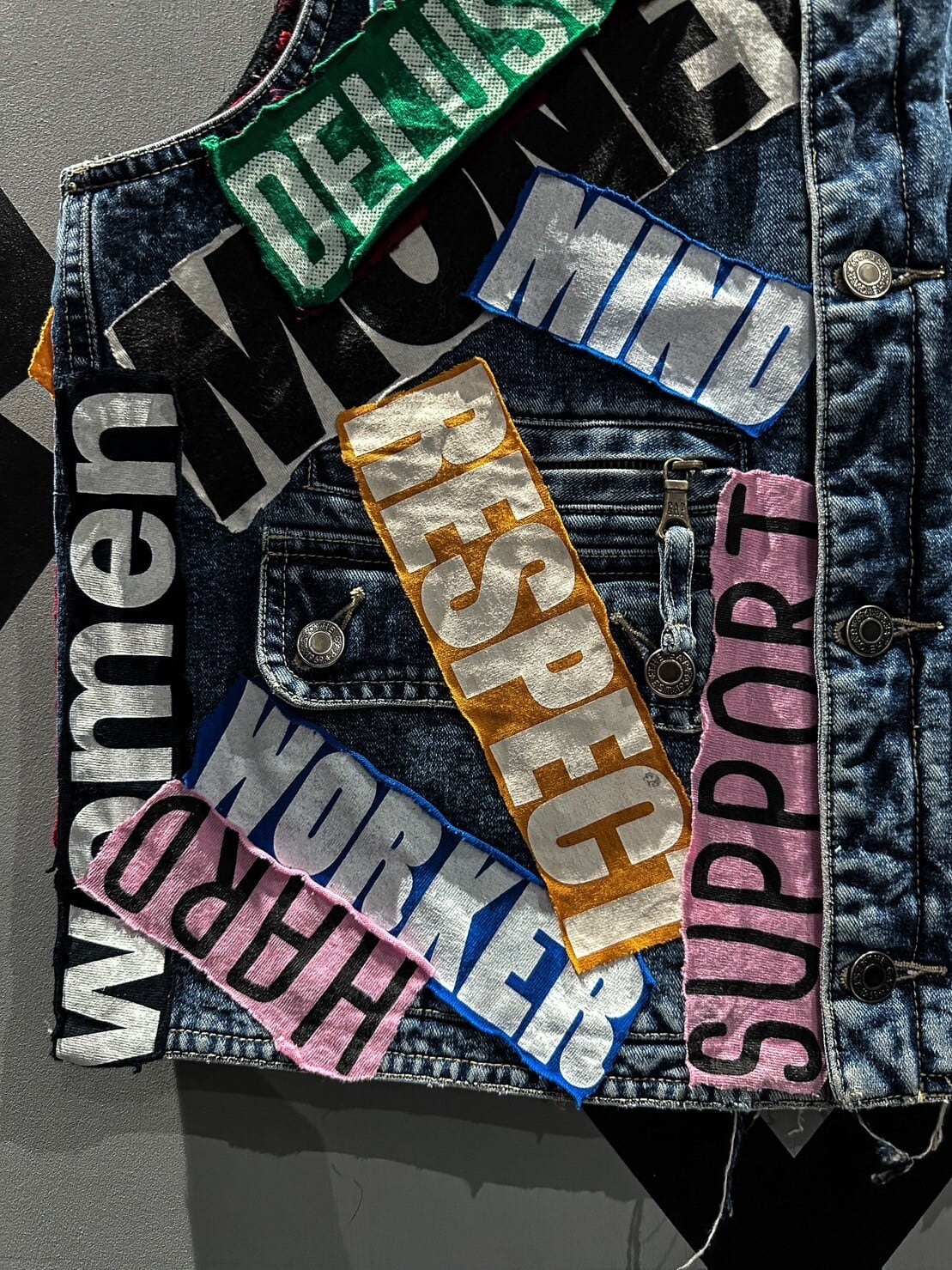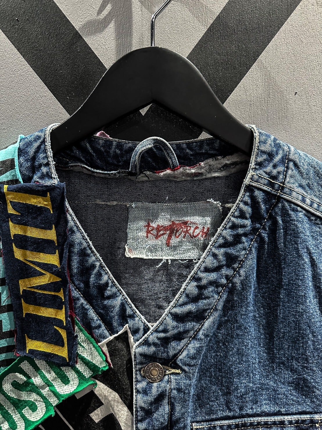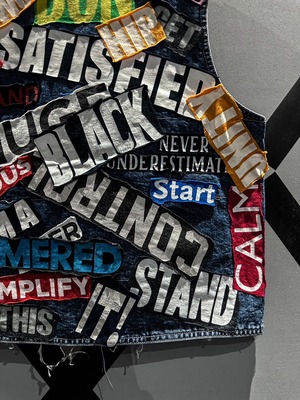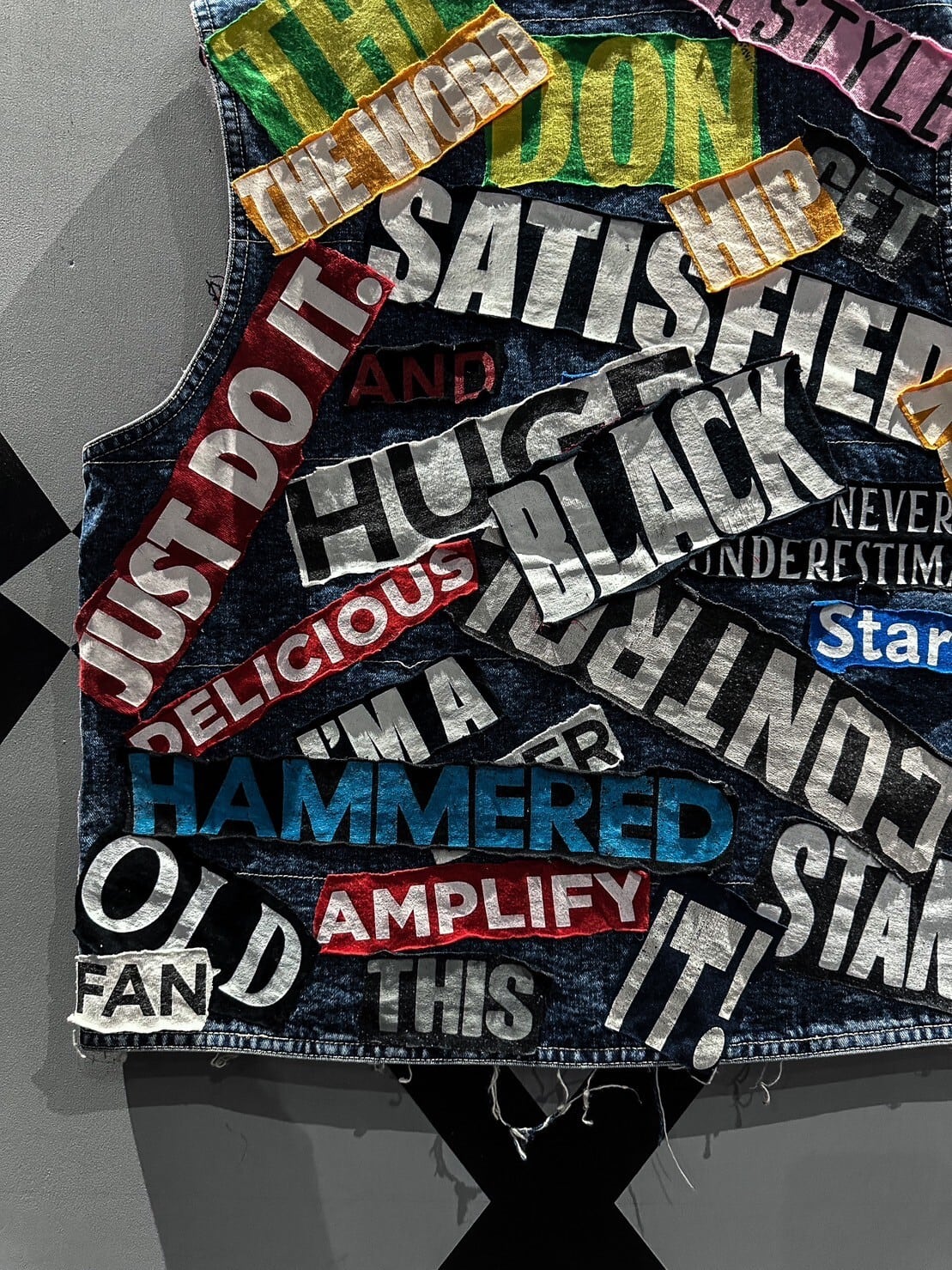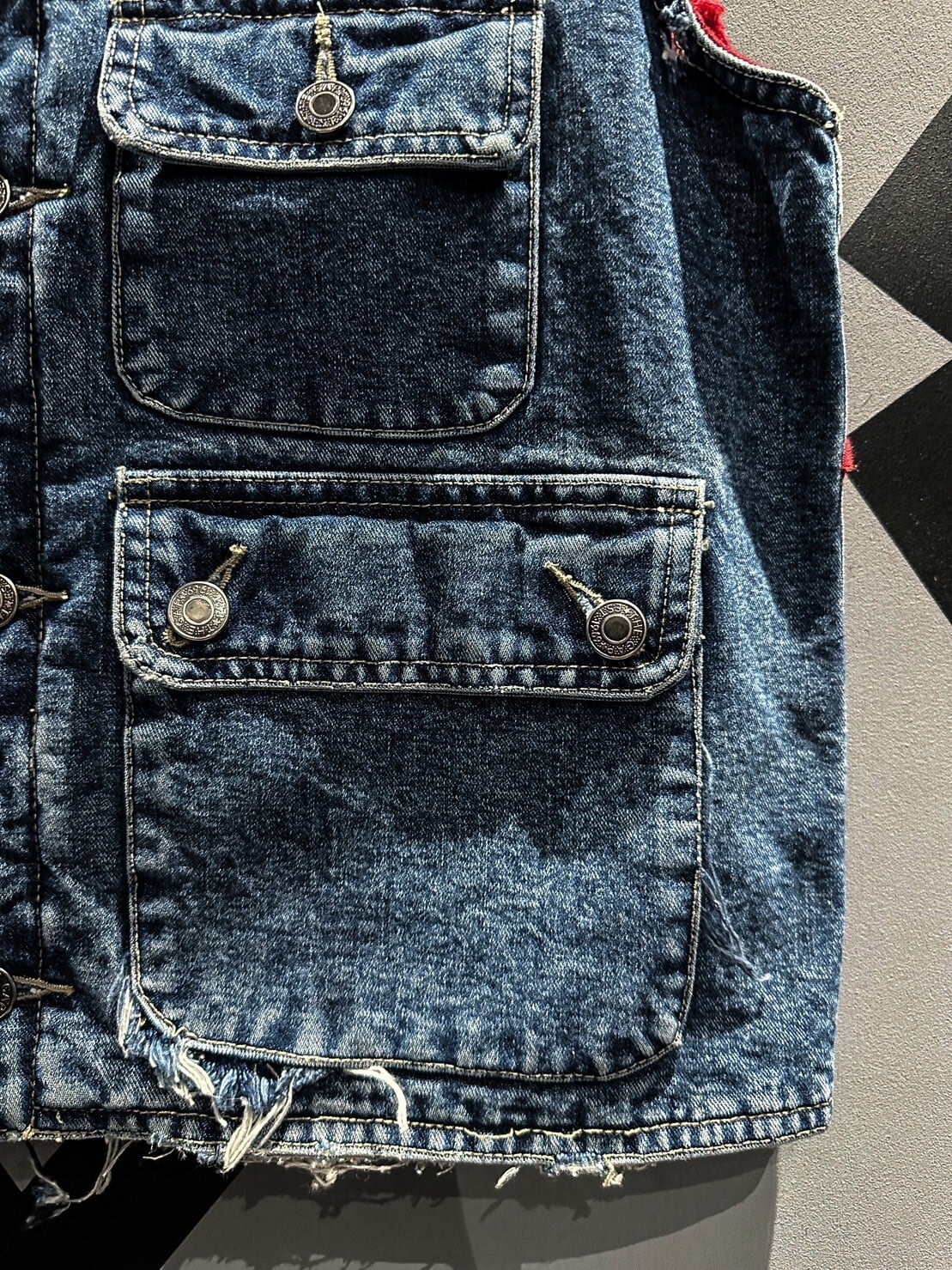 アタリの効いたインディゴブルーのデニムベストに、様々なワードをスクラップして貼り付けた、前所有者のカスタムセンスが光る1着。