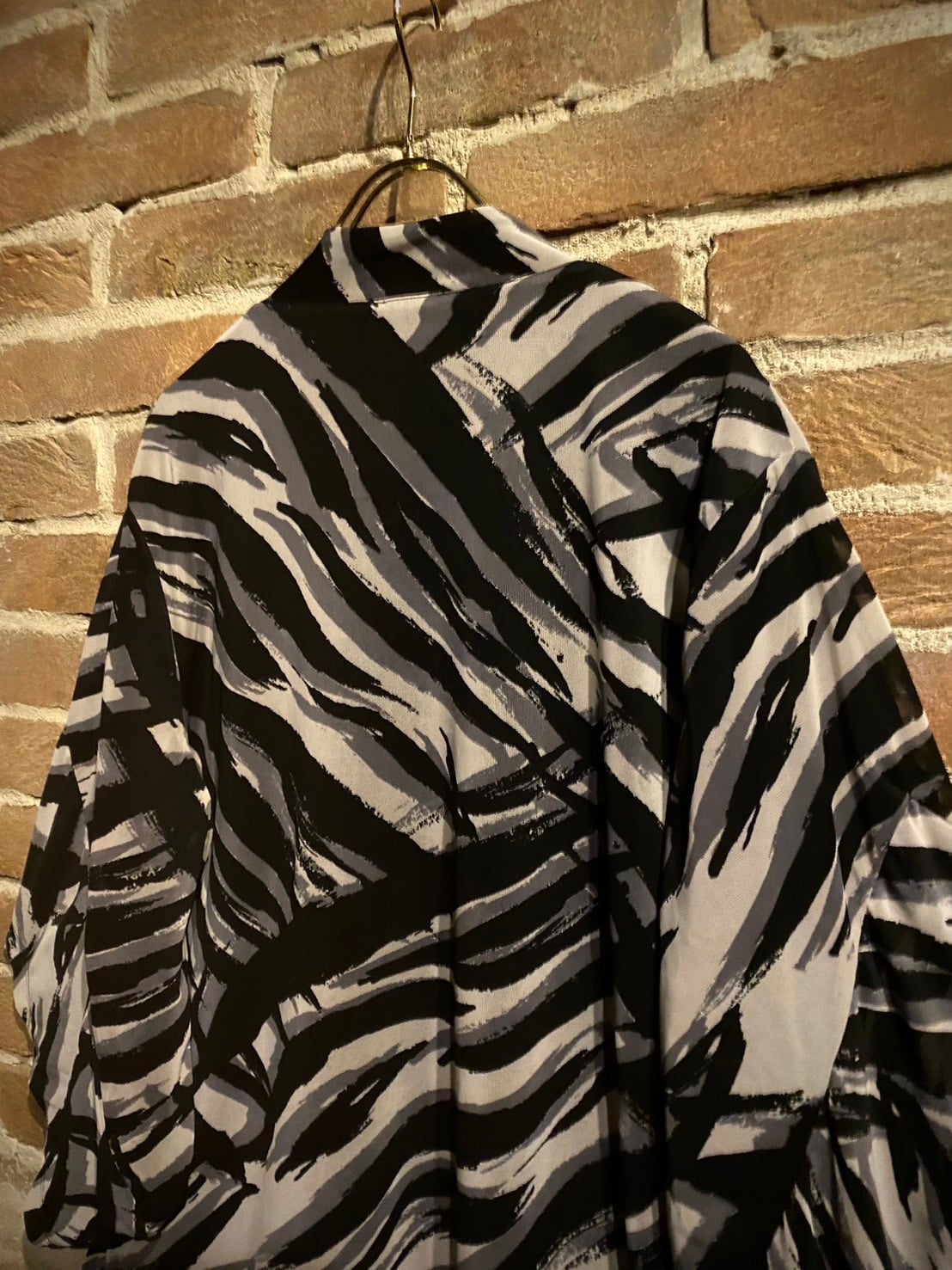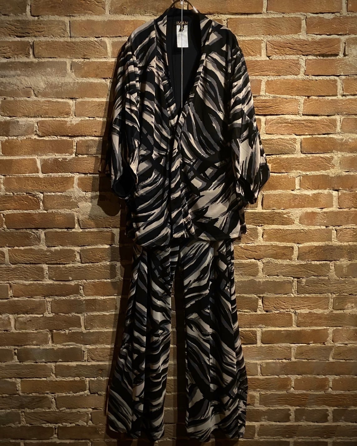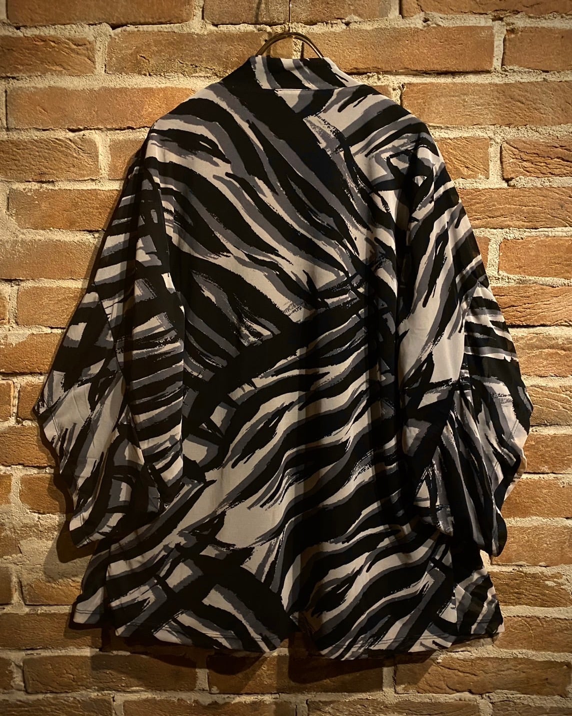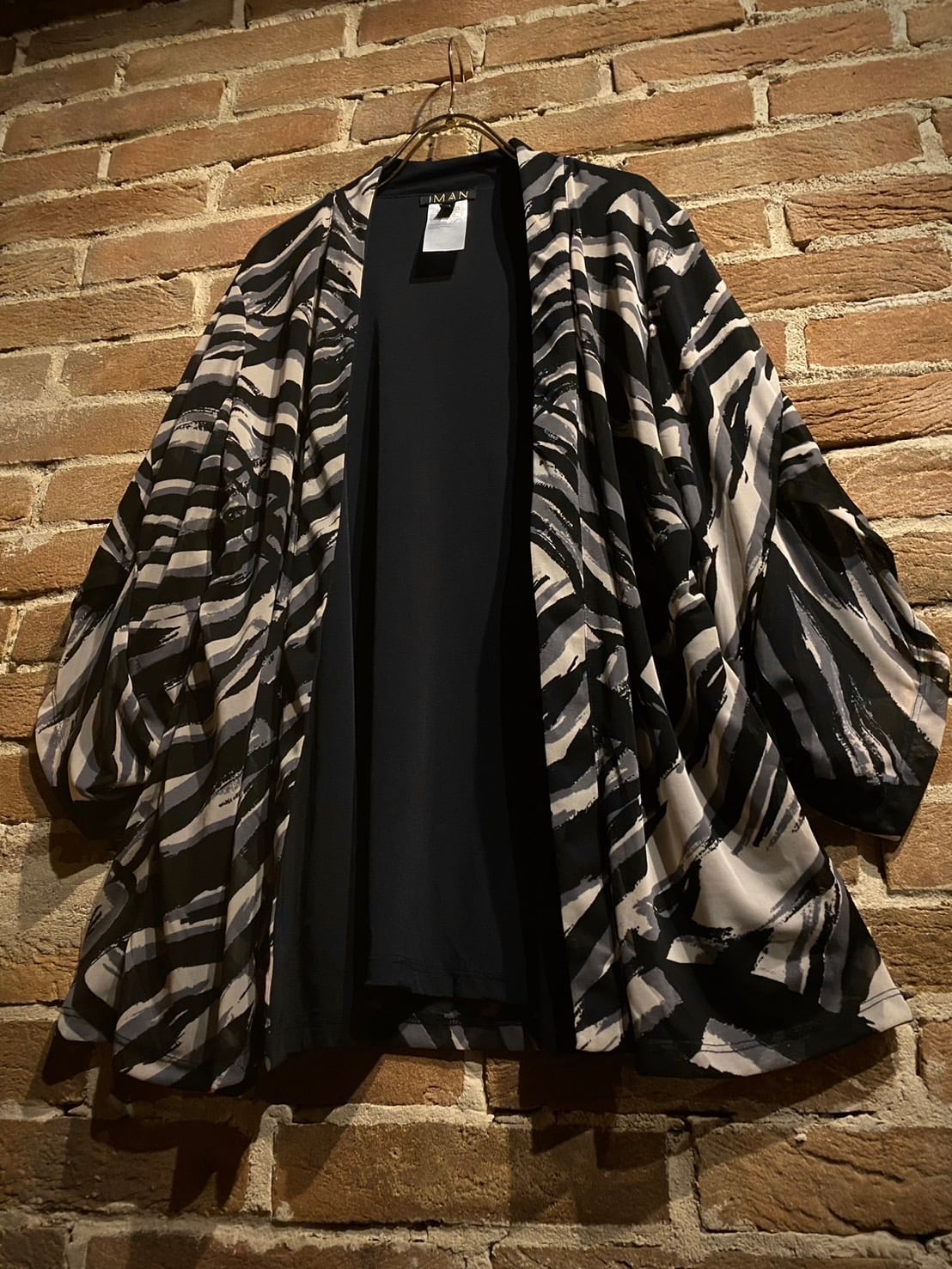 フワッと軽いポリエステル素材を用いて、モノトーンでゼブラ柄を載せた稀有な羽織のセットアップ。