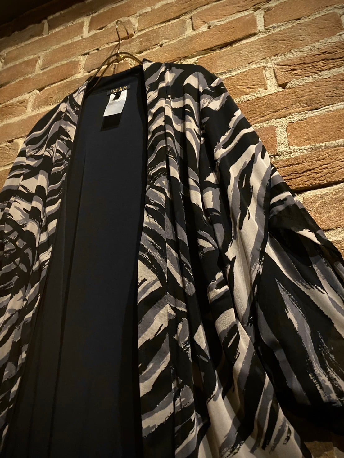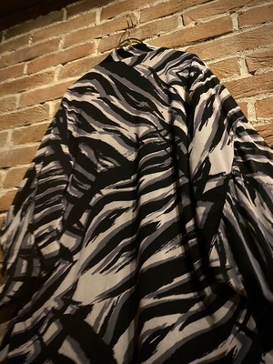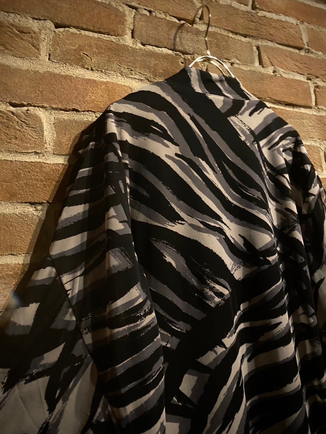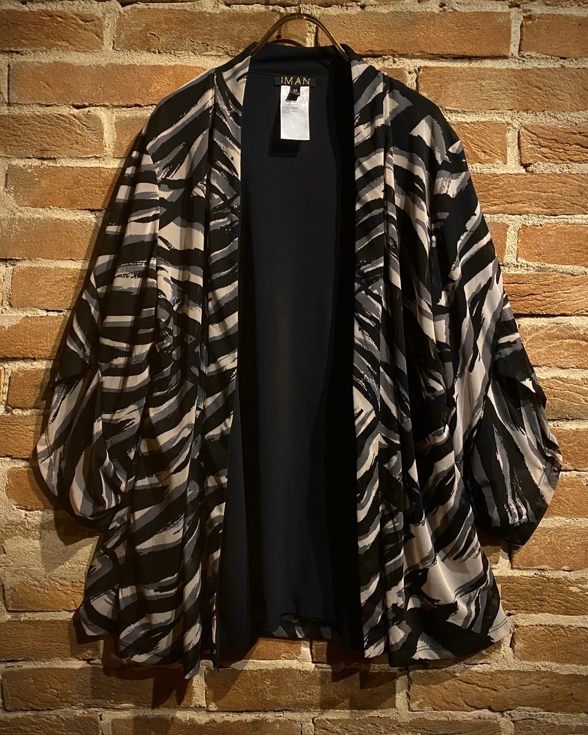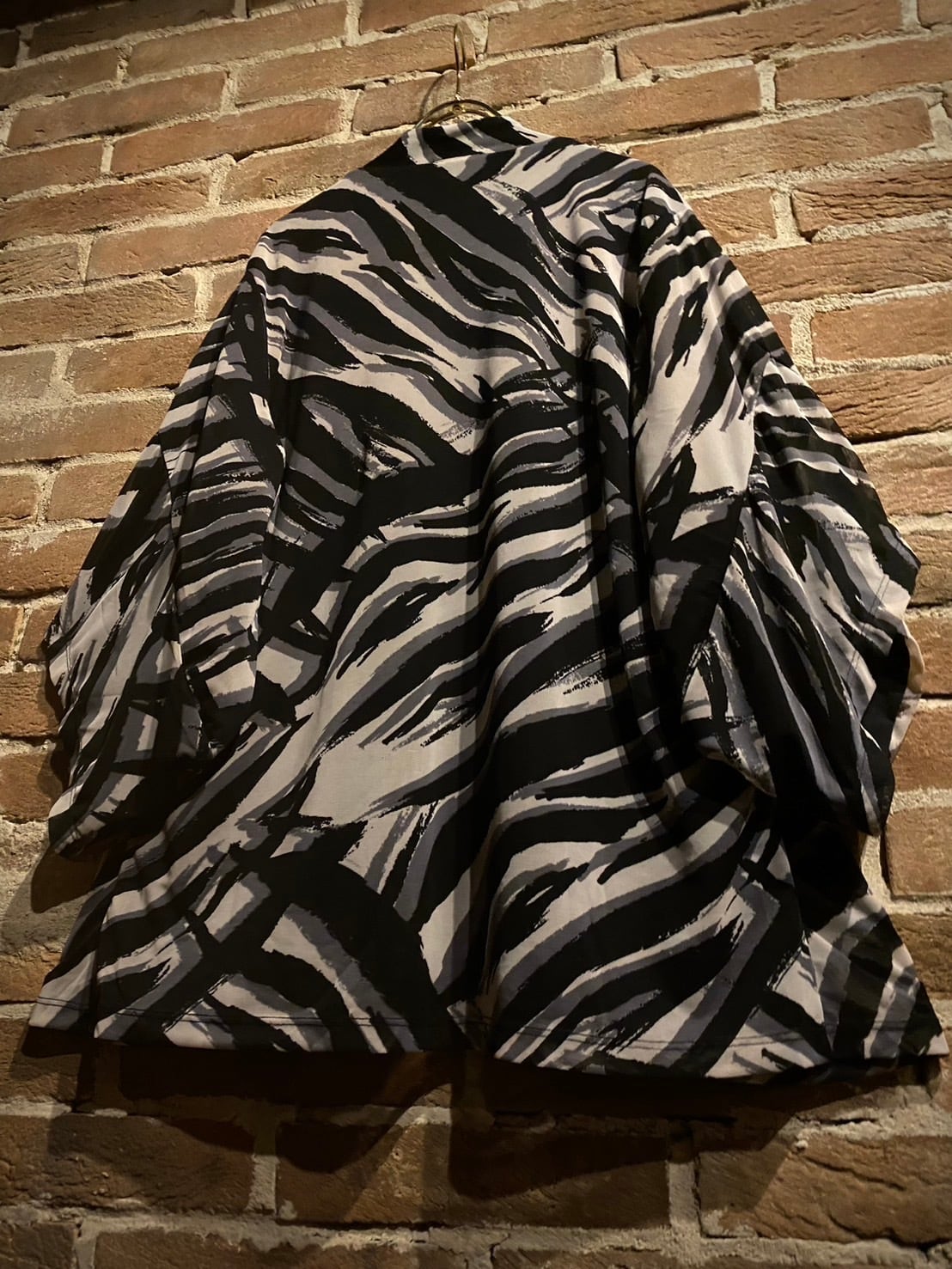 フワッと軽いポリエステル素材を用いて、モノトーンでゼブラ柄を載せた稀有な羽織のセットアップ。