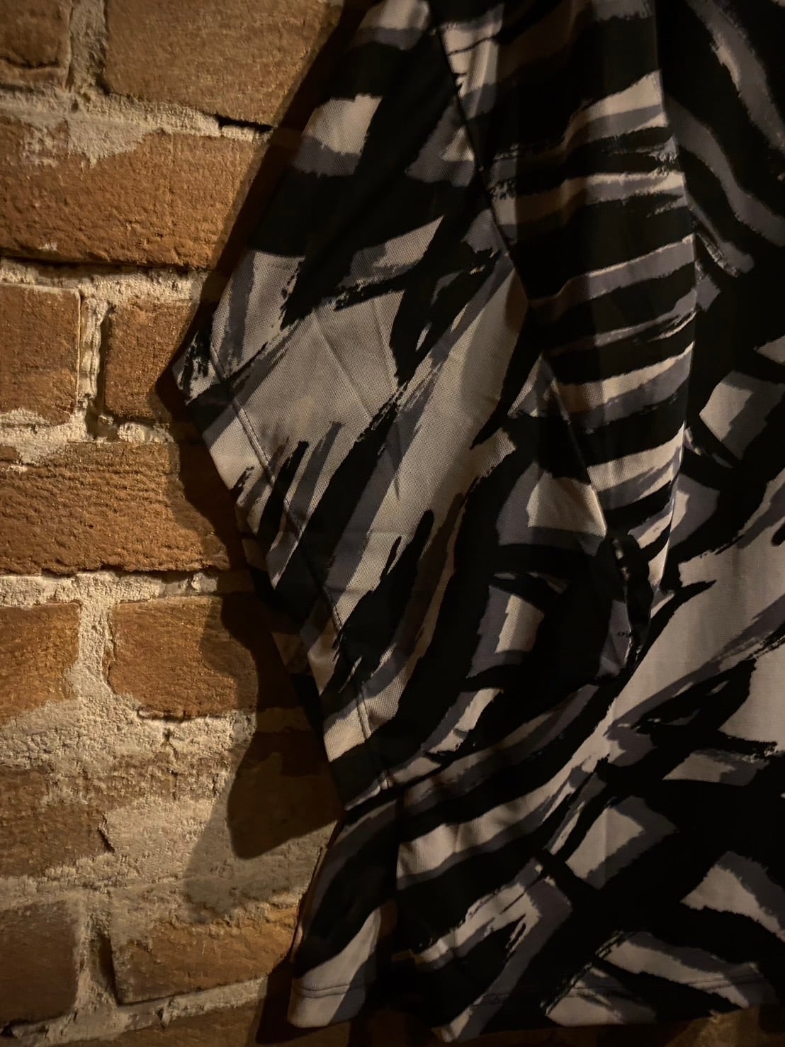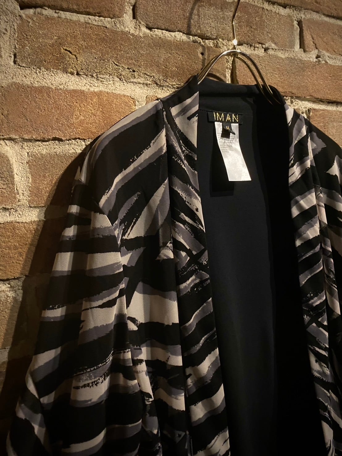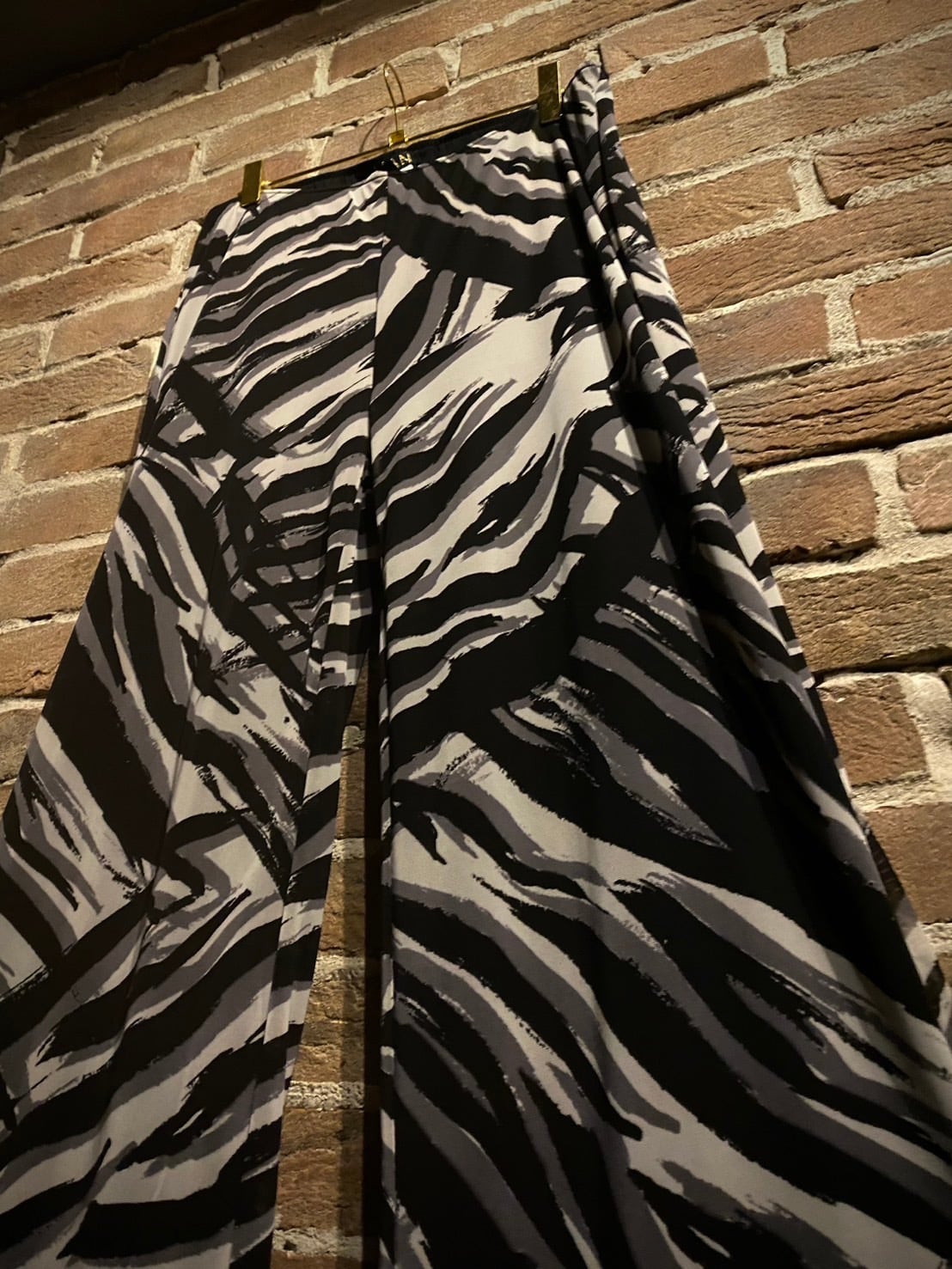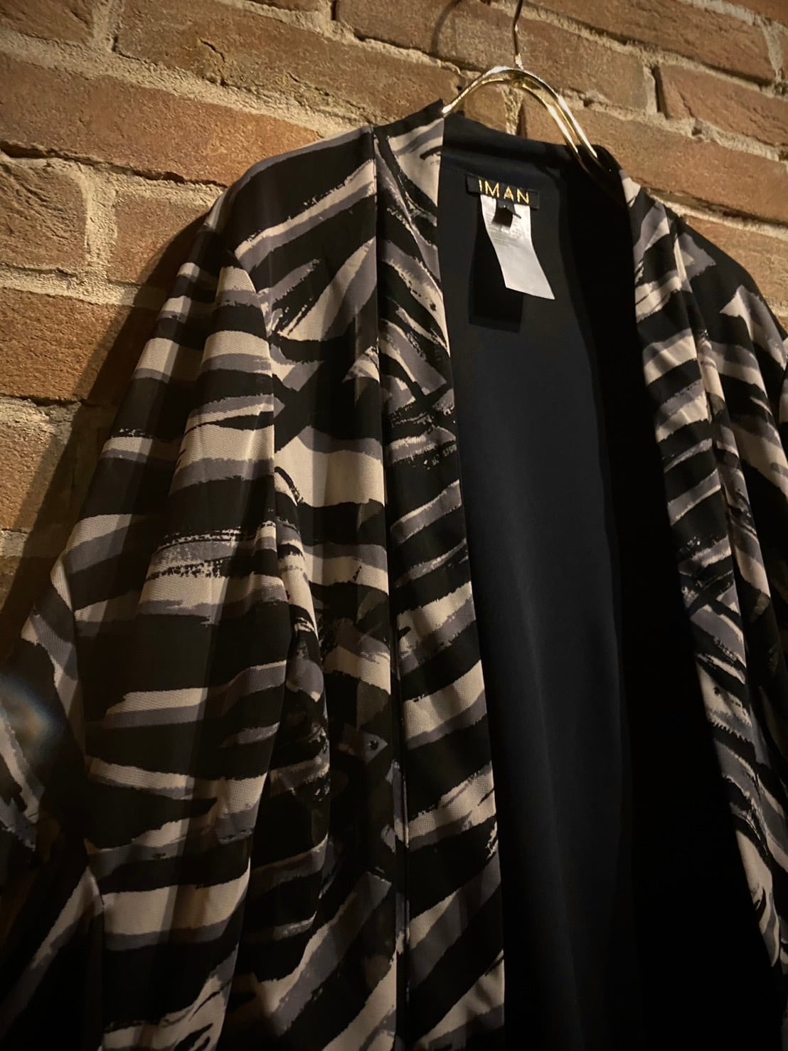 フワッと軽いポリエステル素材を用いて、モノトーンでゼブラ柄を載せた稀有な羽織のセットアップ。