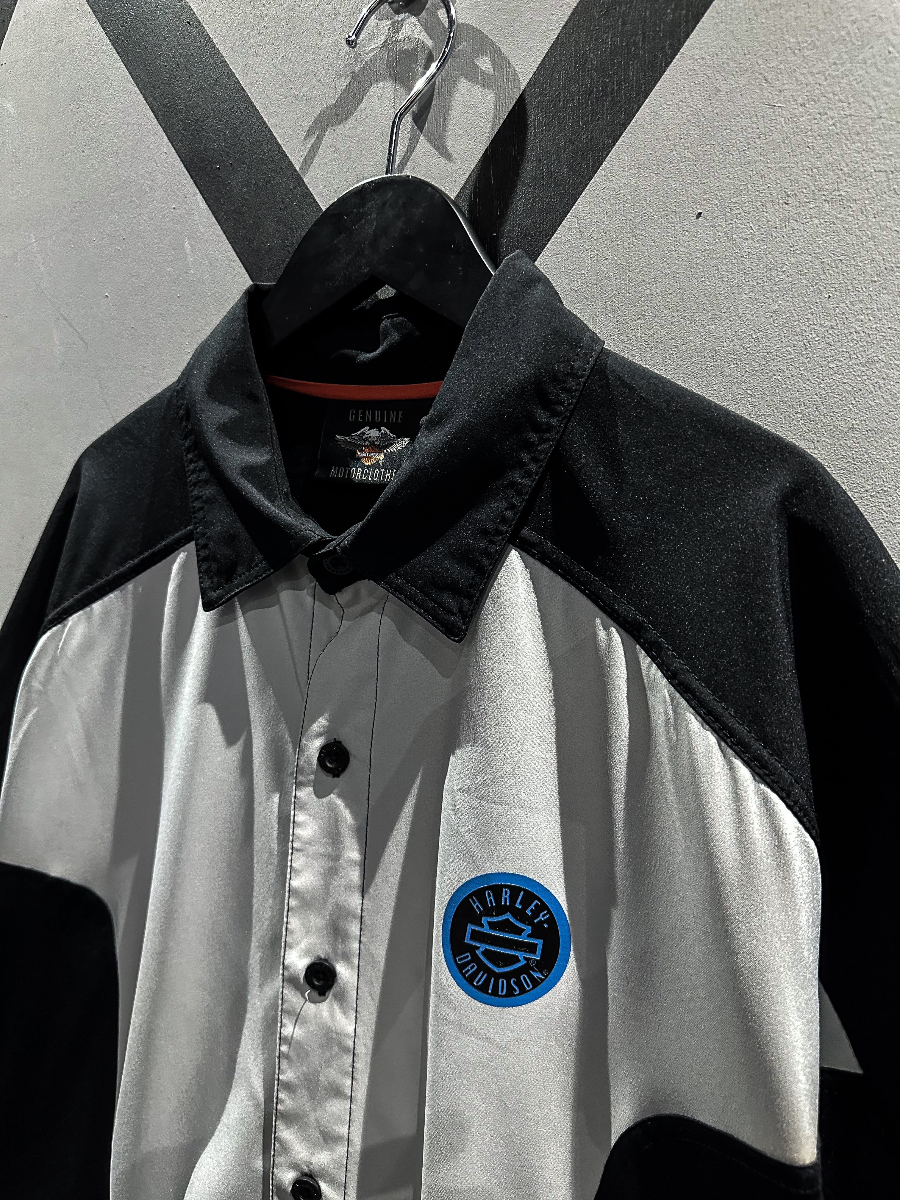 サラッとした質感のハリのある素材を用いたボディに、グレー×ブラックの、ハーレーのバイクライクなカラーリングで切り替えが施された1着。