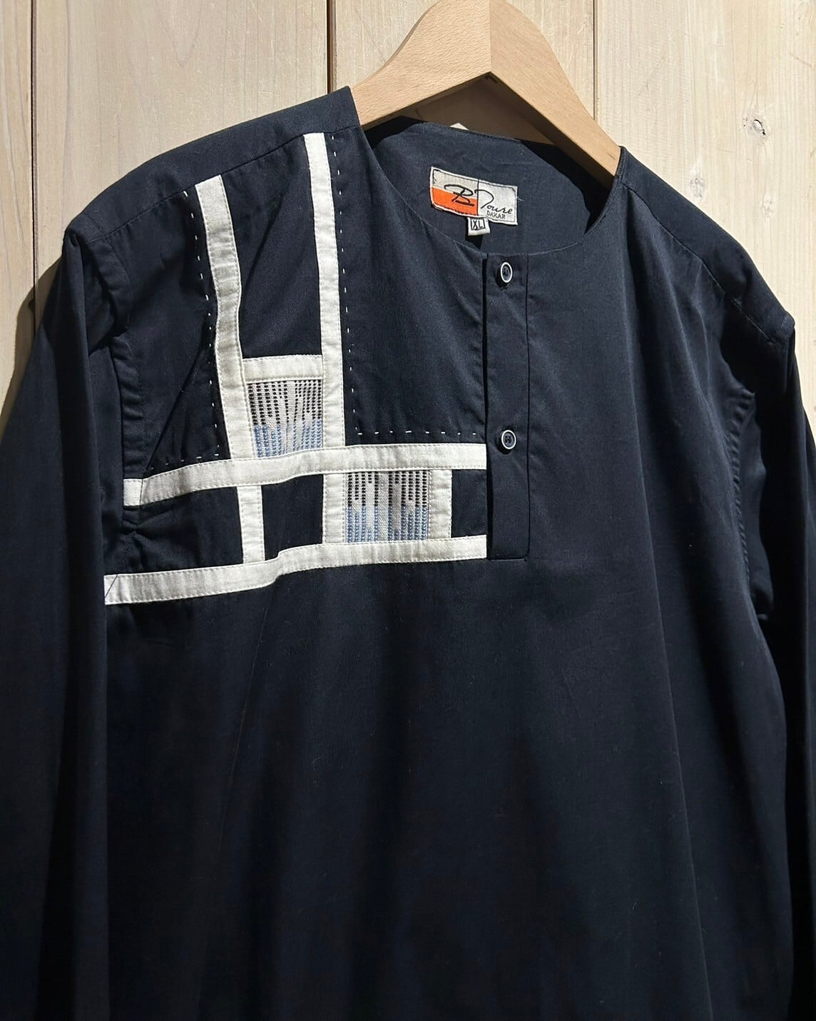 ガシッとしたハリのある素材を使用したブラックのボディに、右肩付近に幾何学的な切り替えデザインを施した1着。
