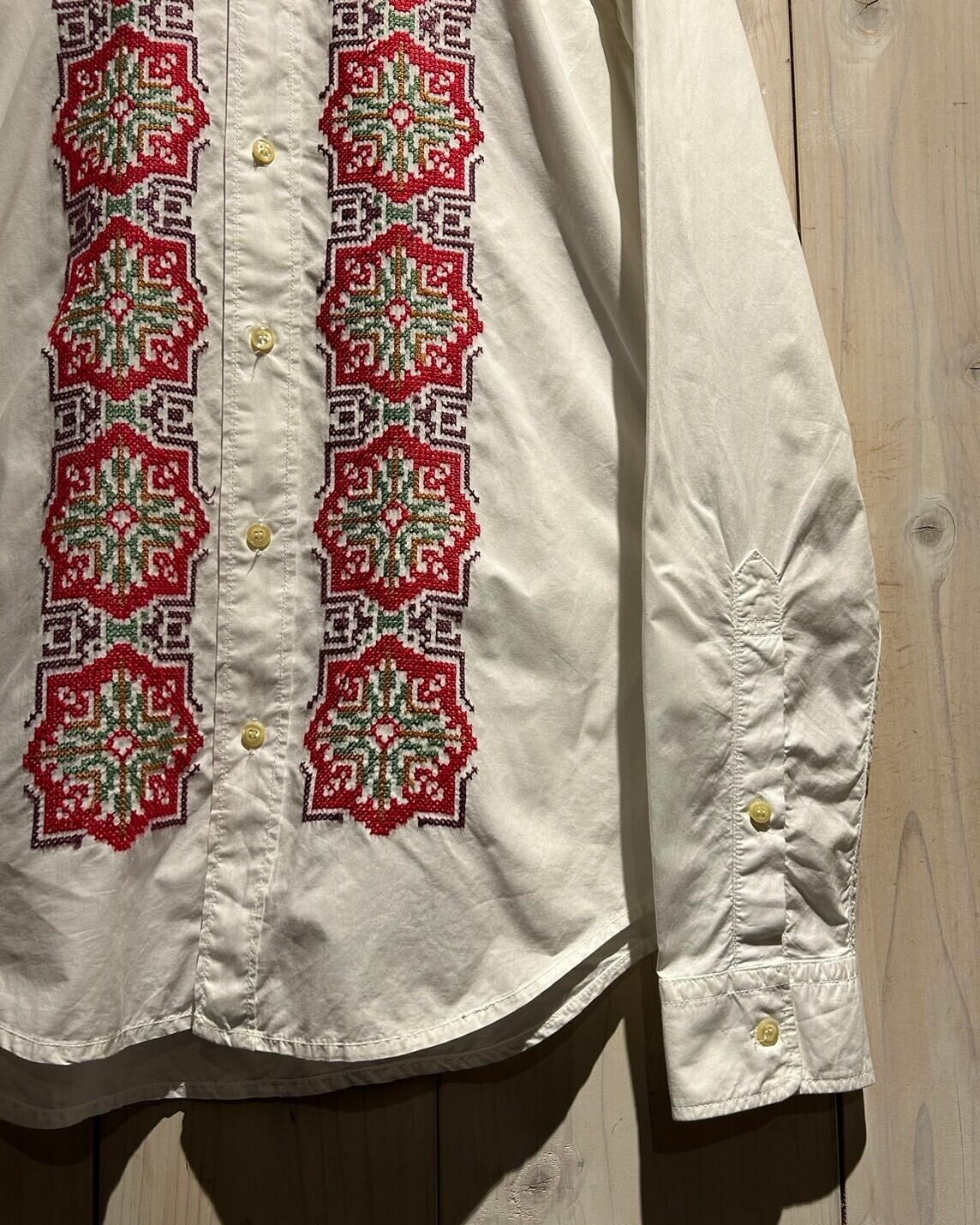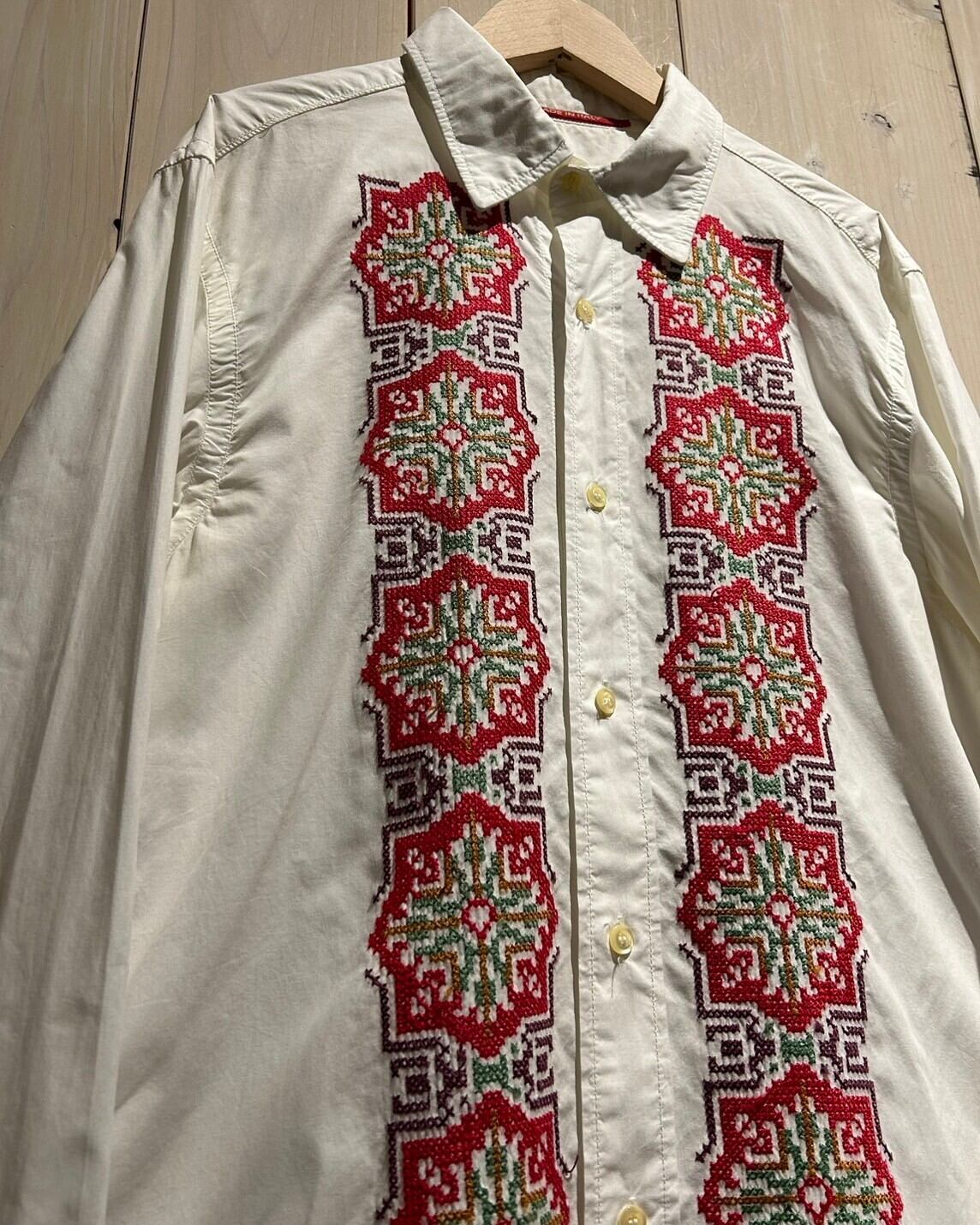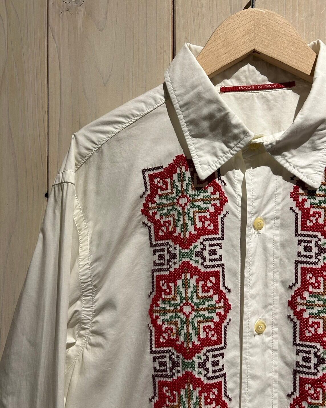 ハリのあるホワイトのシャツ生地に、緻密で繊細なクロスステッチでエスニック調の柄模様を施したイタリアメイドの長袖シャツ。