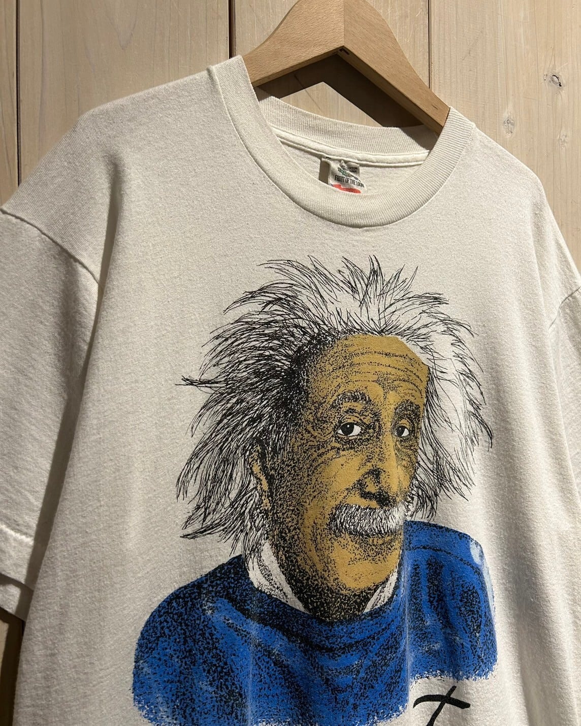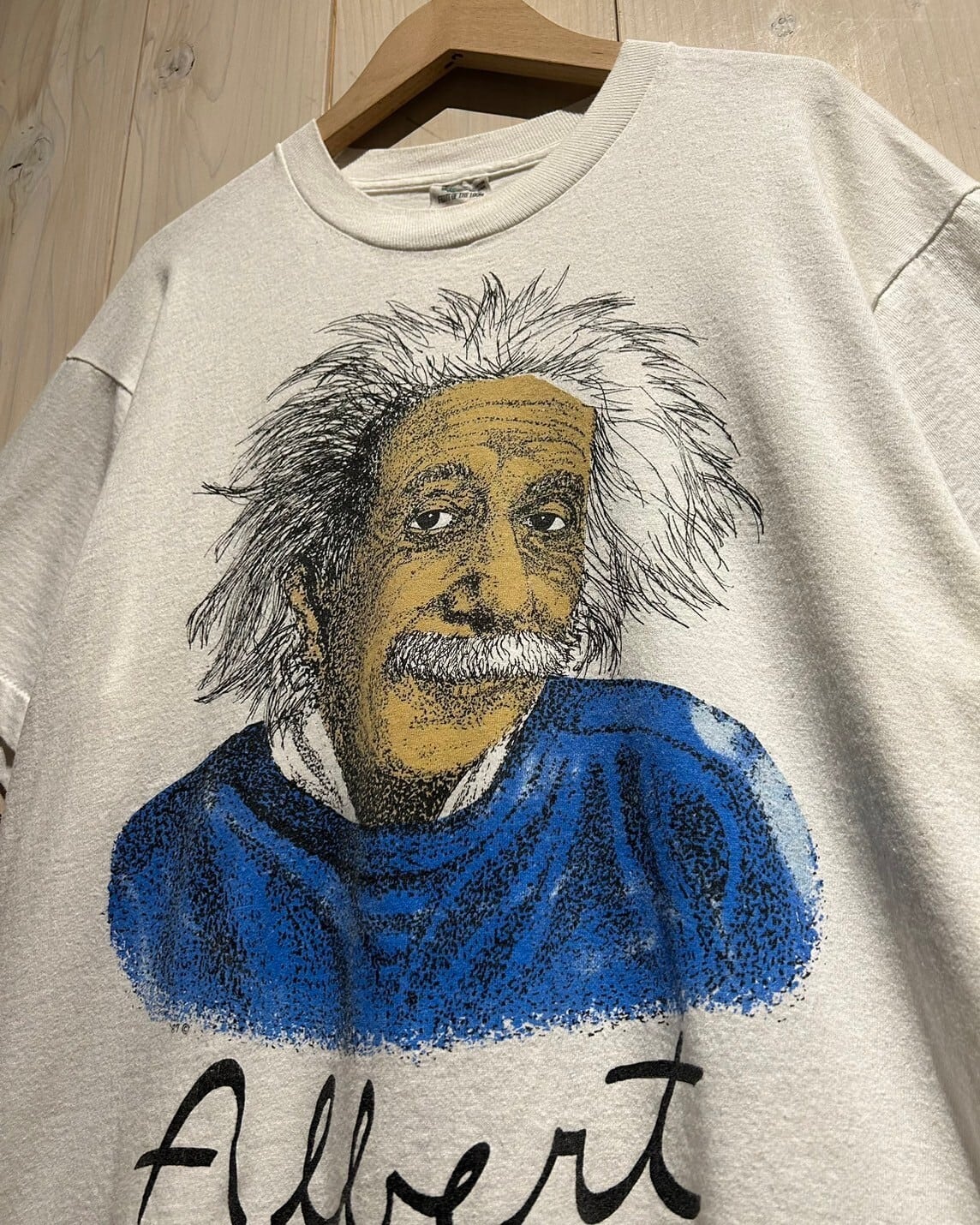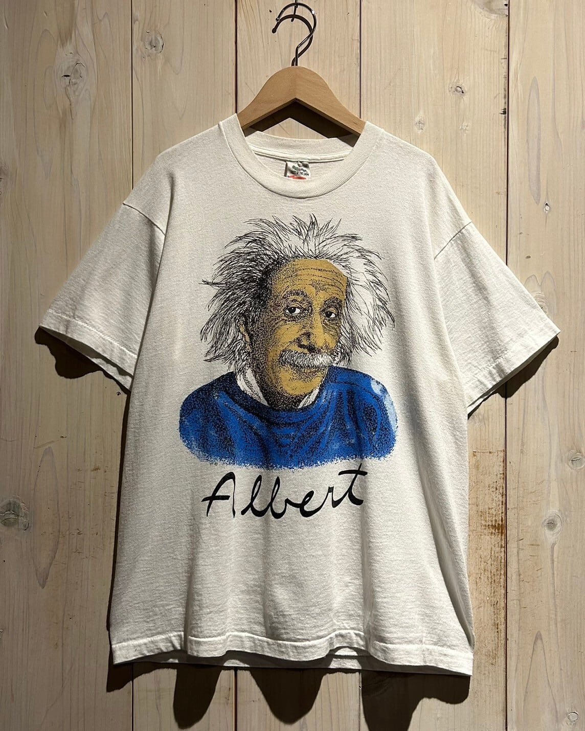 ホワイトのボディに、ドットワーク調のタッチでアインシュタインが載せられた1着。人物モノはヴィンテージTシャツでも人気所ですが、特にアインシュタインはお探しの方も多いんです。
