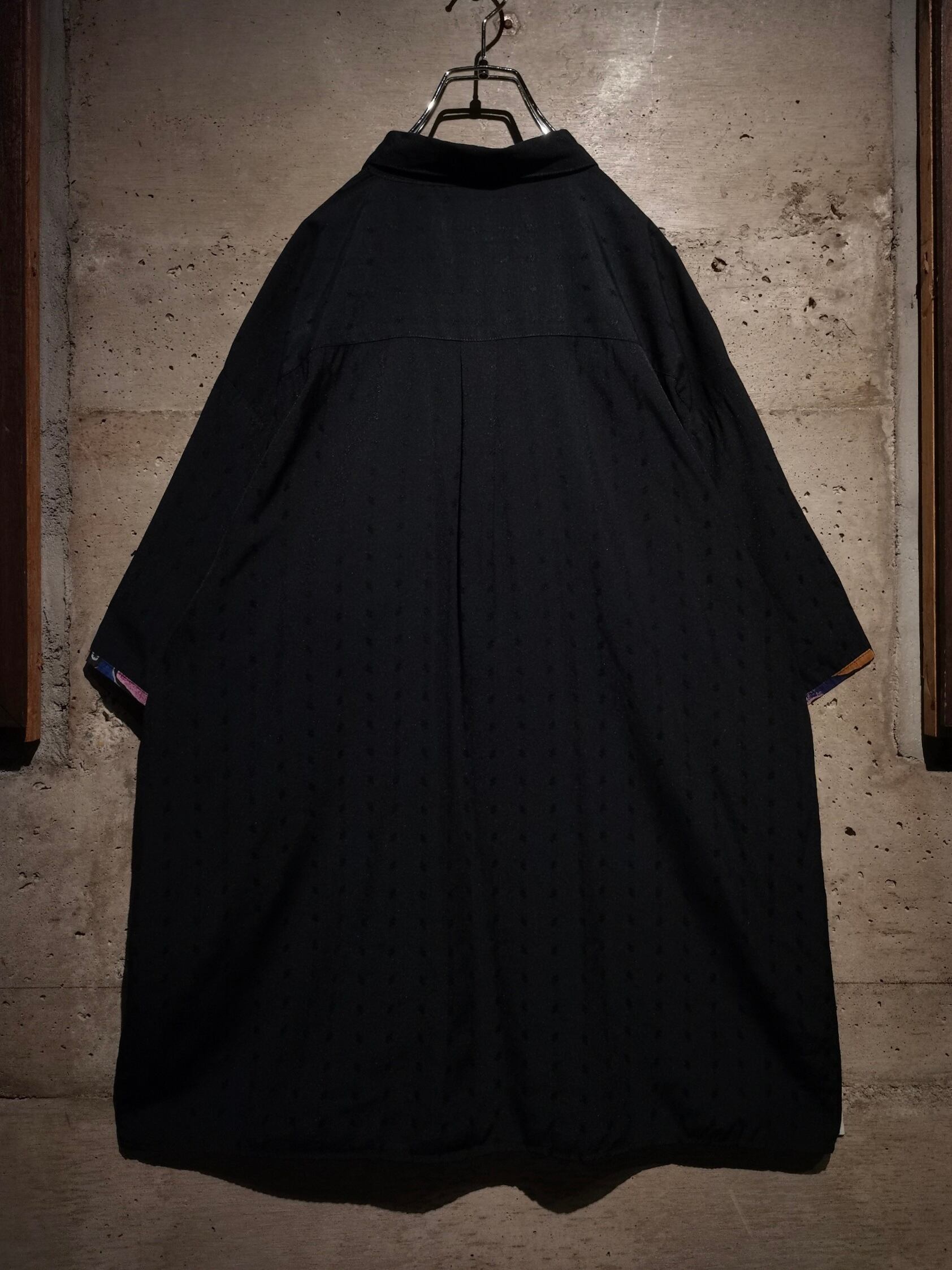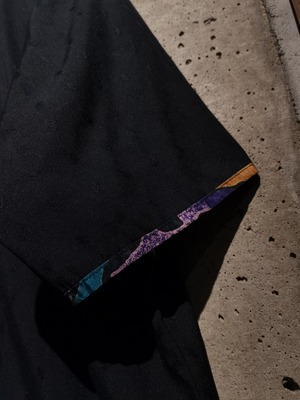 ブラックのボディをベースに、フロントの中央付近、ポケット口、袖口にアート柄を切り替えた、このブランドでは稀有な半袖シャツ。