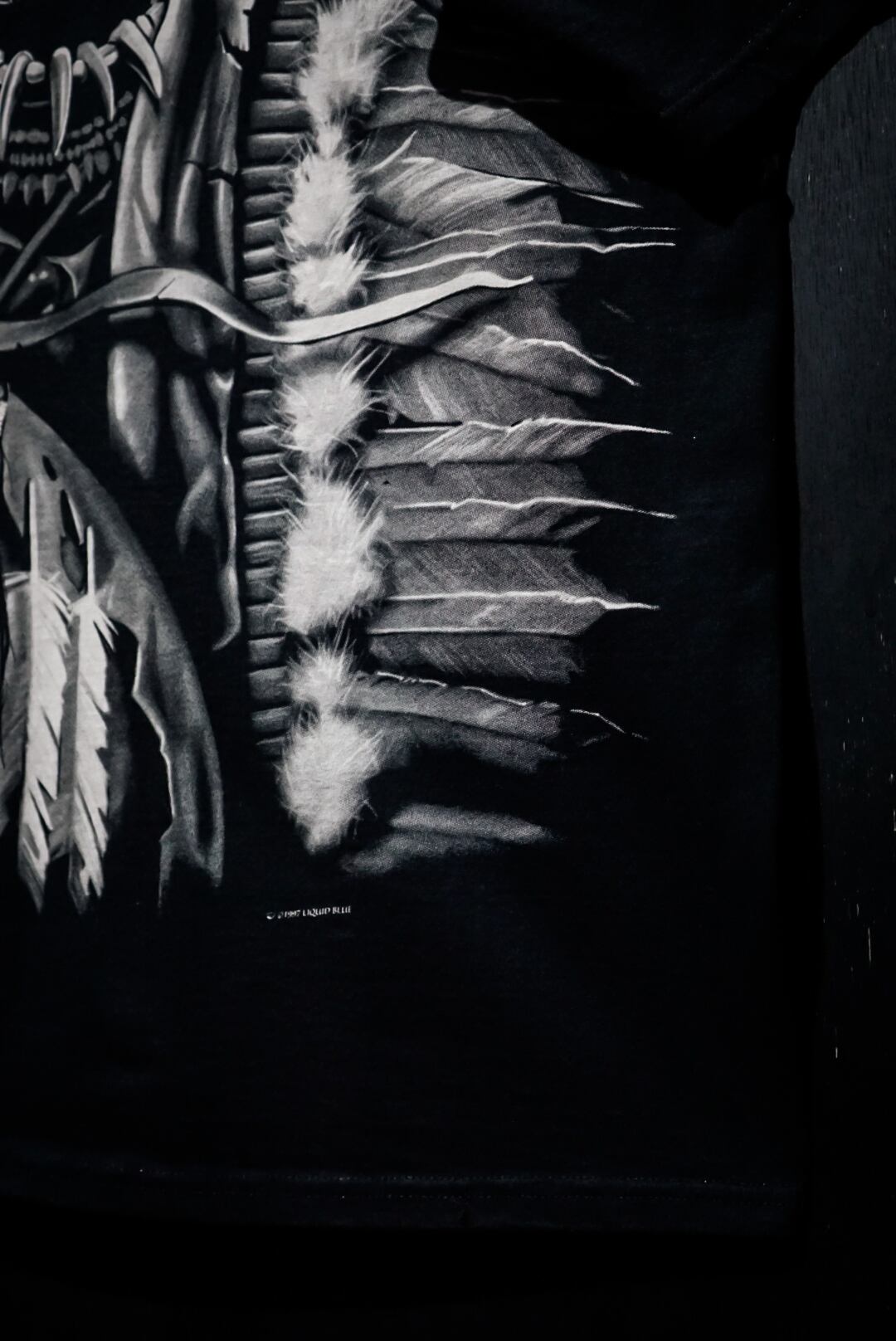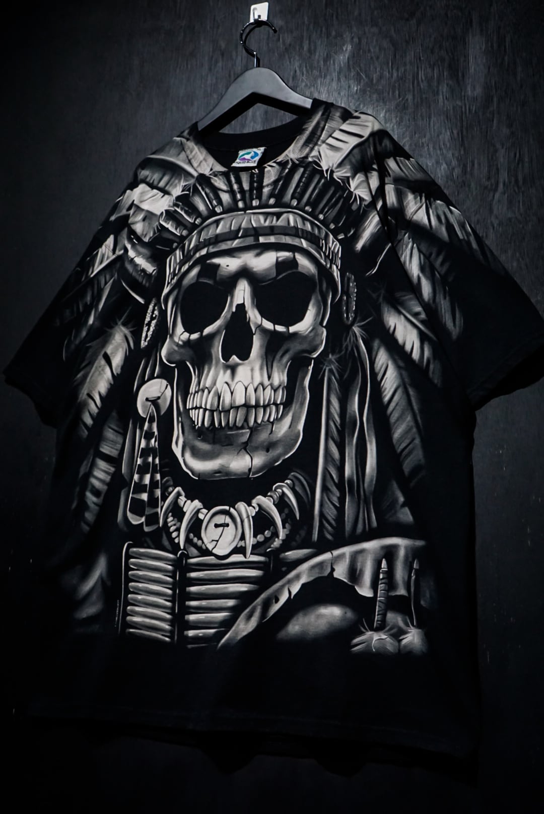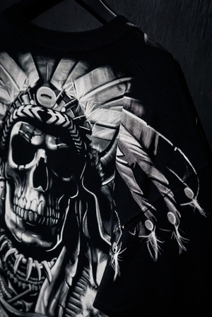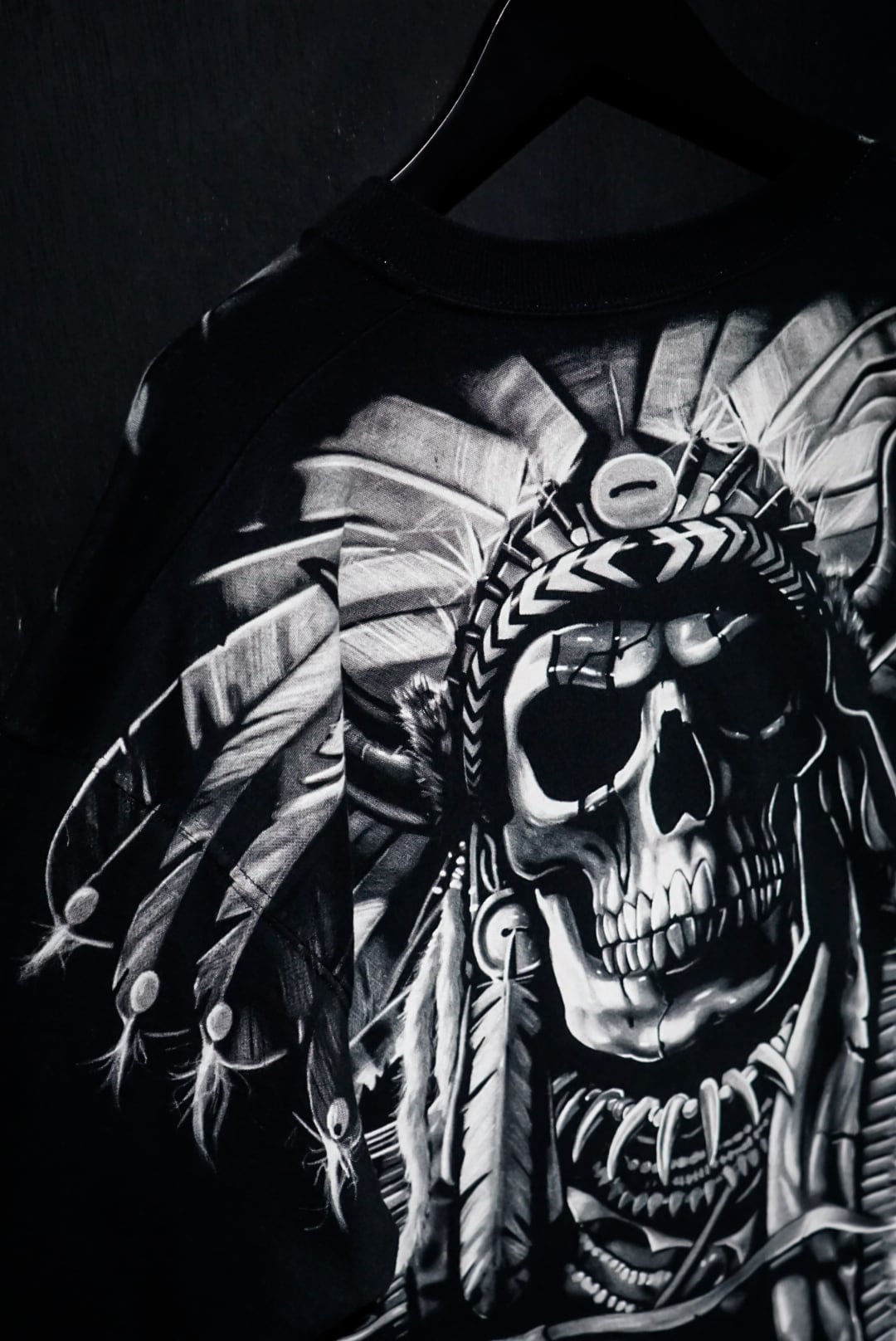 オールオーバープリントによる民族姿のスカルデザインが大きく載せられた、抜群のインパクトを放つTシャツ。