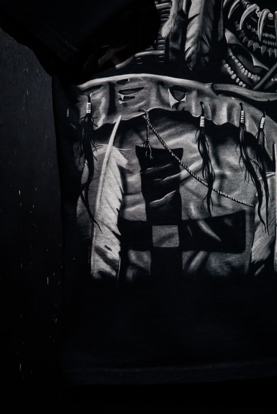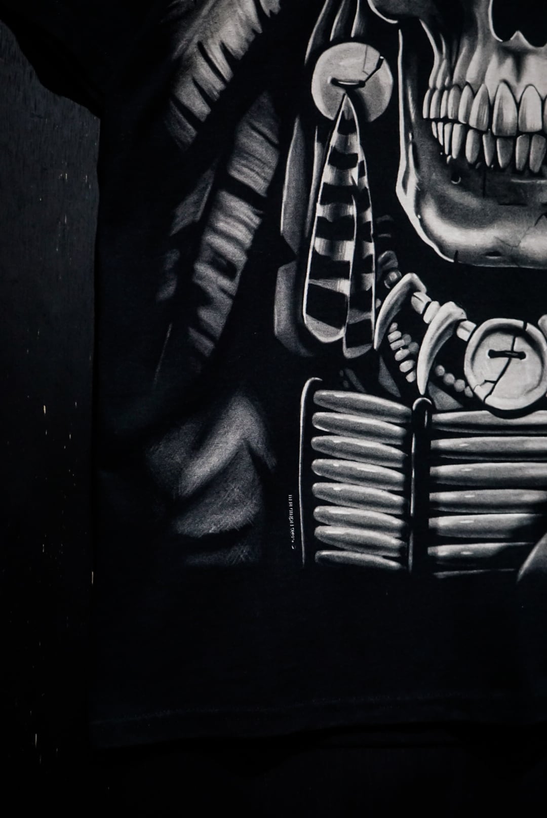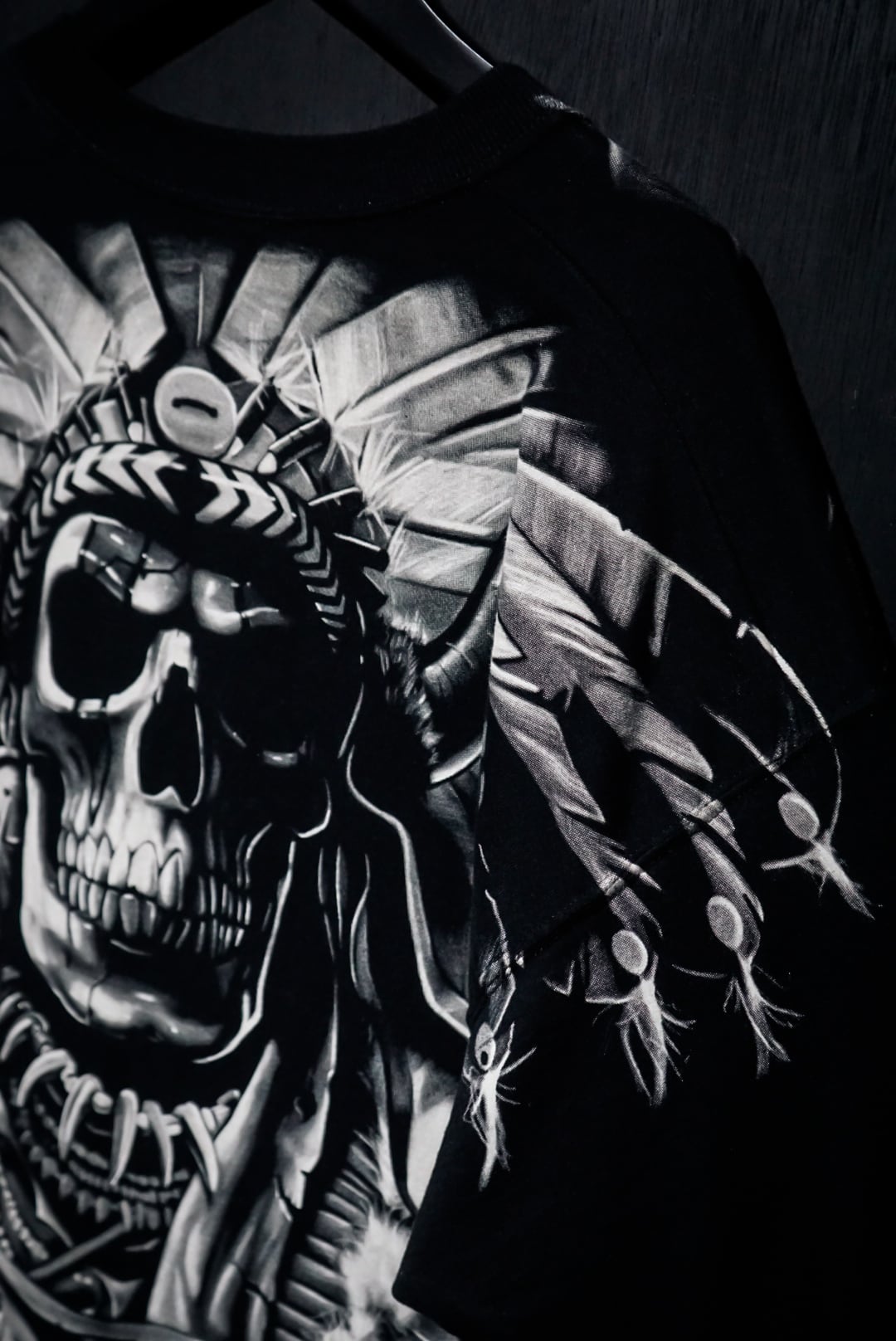 オールオーバープリントによる民族姿のスカルデザインが大きく載せられた、抜群のインパクトを放つTシャツ。