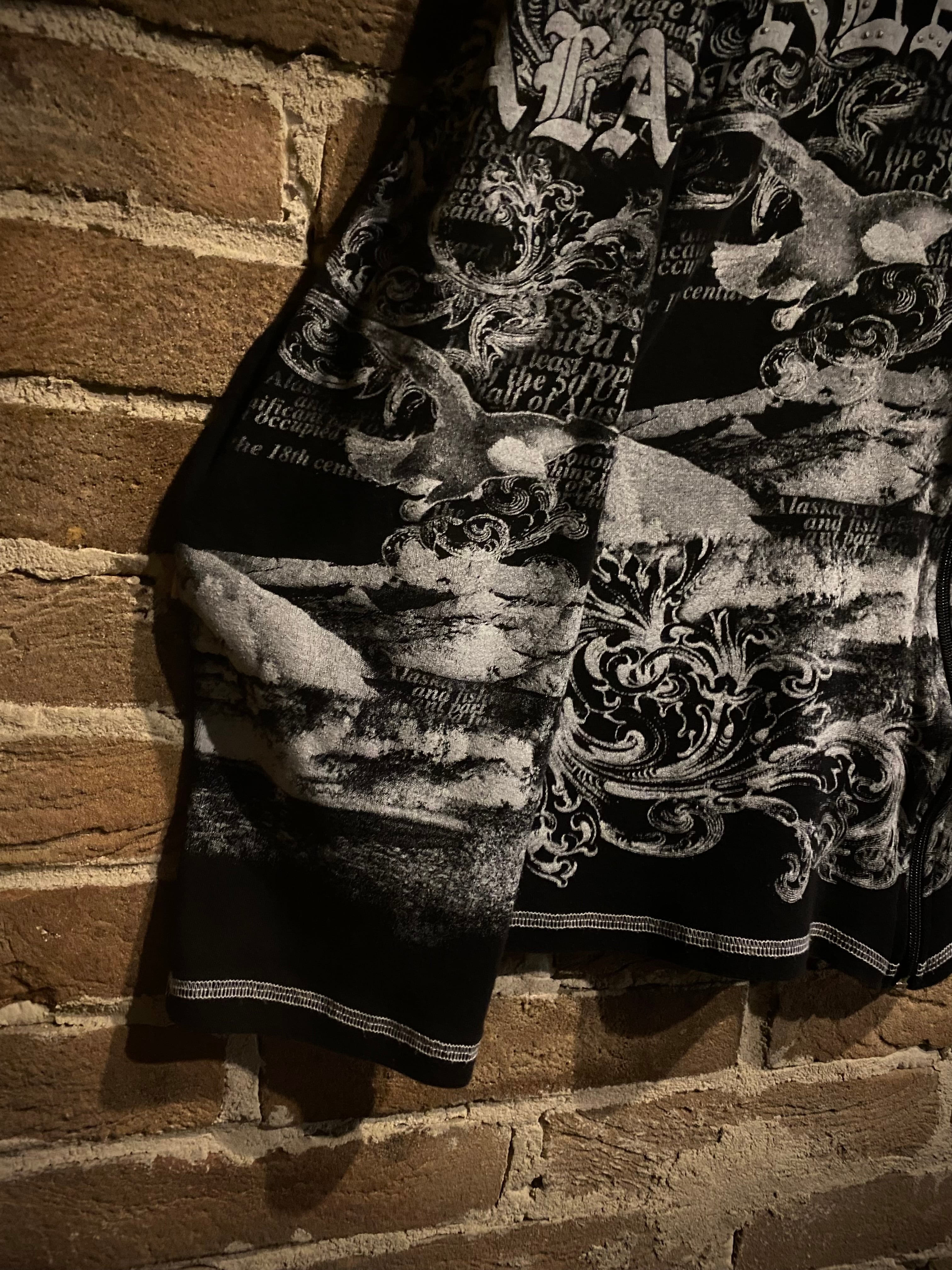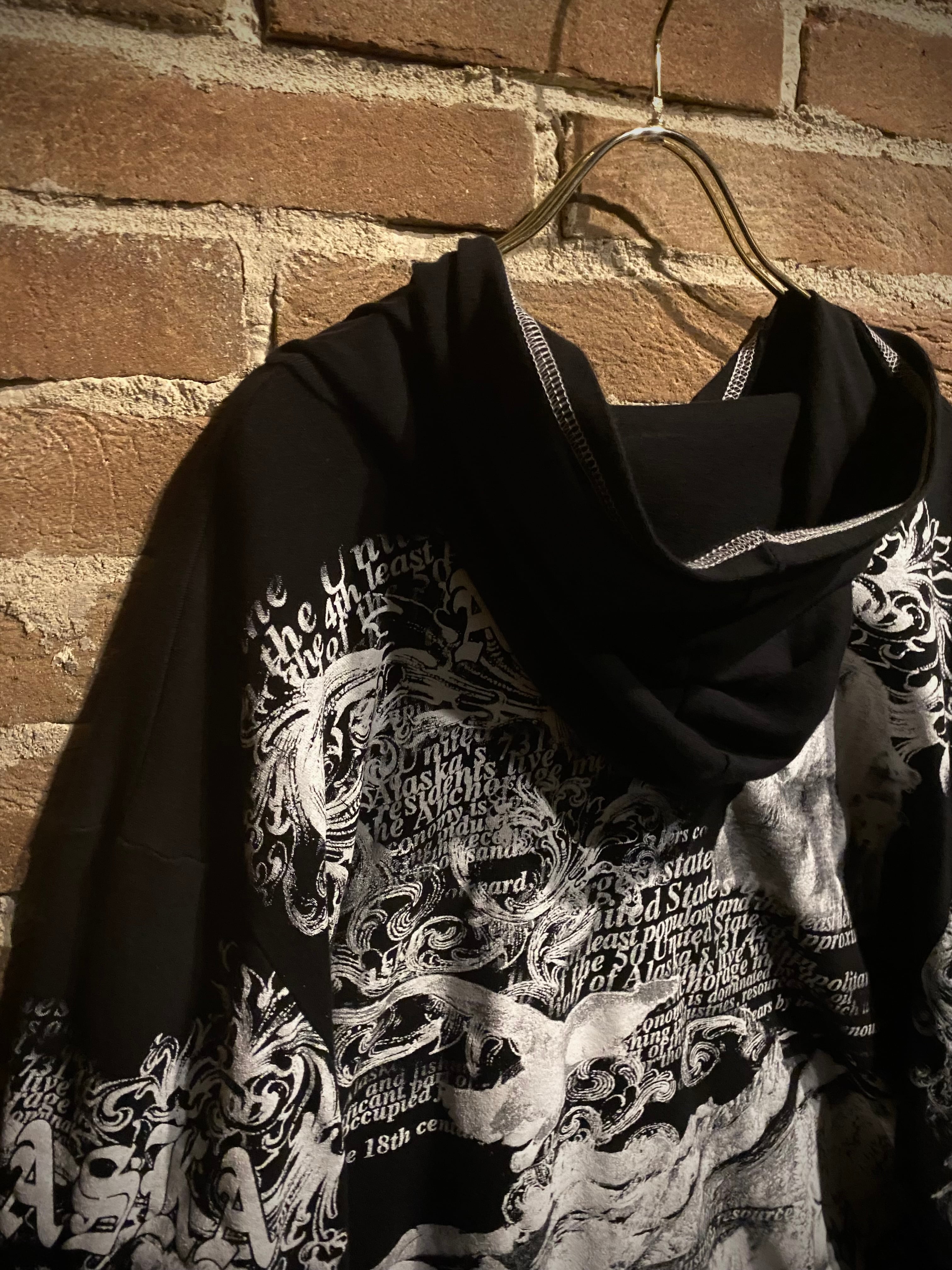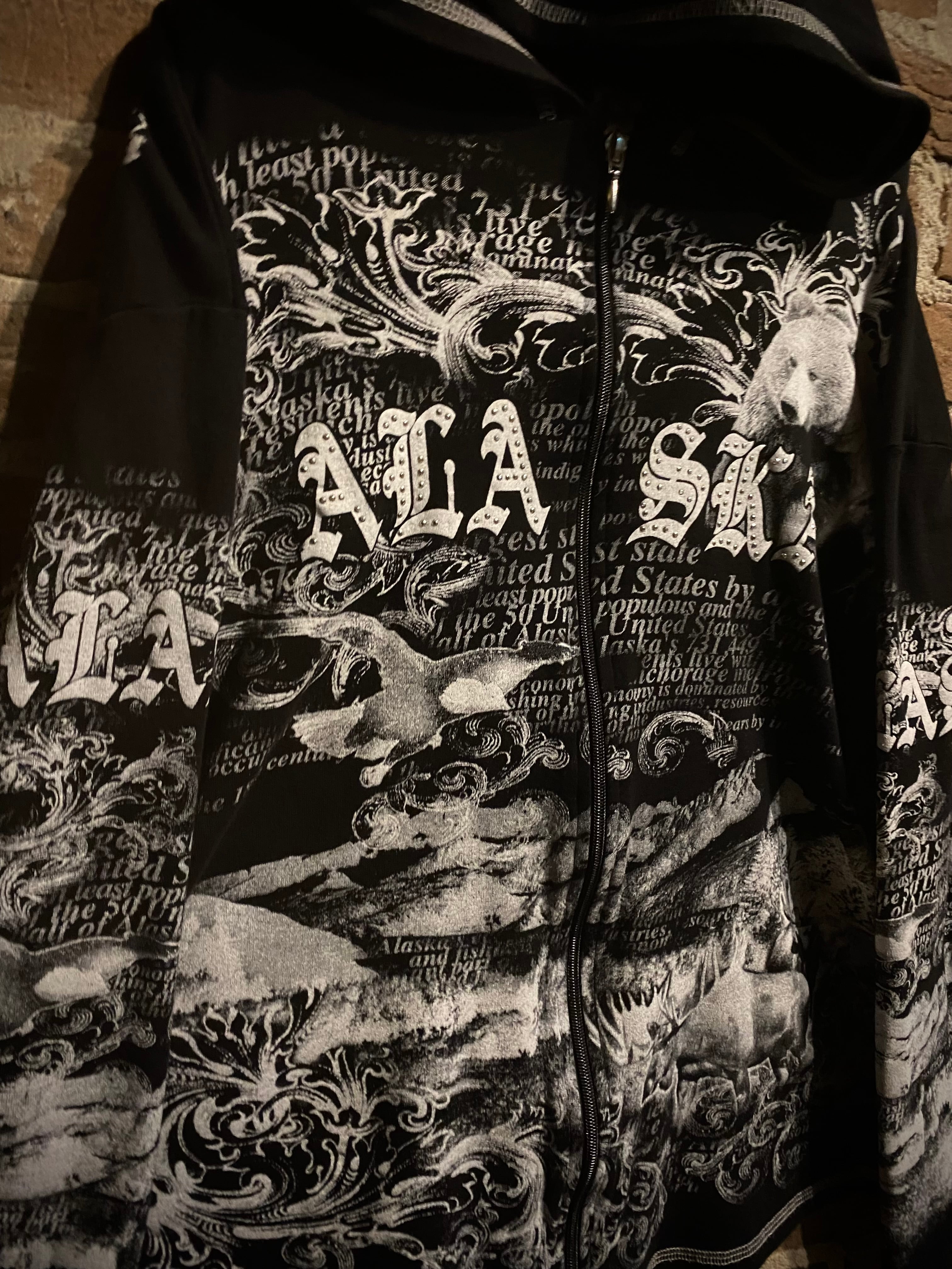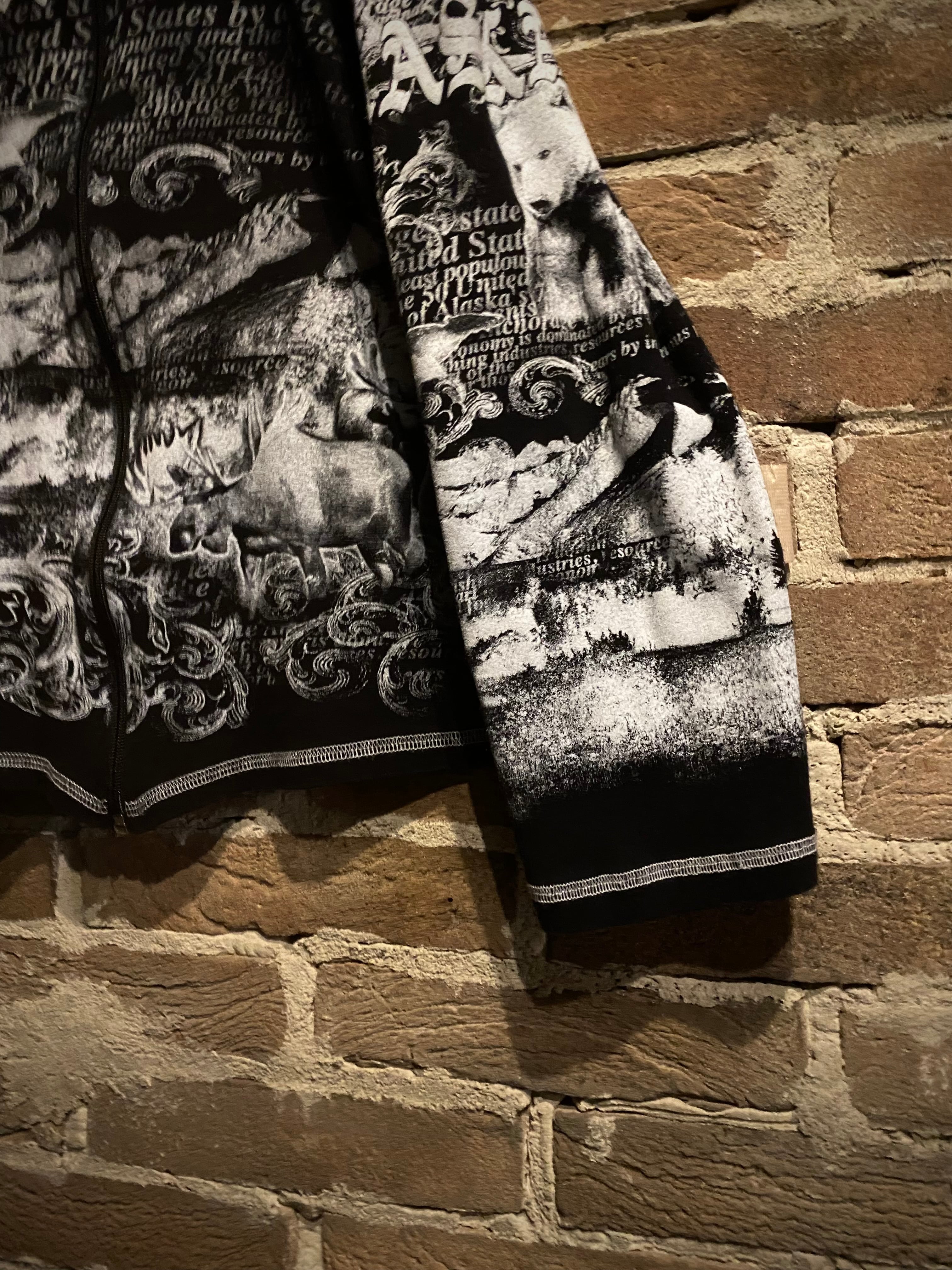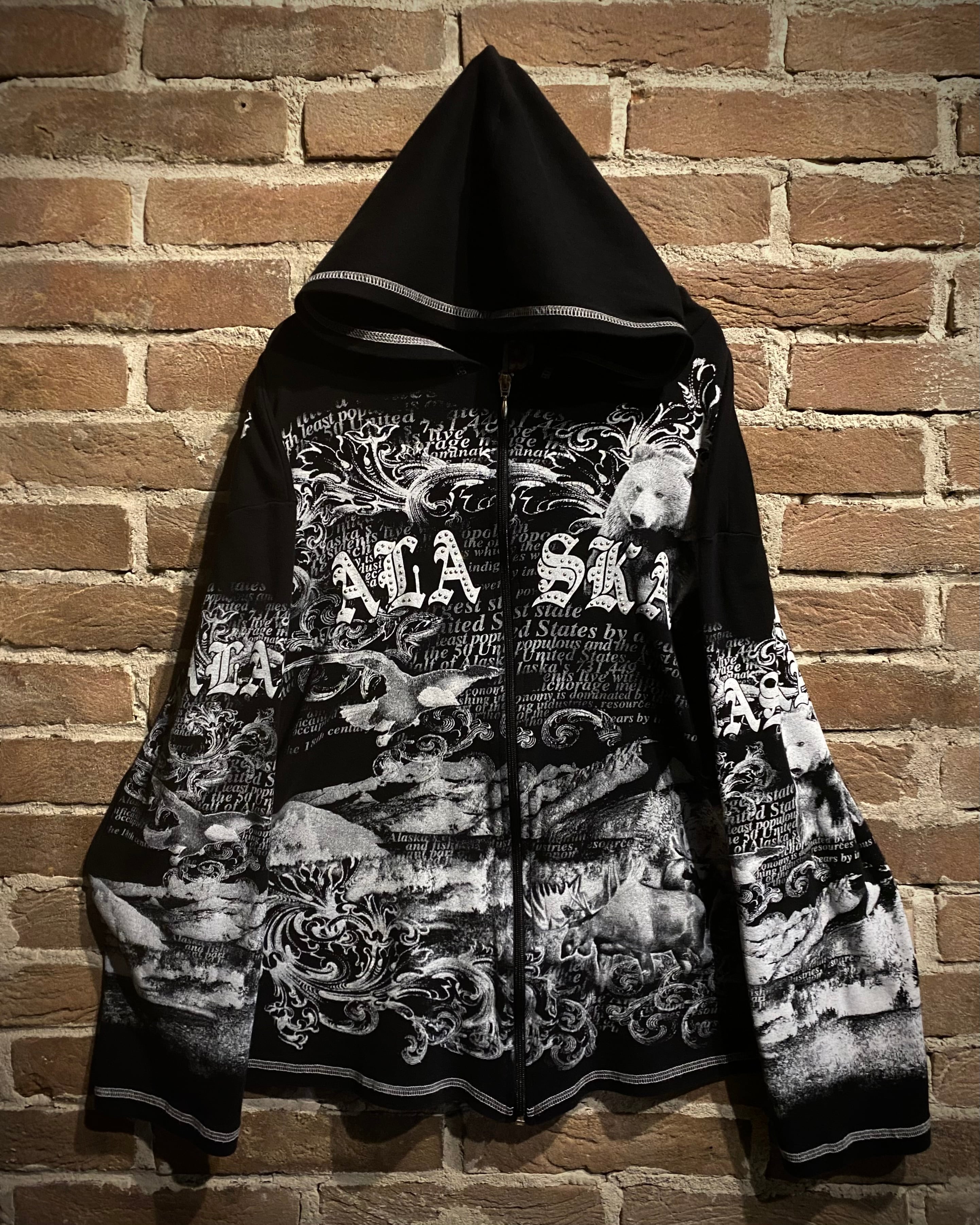 ブラックのボディをベースに、北米の野生動物に残された最後の楽園と呼ばれるアラスカに生息する動物をプリントしたジップアップフーディ。