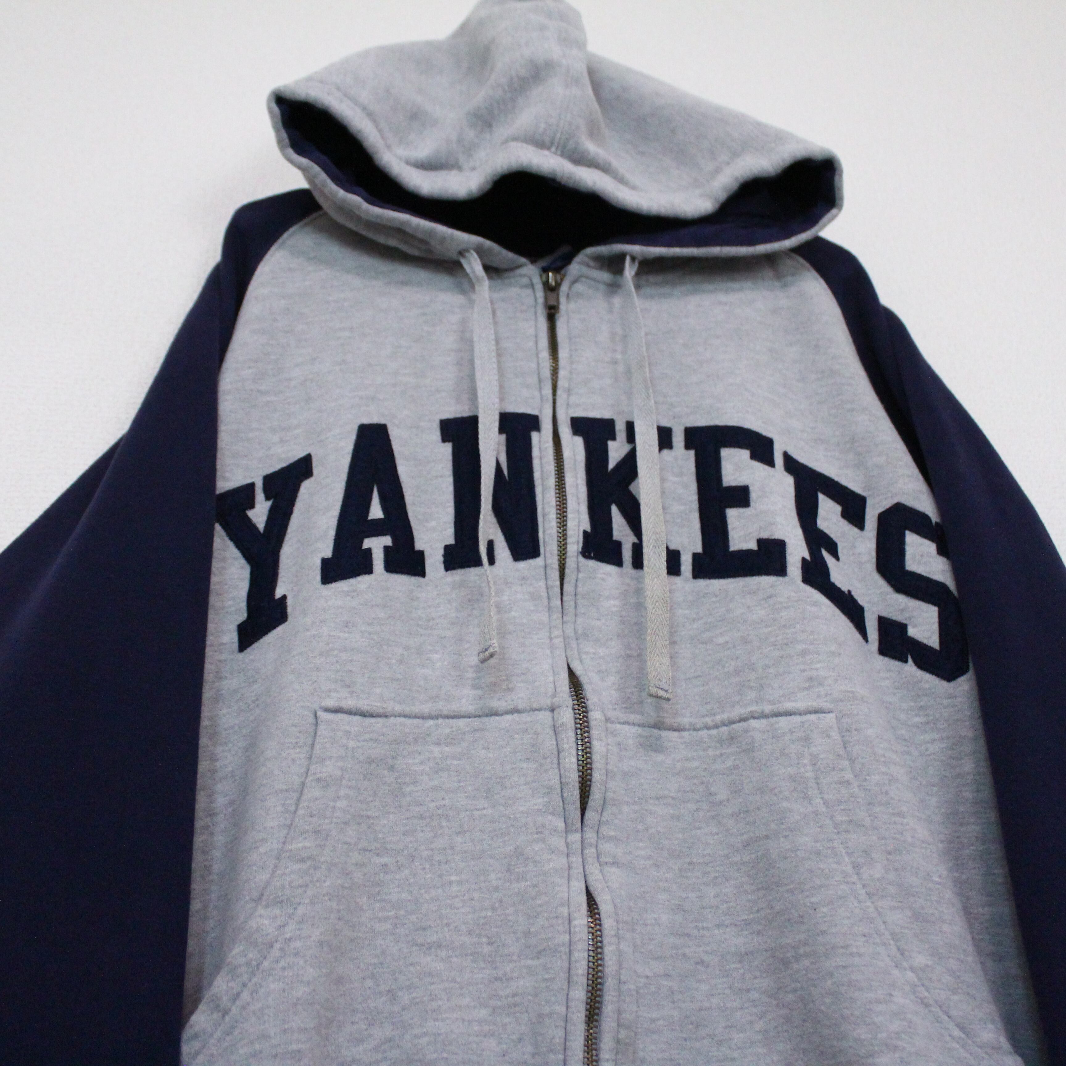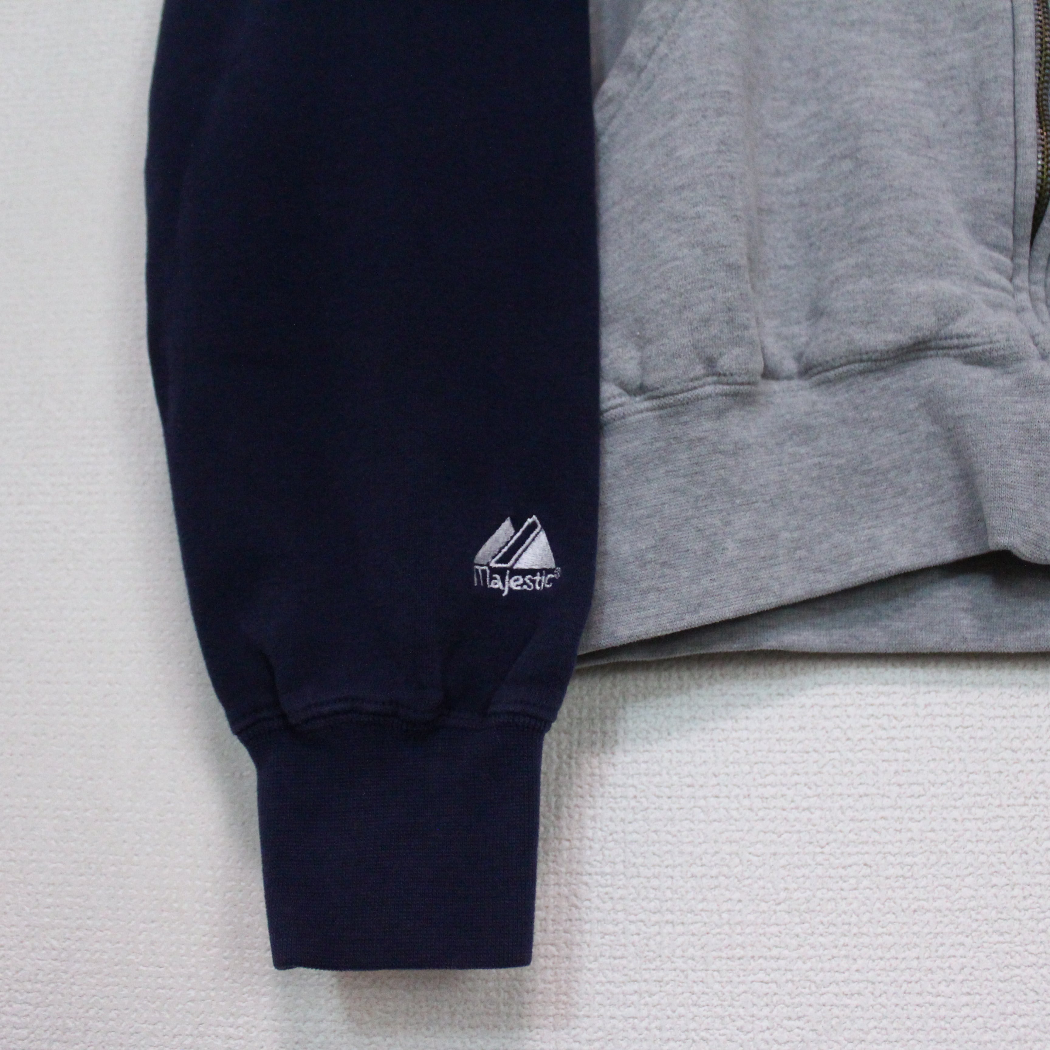 日本からも有名選手が活躍して野球ファンでない方でも聞いた事があるであろう"ニューヨークヤンキース"のロゴを、グレートとネイビーの2トーンで切り替えたボディに載せたジップアップフーディ。