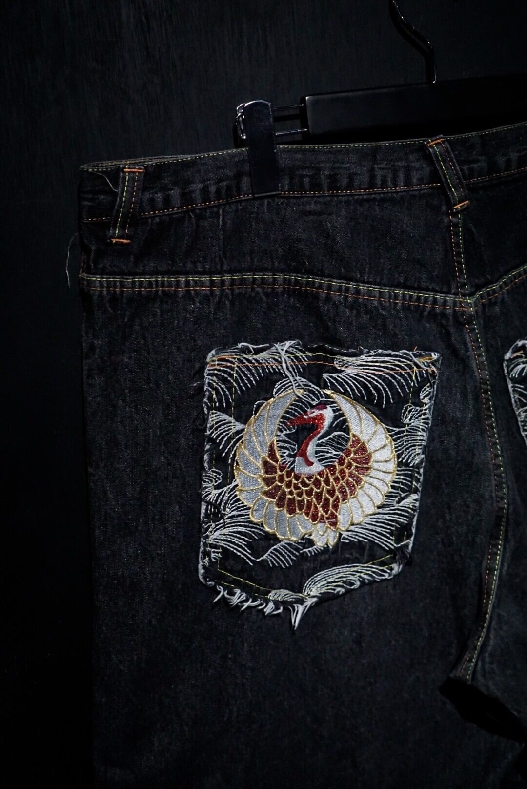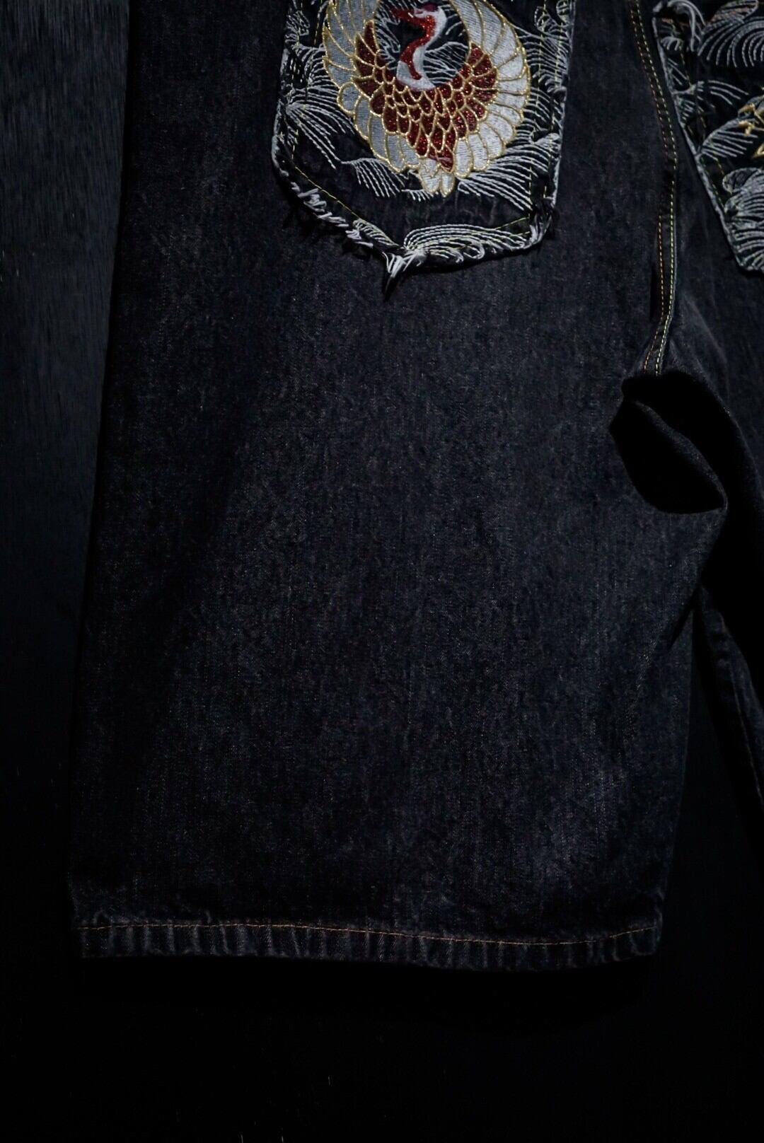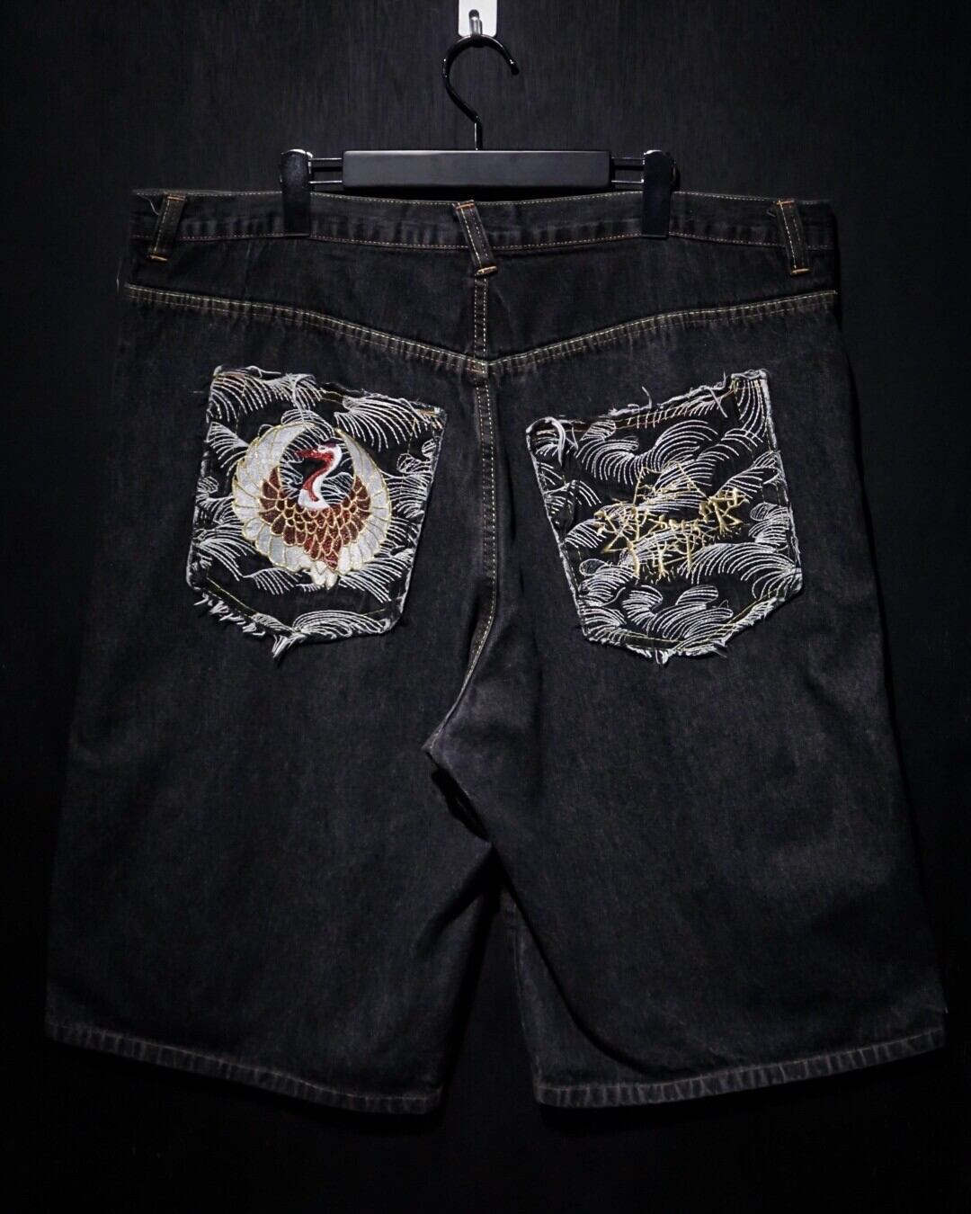 色残りがしっかりとある、ブラックのデニムショーツをベースに、背面ポケットに鶴や富士山、松などの日本の"和"をモチーフにした刺繍を刻んだバギーデニムショーツ。