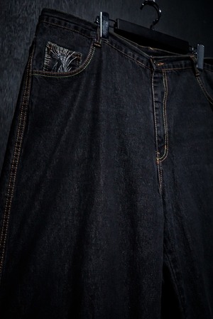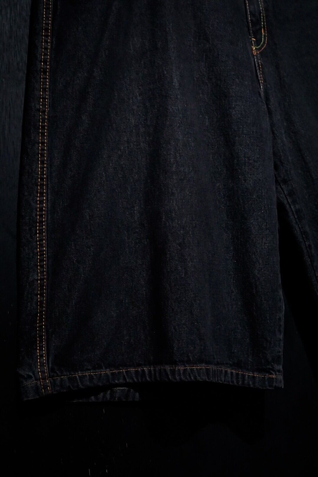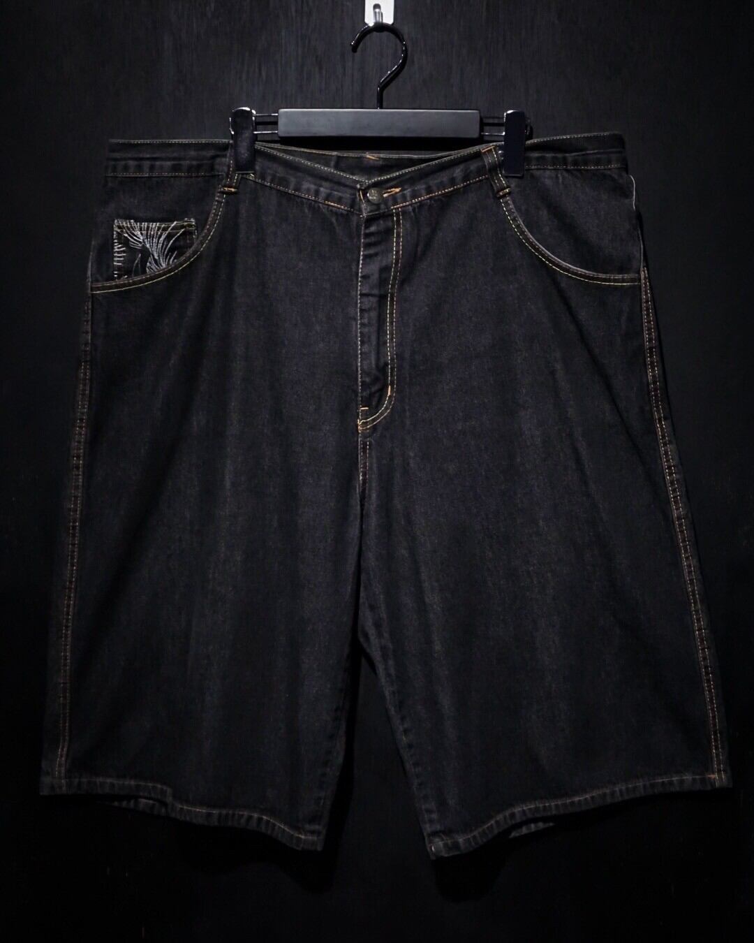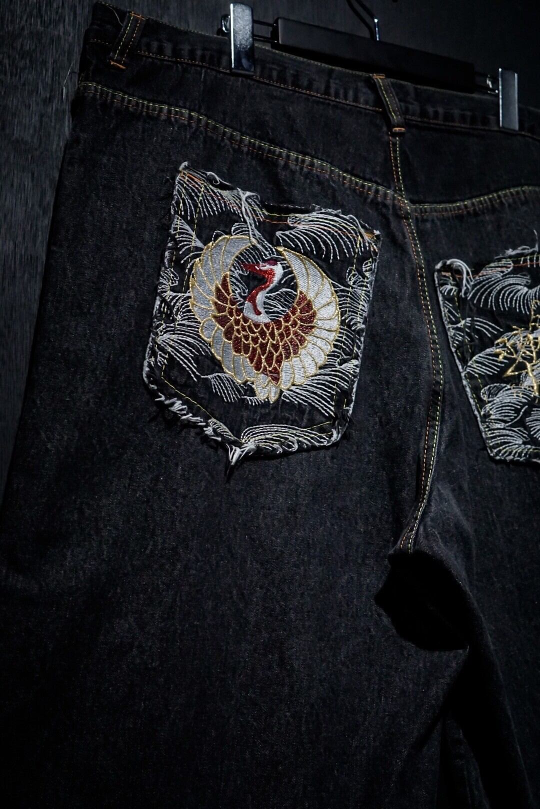 色残りがしっかりとある、ブラックのデニムショーツをベースに、背面ポケットに鶴や富士山、松などの日本の"和"をモチーフにした刺繍を刻んだバギーデニムショーツ。
