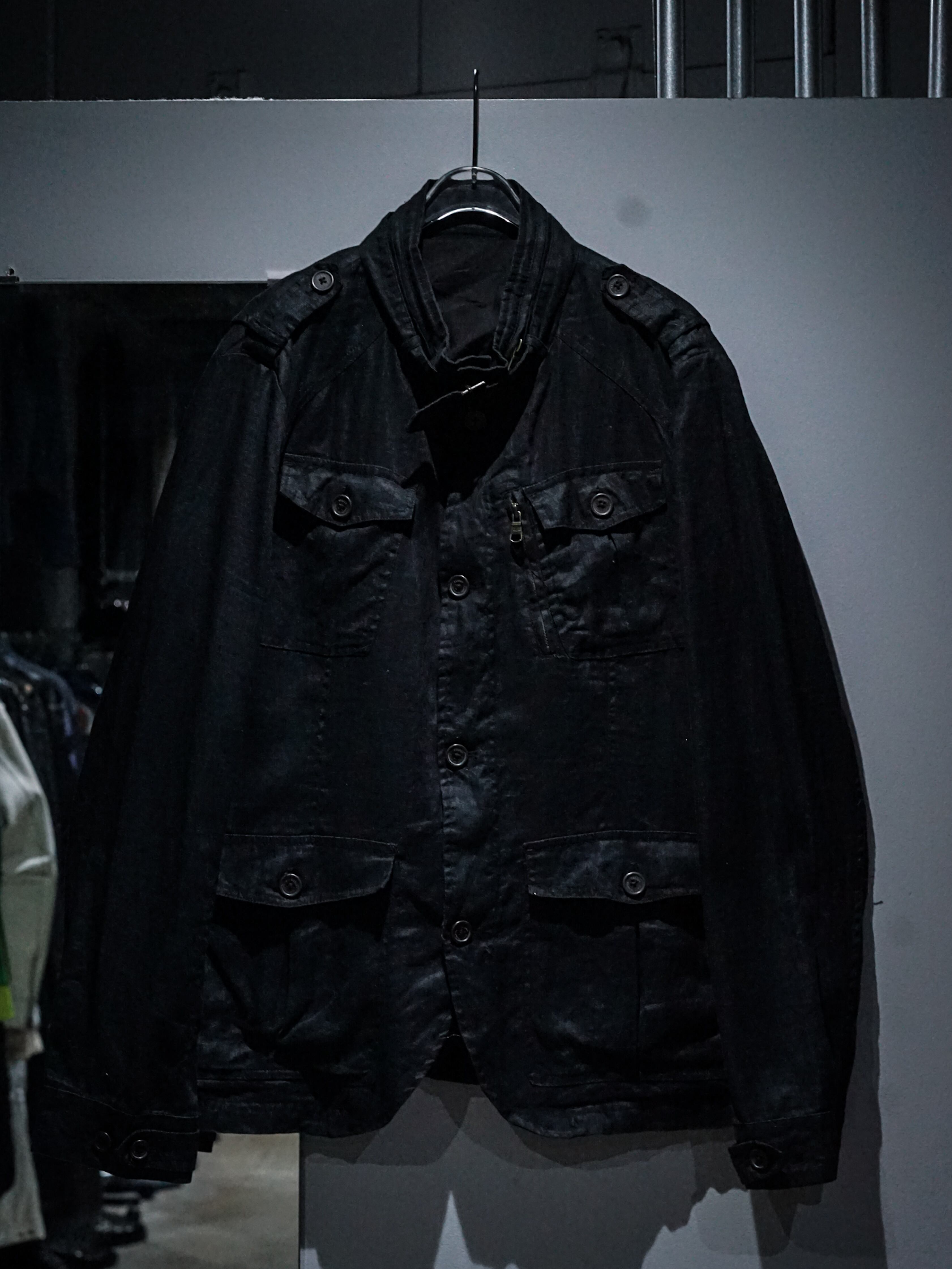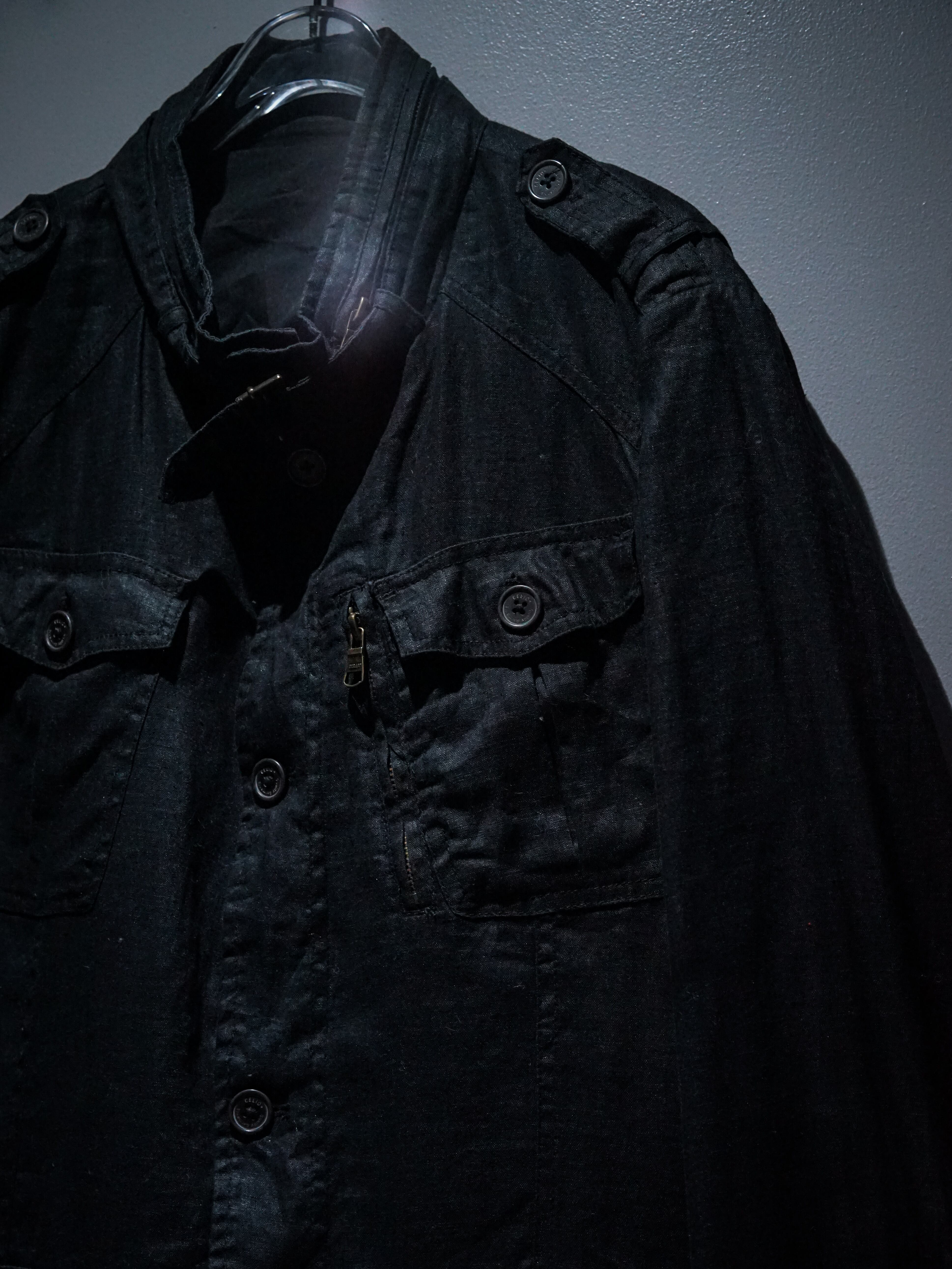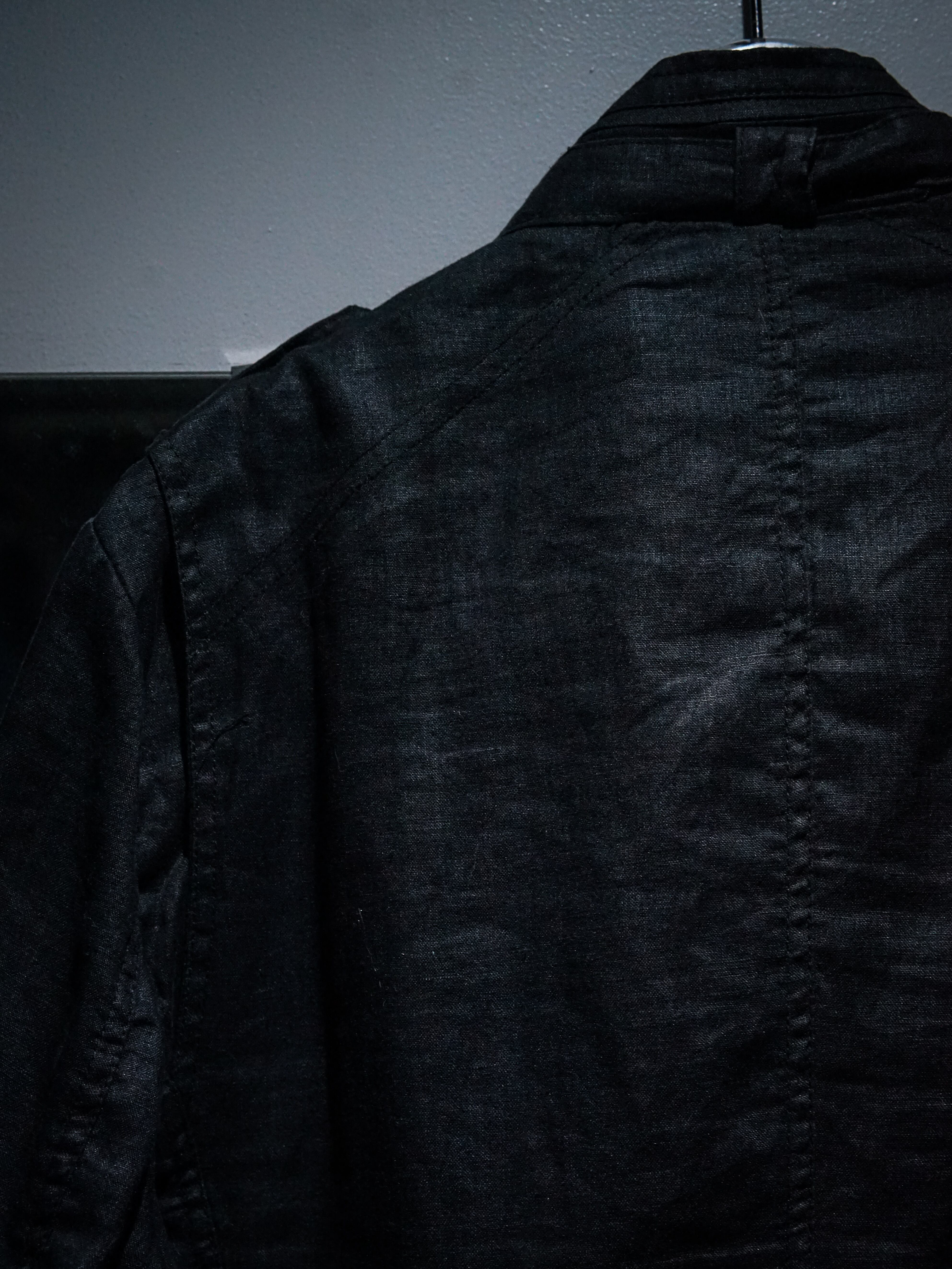 ハリのある上質なブラックリネンを用いて、フロントには4つのフラップポケット、左胸には縦型のジップポケット、エポレットのギミックを載せた1着。