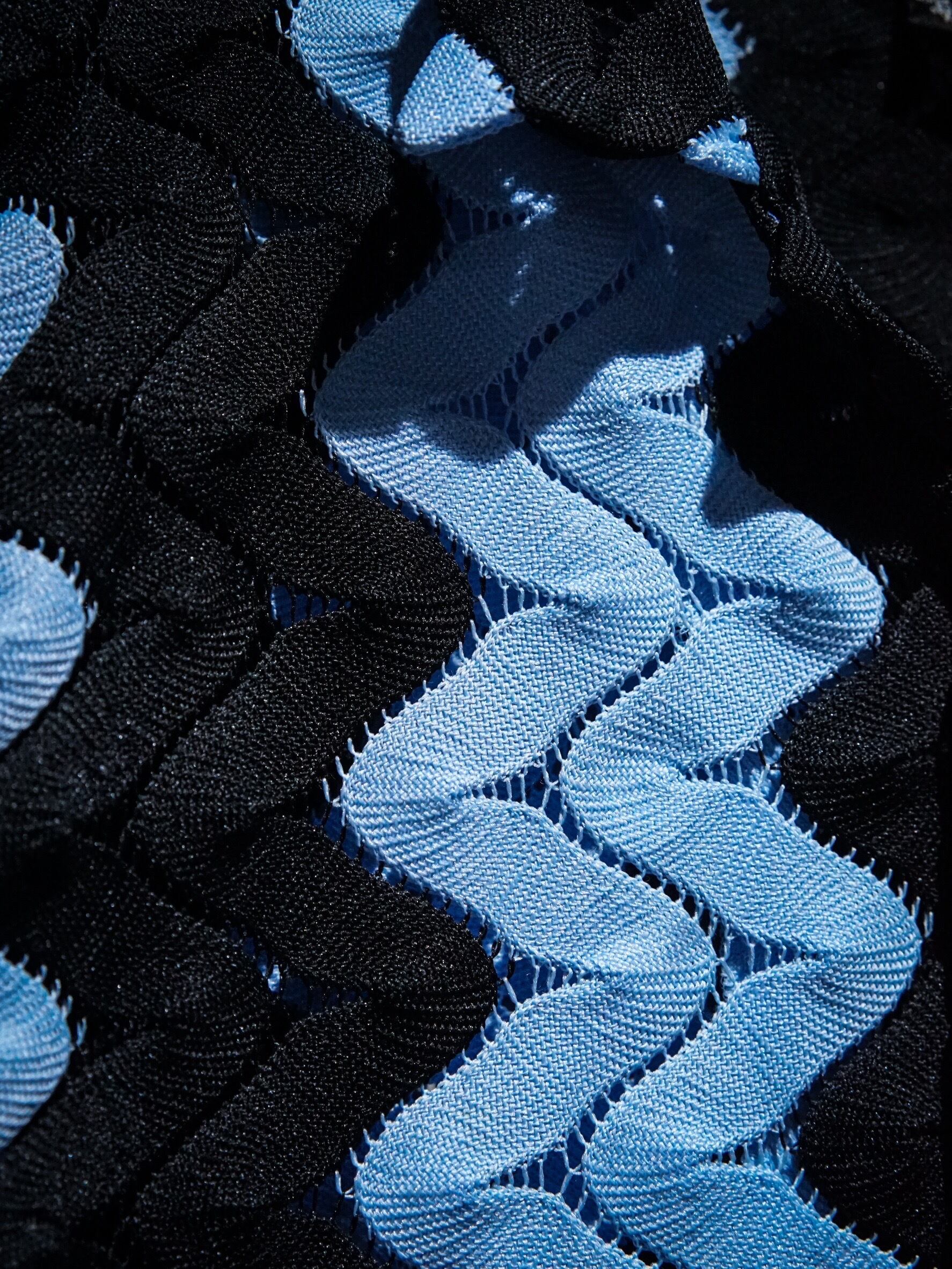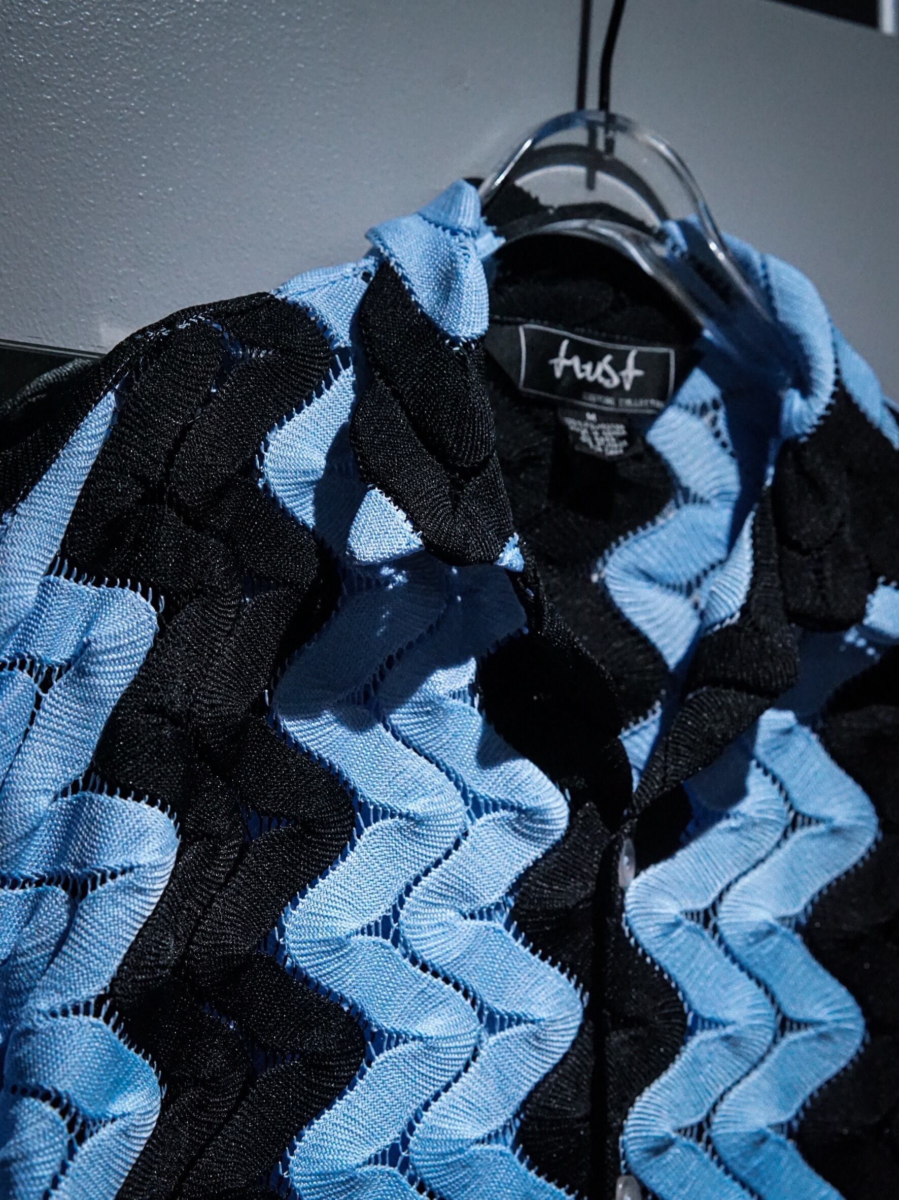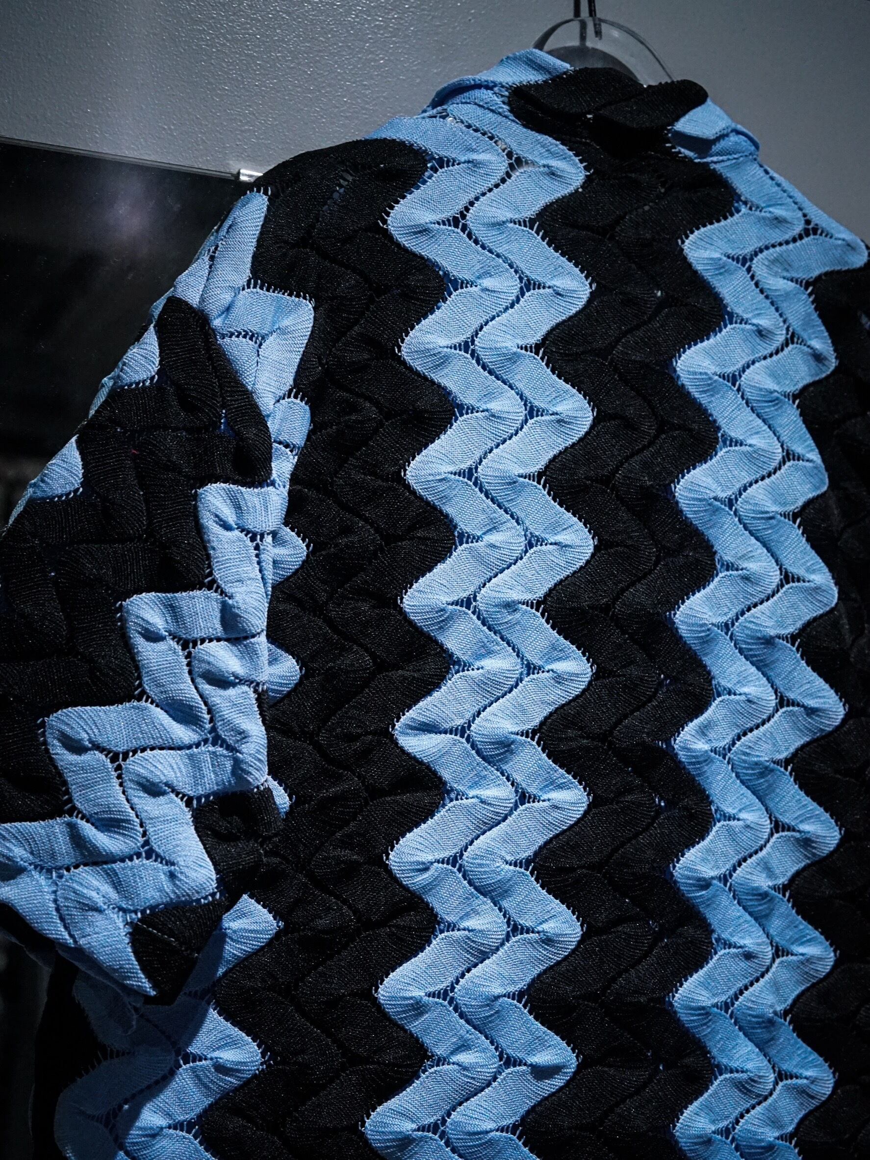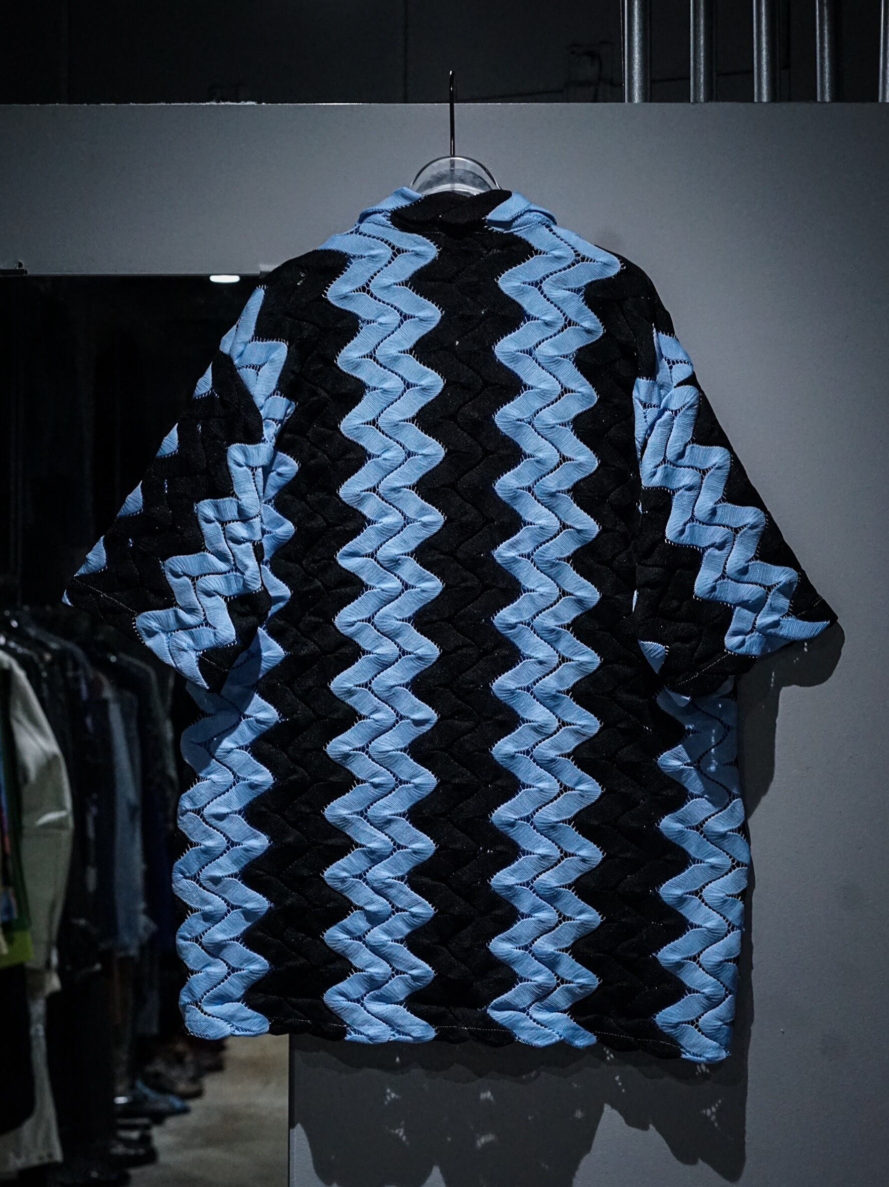 黒×水色のカラーリングを用いて、繊細なニッティングで波状にデザインした半袖ニットシャツ。