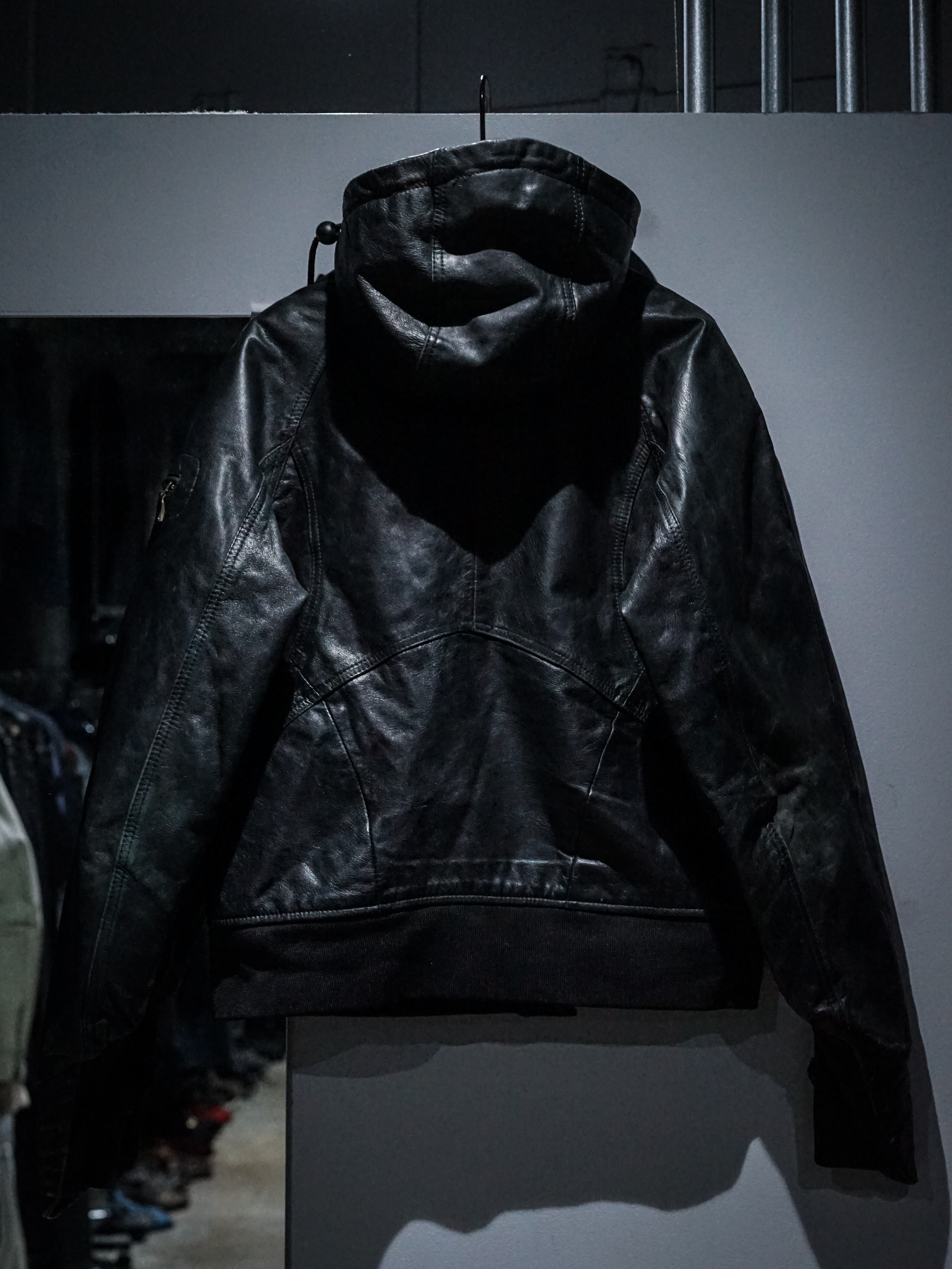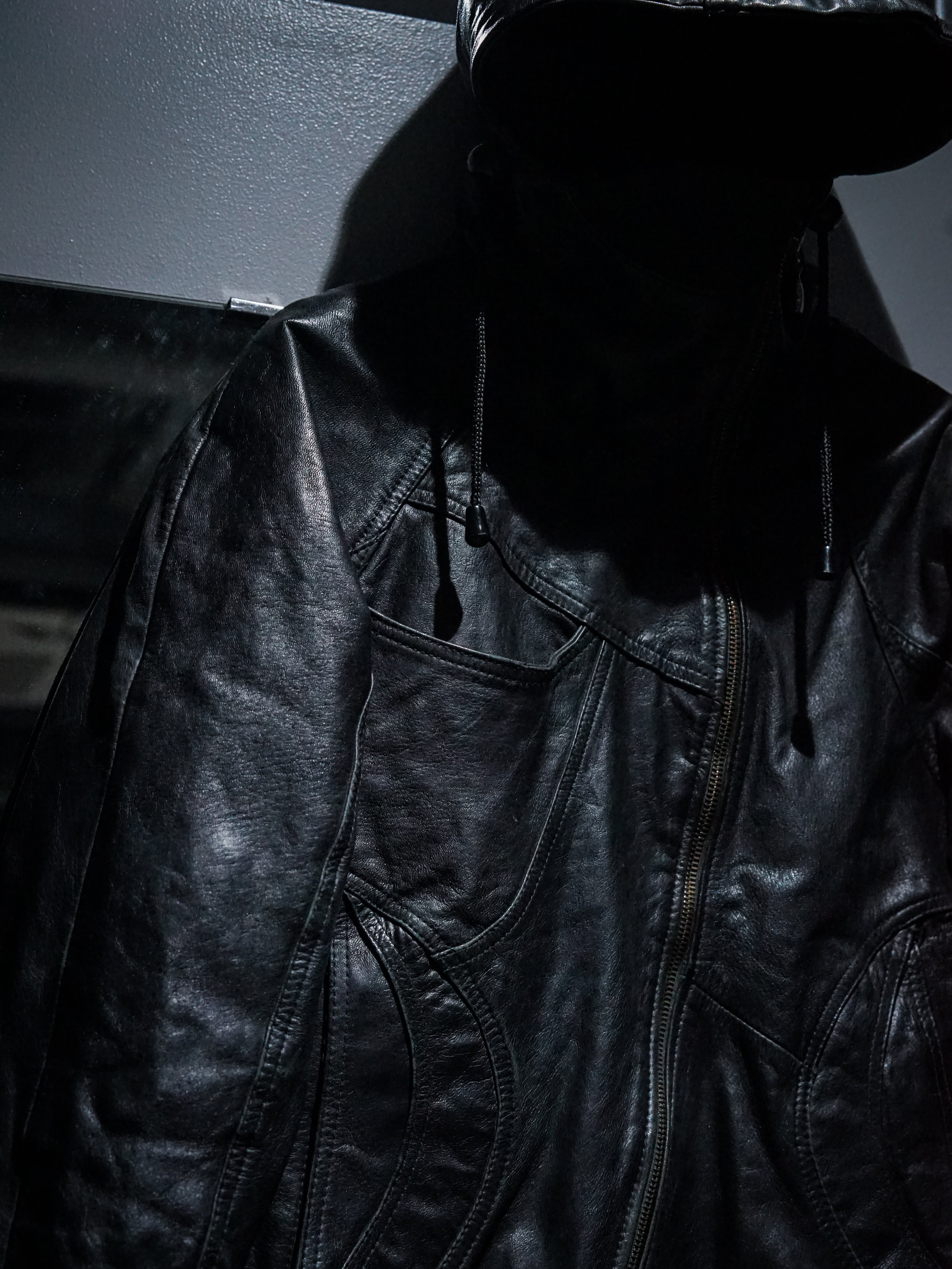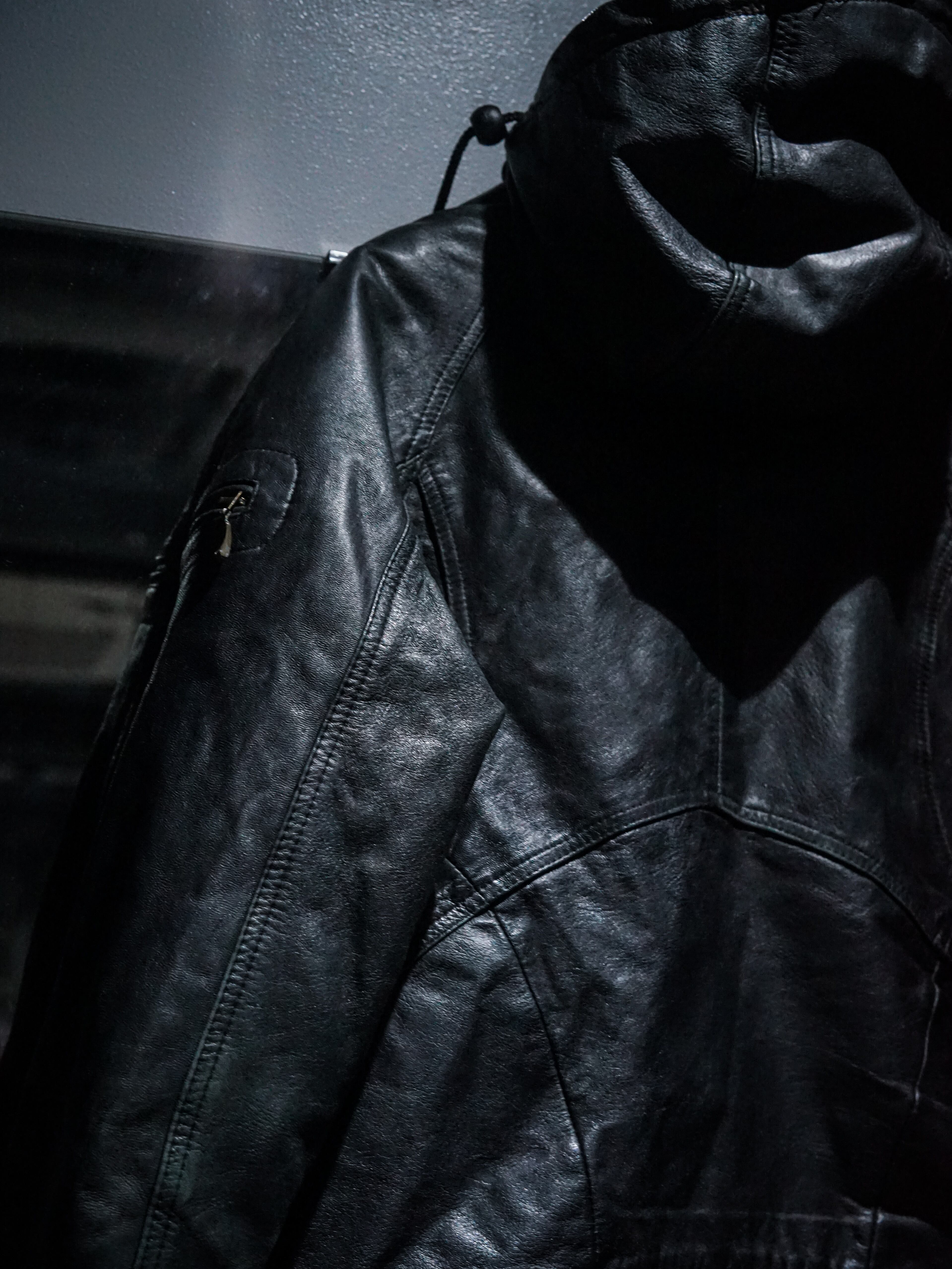 ガシッとハリのある肉厚なブラックレザーを用いて、フロントに斜めに走る"変形"ジップをON。ボディをアシンメトリーに切り替え、随所にポケットを施したフーディのレザージャケット。