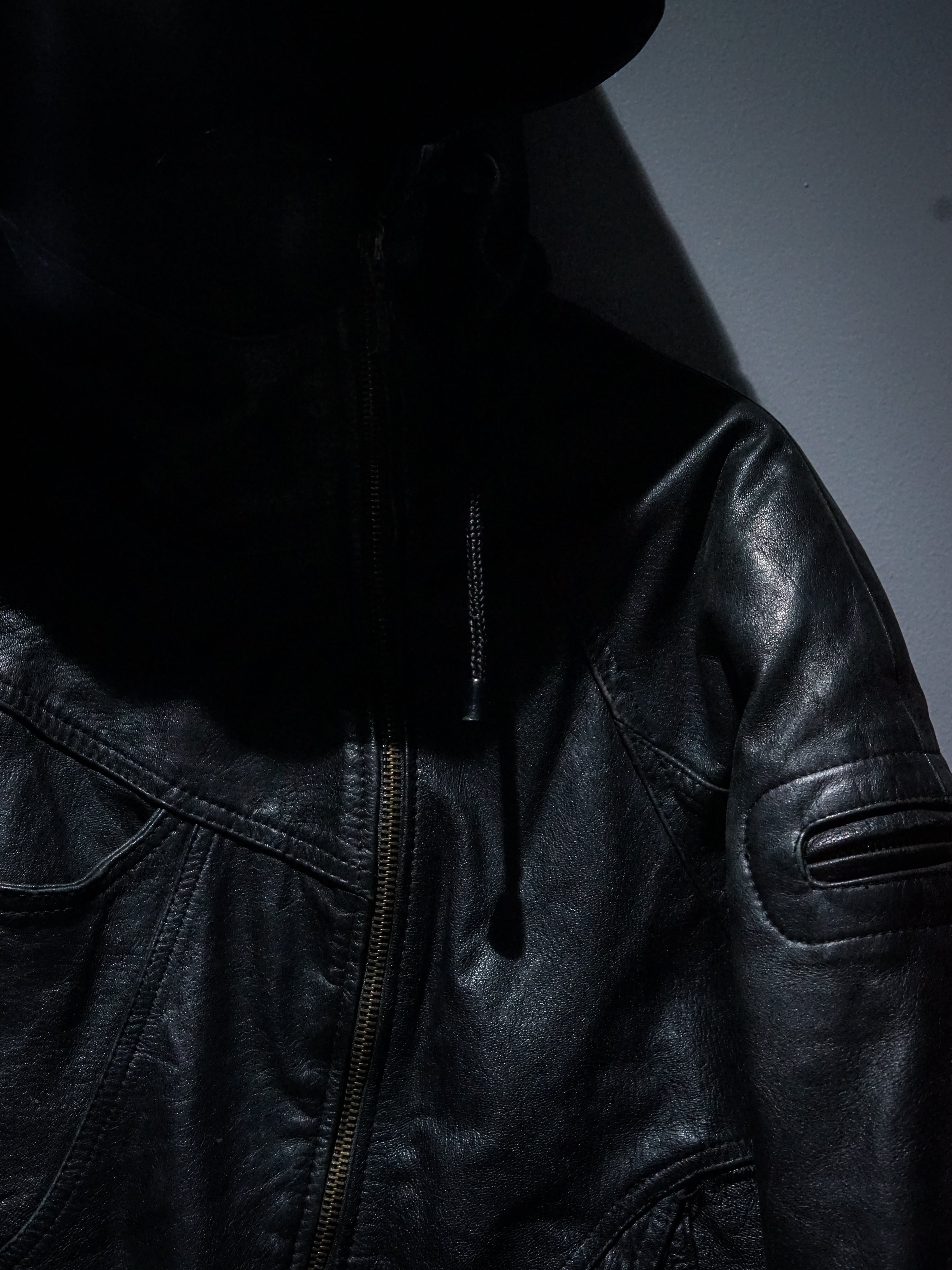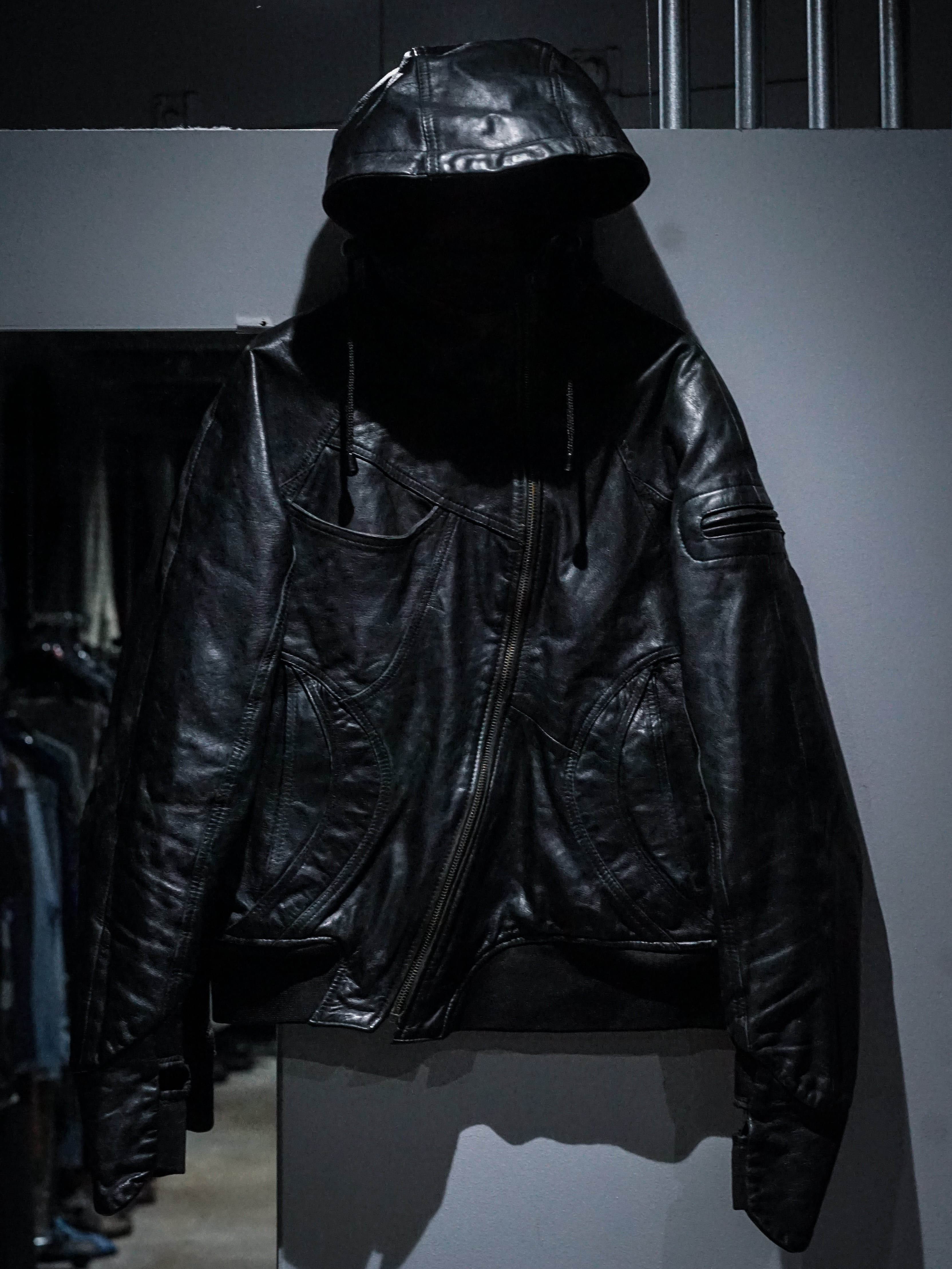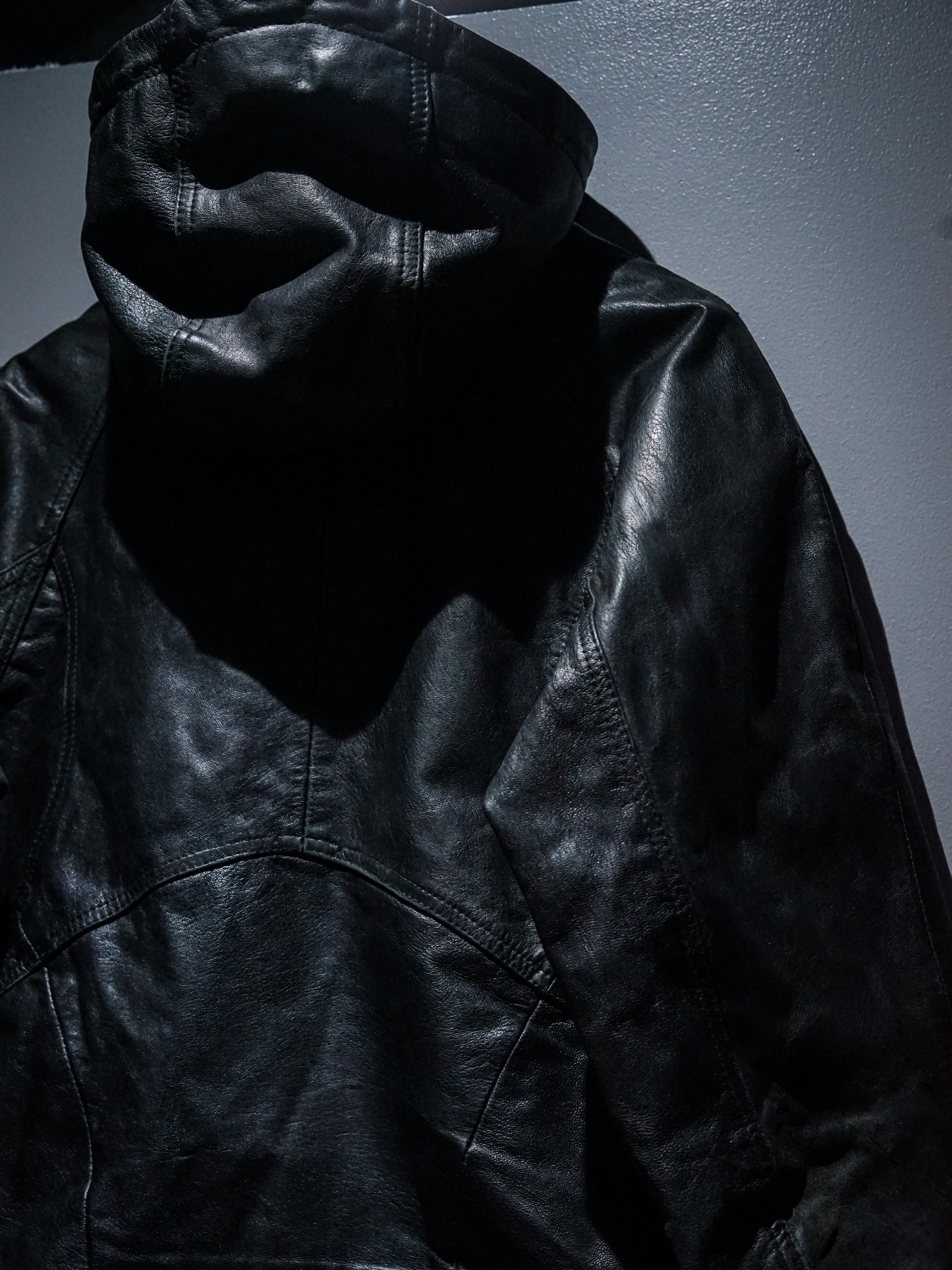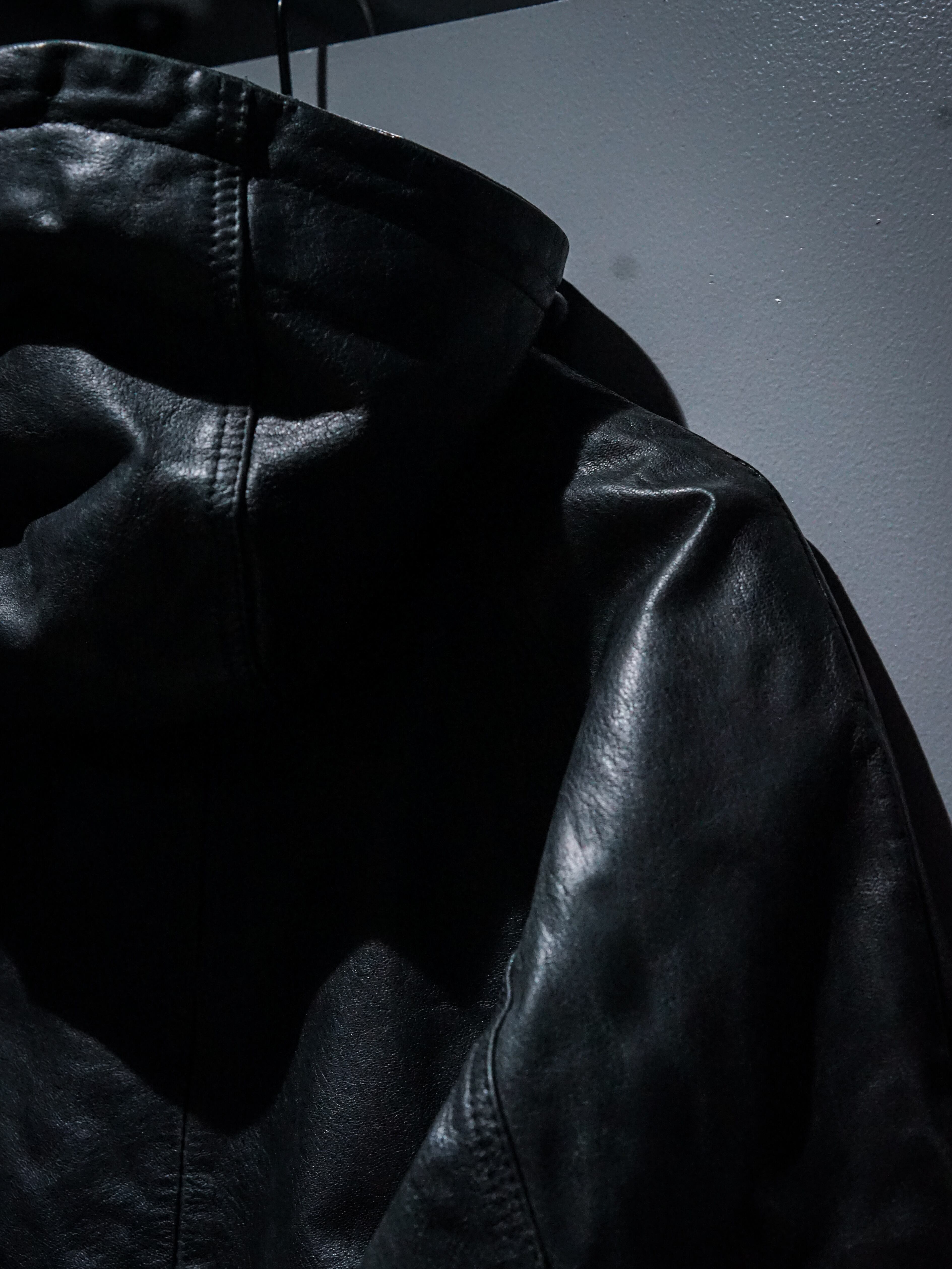 ガシッとハリのある肉厚なブラックレザーを用いて、フロントに斜めに走る"変形"ジップをON。ボディをアシンメトリーに切り替え、随所にポケットを施したフーディのレザージャケット。