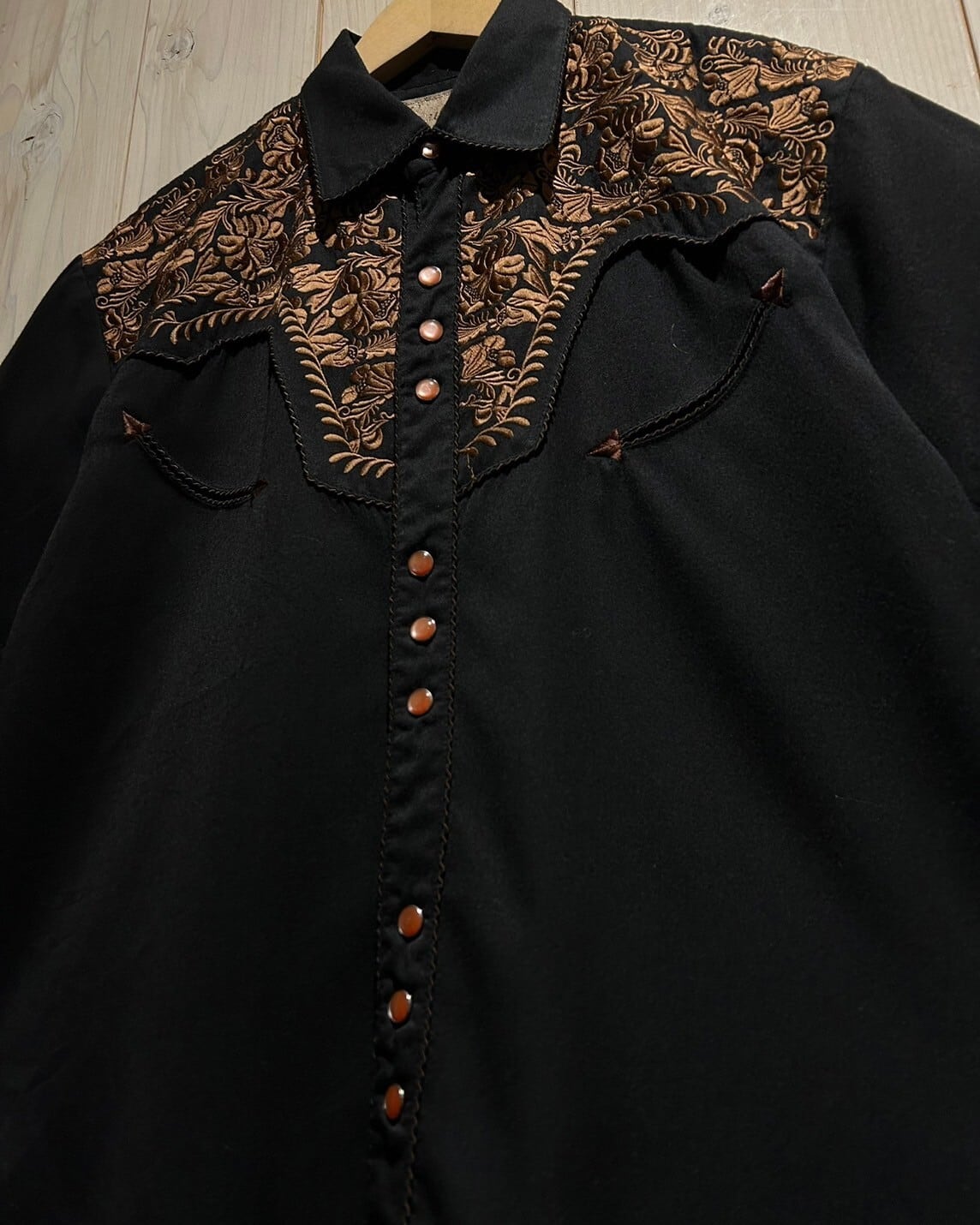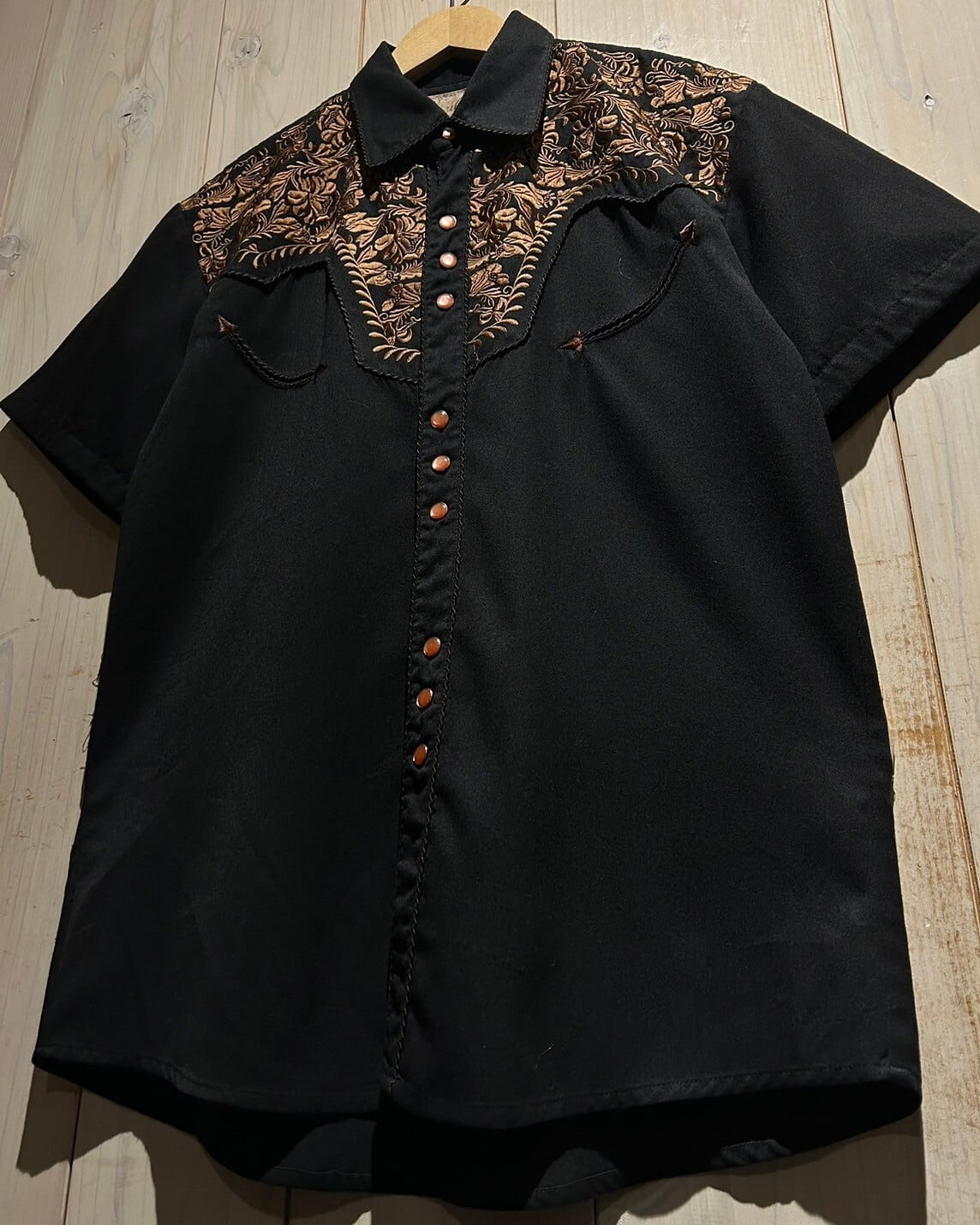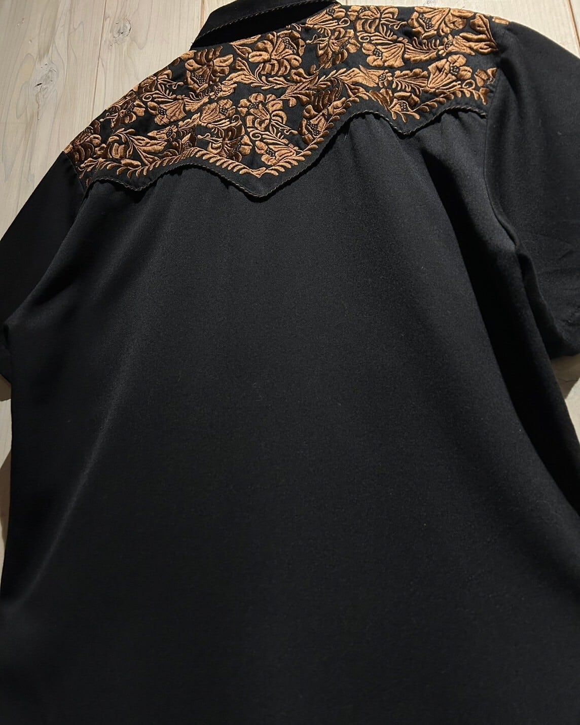 柔らかく、滑らかな質感と丈夫なタフさを兼ね備えるブラックボディに、フロント、バックのヨーク、袖部分までに、繊細な植物モチーフの刺繍を刻み込んだ稀有なウエスタンの半袖シャツ。
