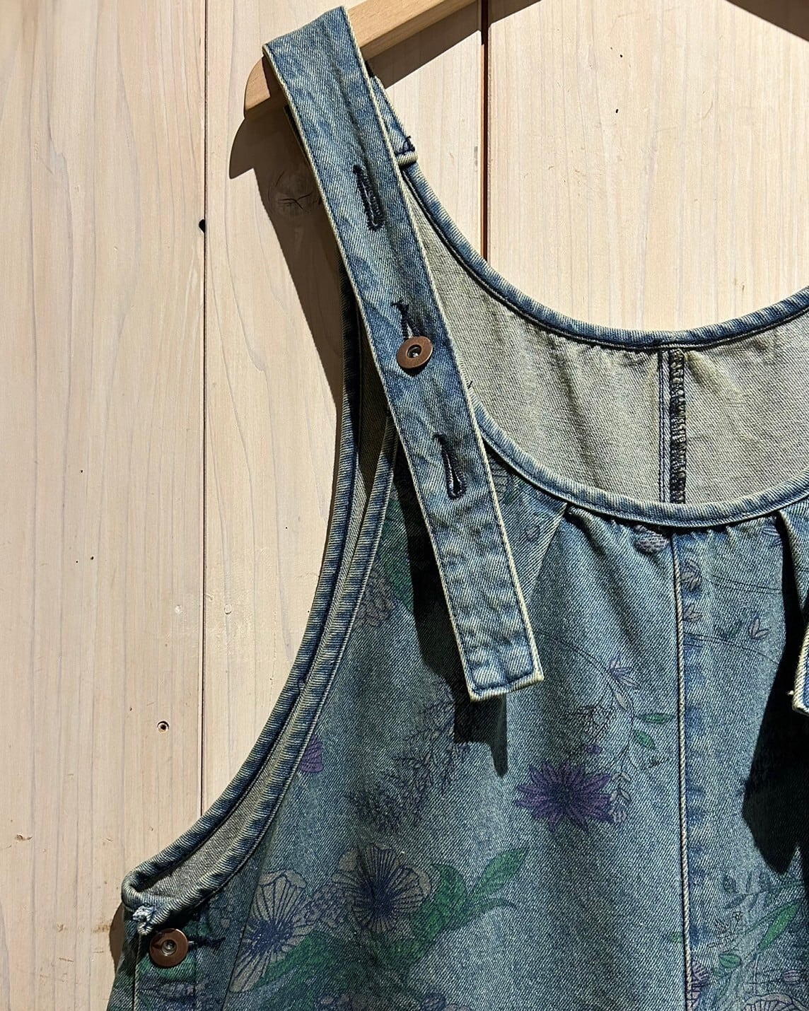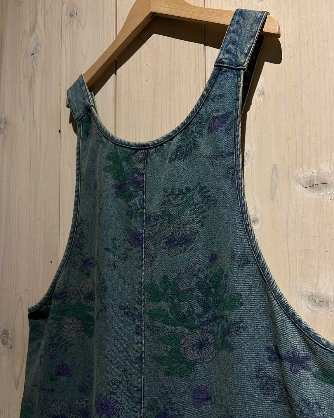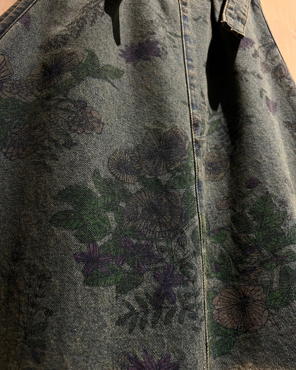 アタリの効いたデニムのボディに、繊細な花のプリントを載せたオーバーオール。