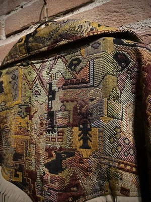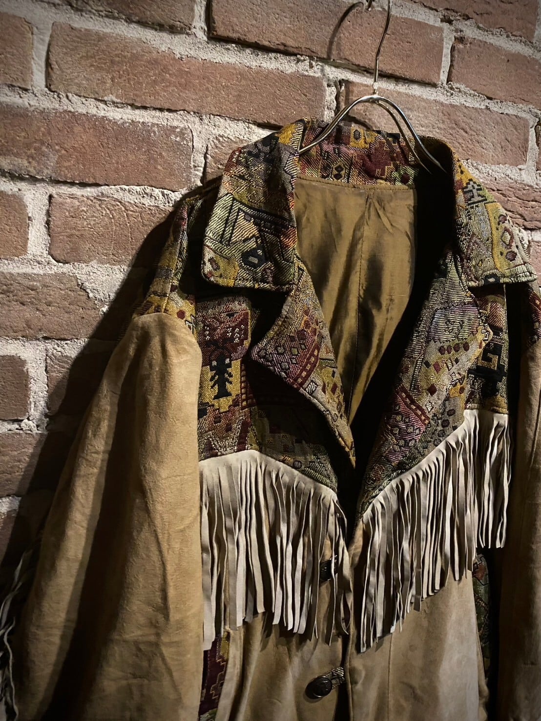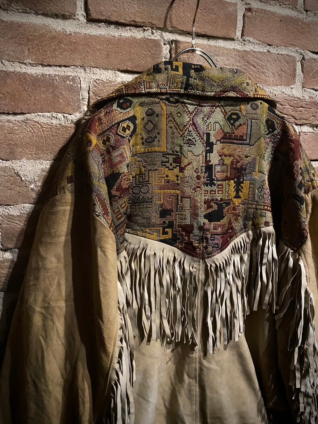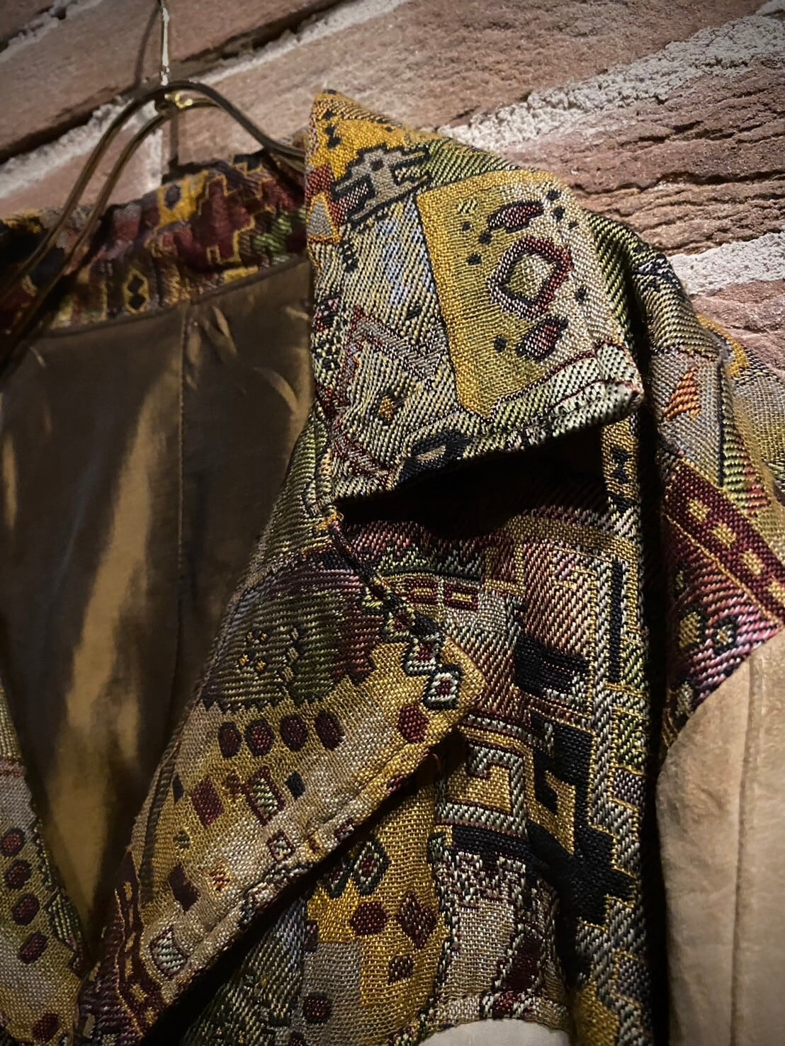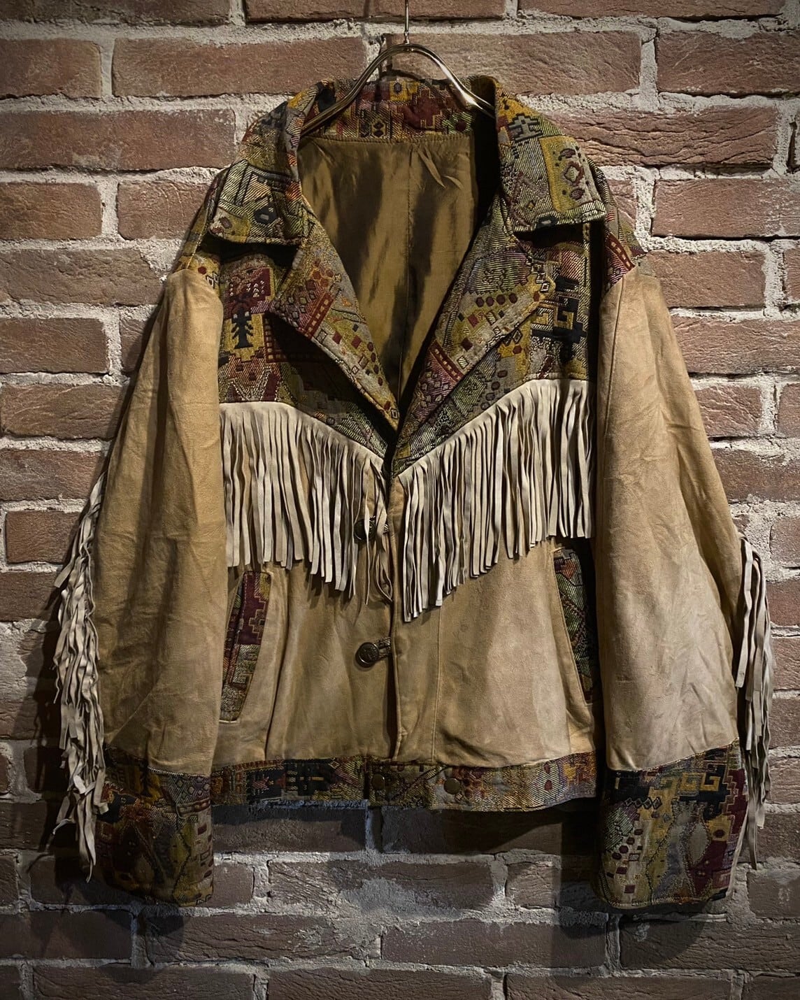 しっとりと柔らかなベージュのレザーを用いたボディに、エスニックな柄模様を表現したゴブラン生地をヨーク、襟、裾、ポケット口に切り替えたジャケット。