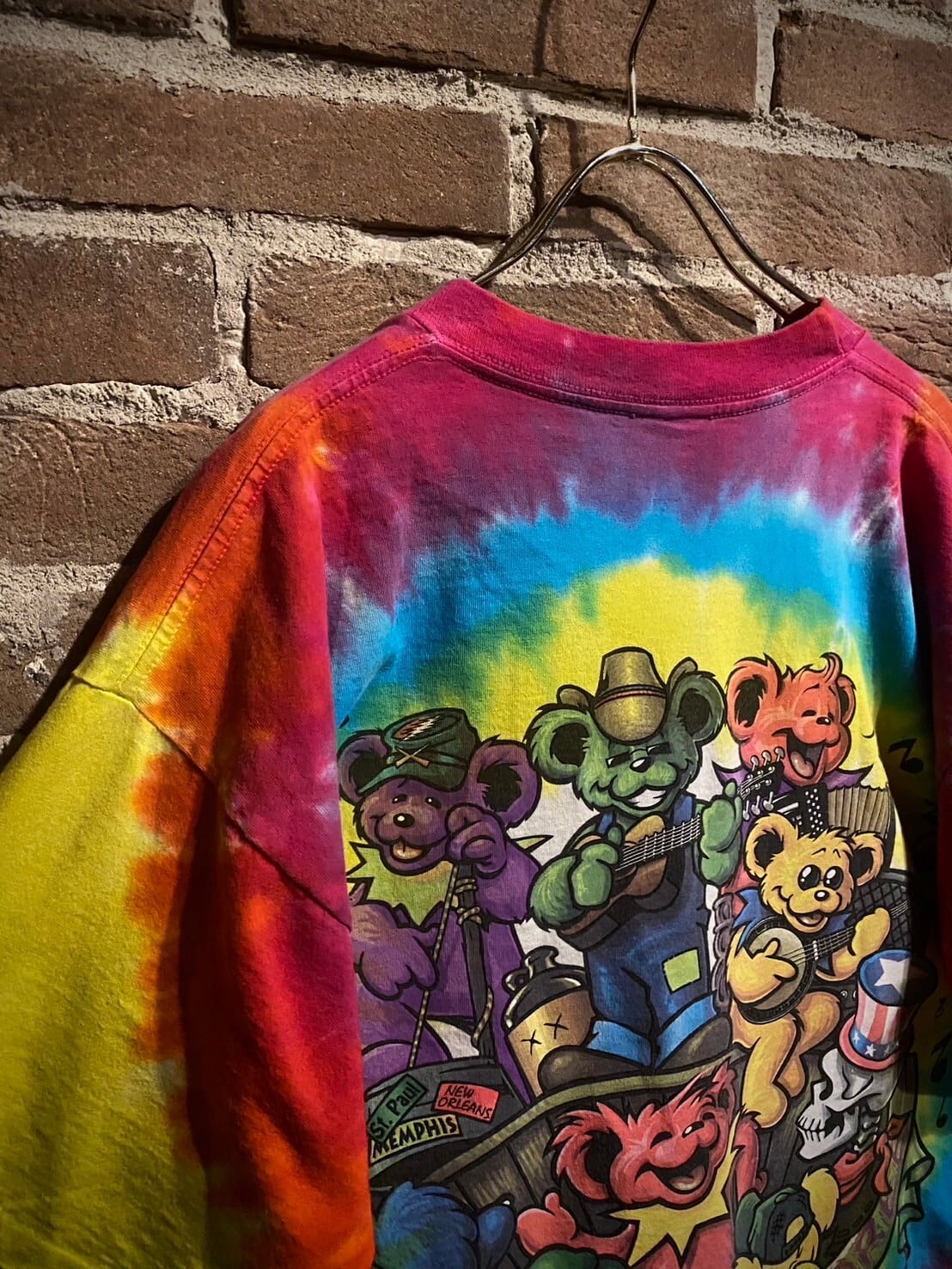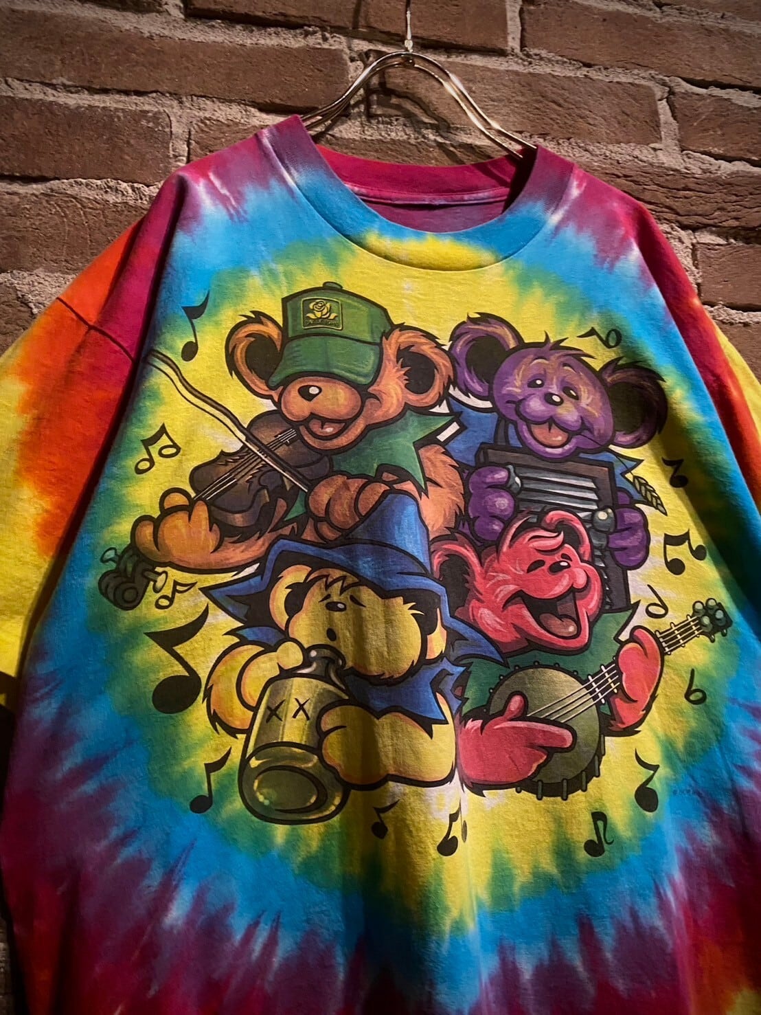 サイケデリックなタイダイ染めをベースとしたボディに、バンドのアイコン、"デッドベア"のプリントを載せた、シングルステッチの90'sのTシャツ。
