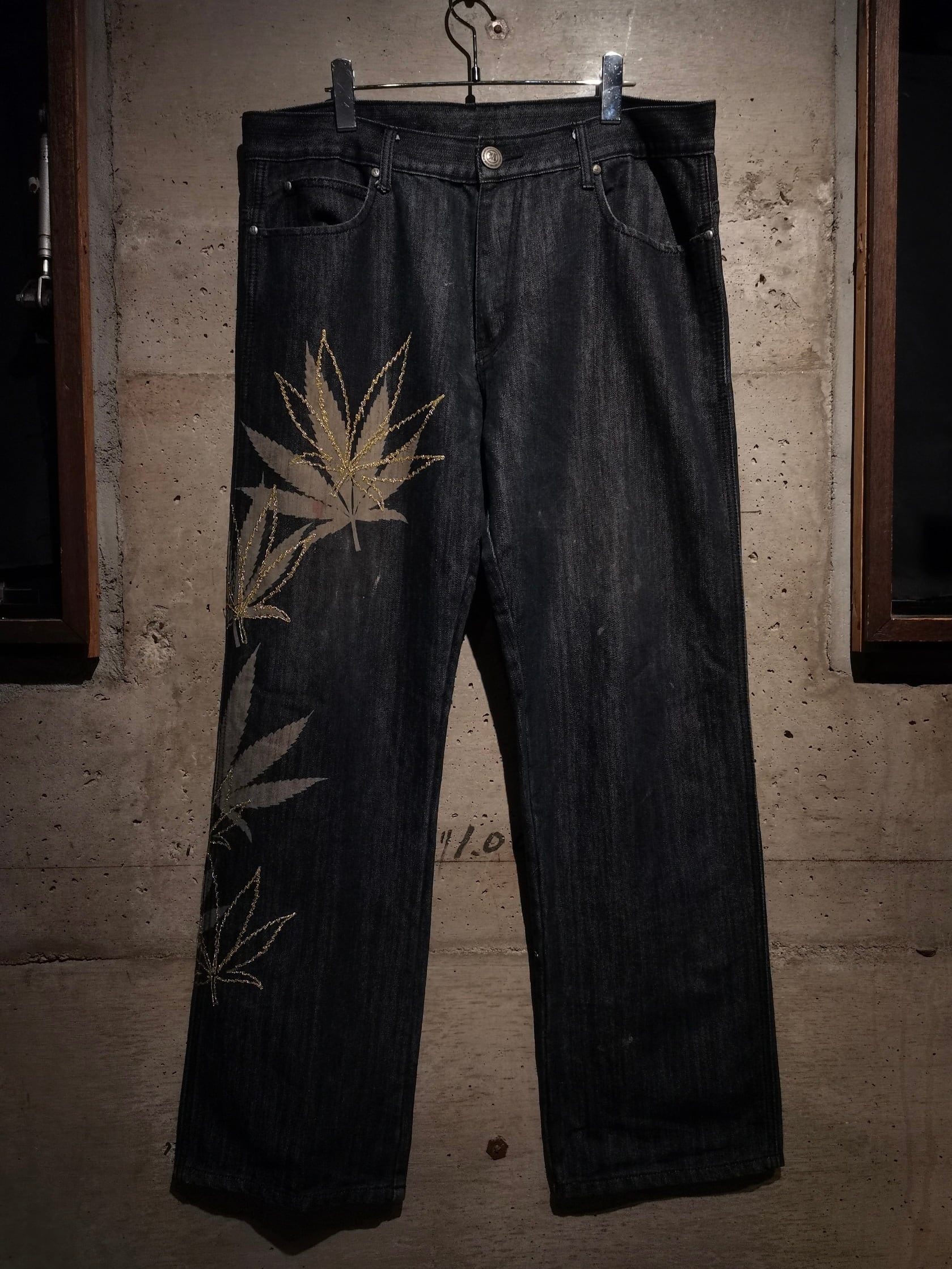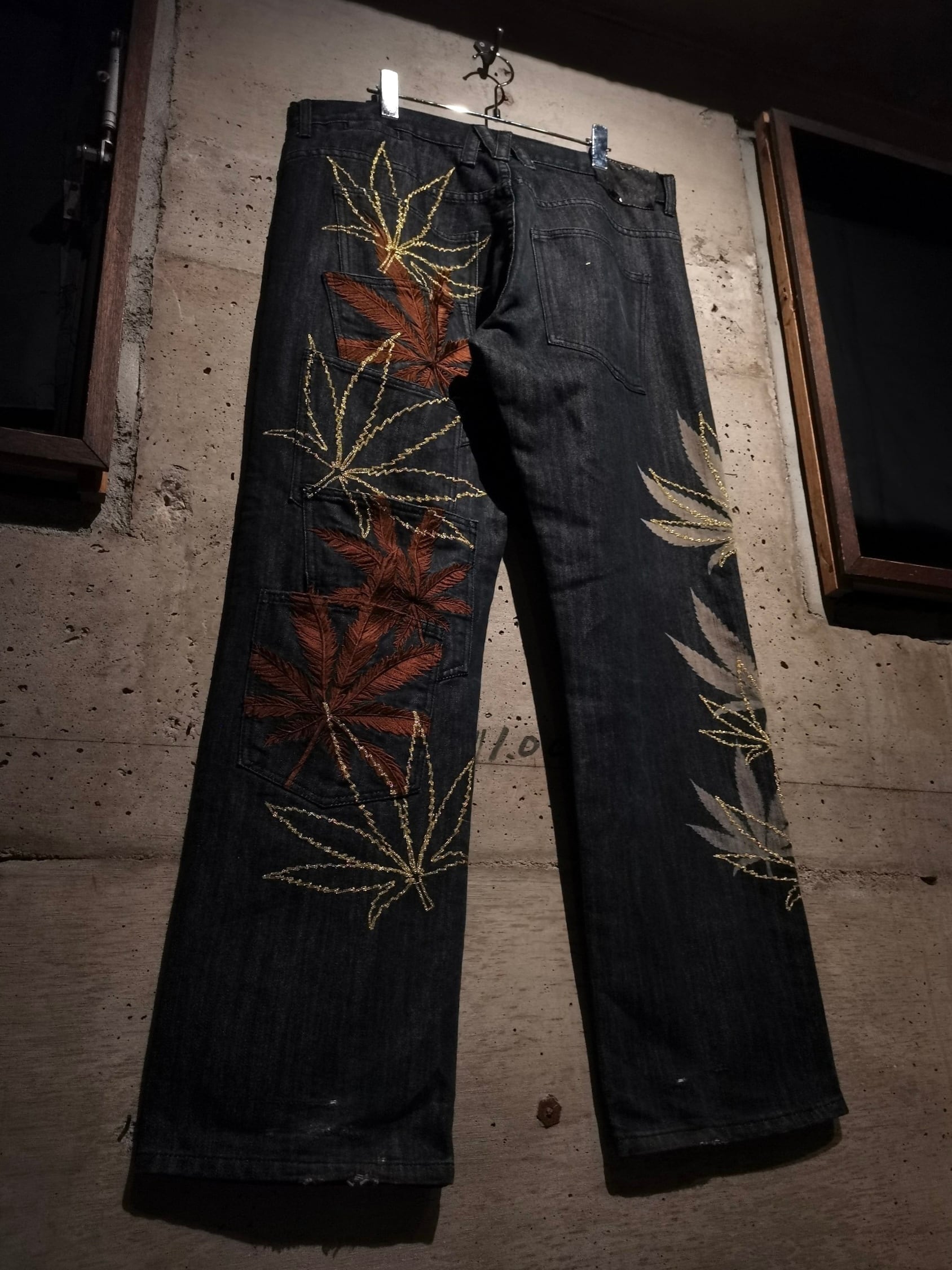 フェードしたブラックのボディに、ガンジャを刺繍で刻んだ、カルチャーをヒシヒシと感じられるバギーデニムをご紹介致します。