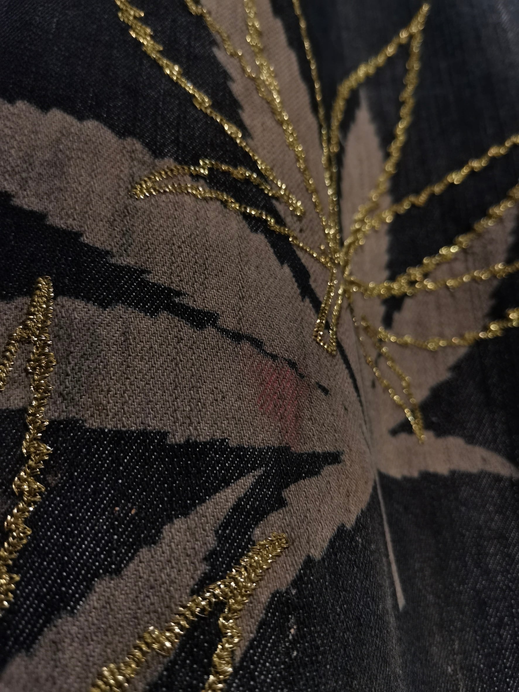 右足前、バックポケットを重ねたような左足後にプリントと刺繍で大胆にガンジャをON。ゴールドの糸や光沢のある糸での刺繍、そしてプリントと2種類の方法を用いてデザインしたことで立体感のある仕上がりに。